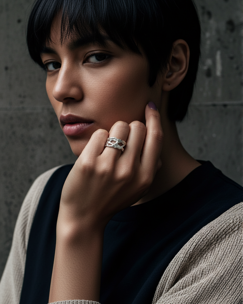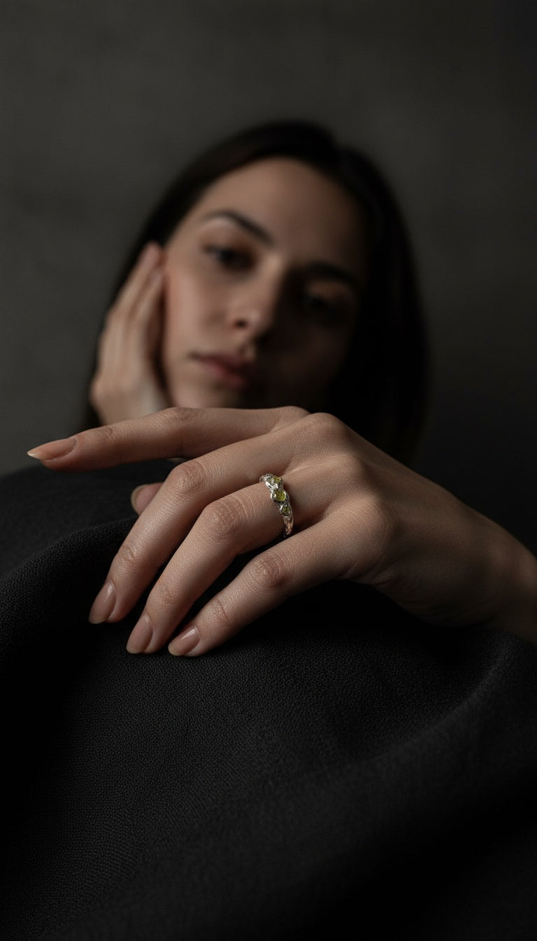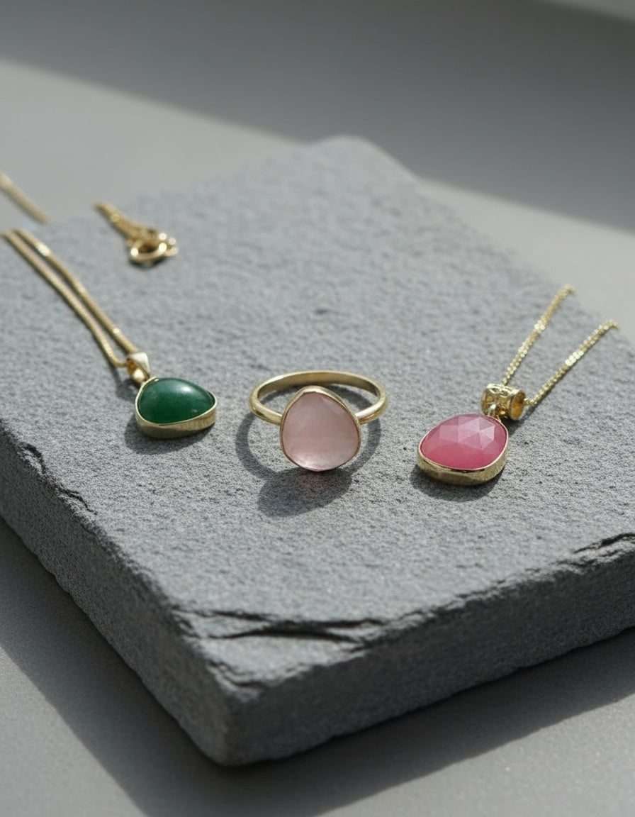 Solid silver and gold, raw and honest. Each gemstone chosen for its depth, not perfection.
