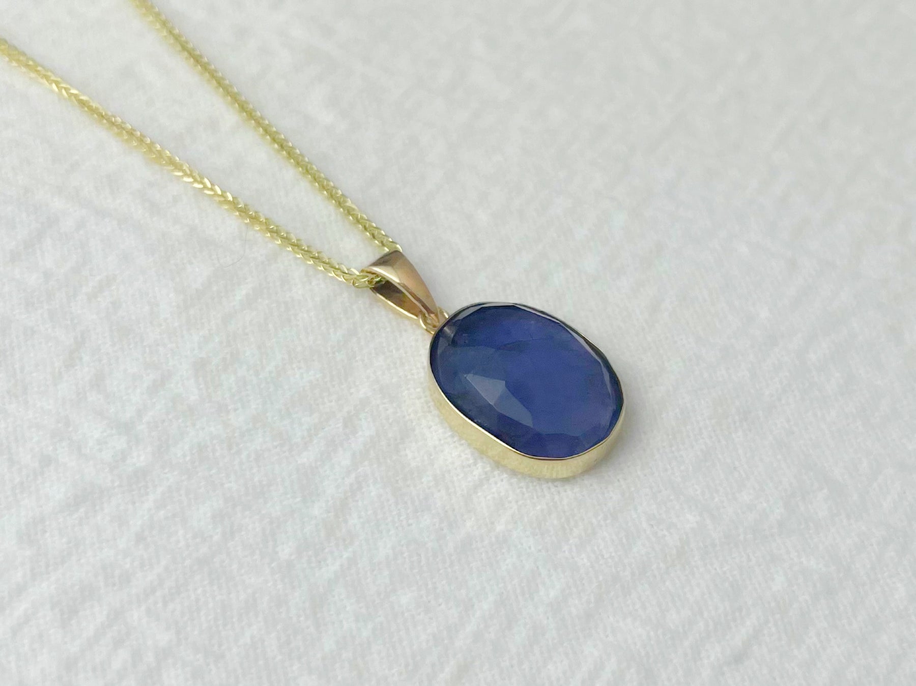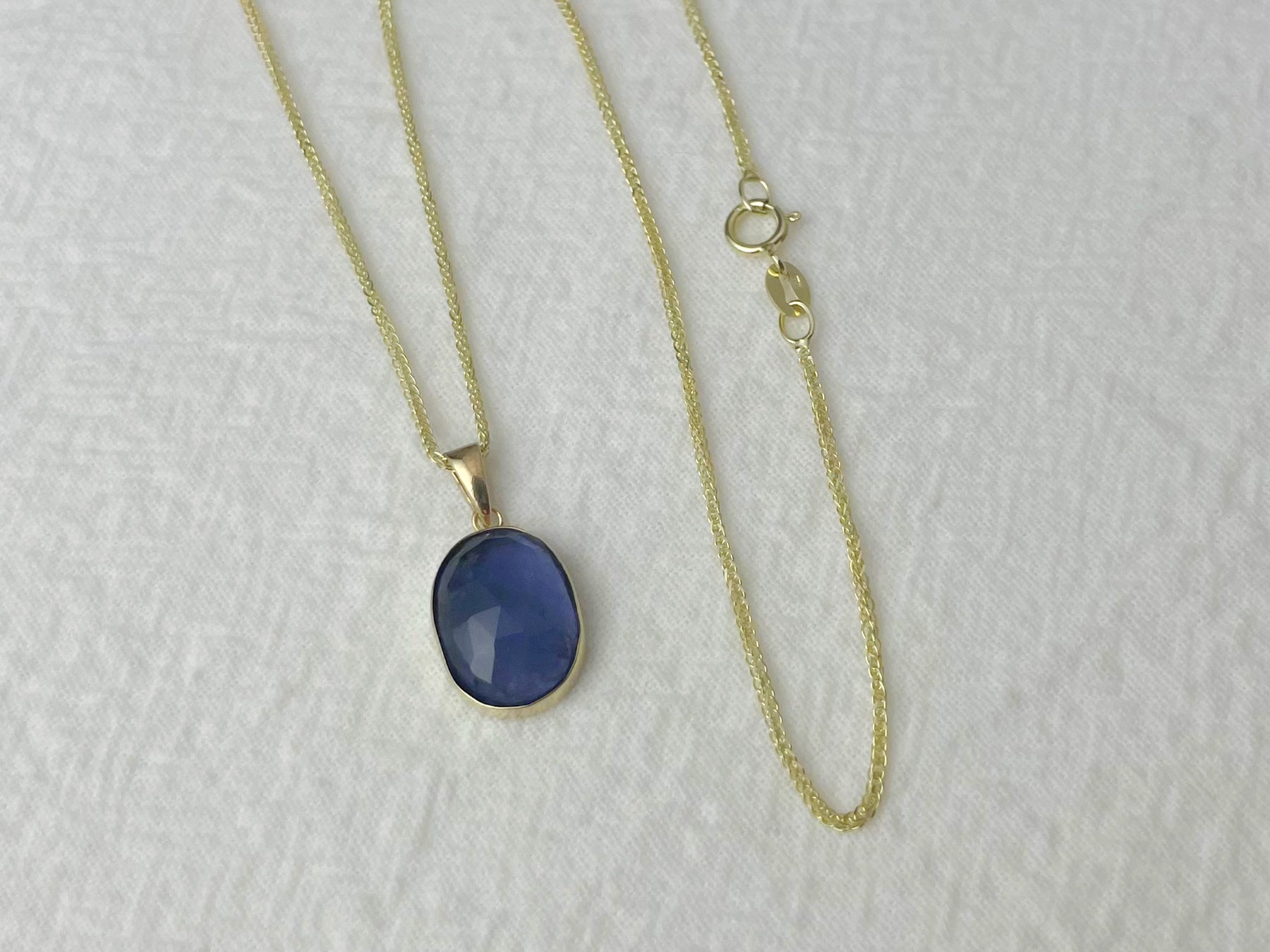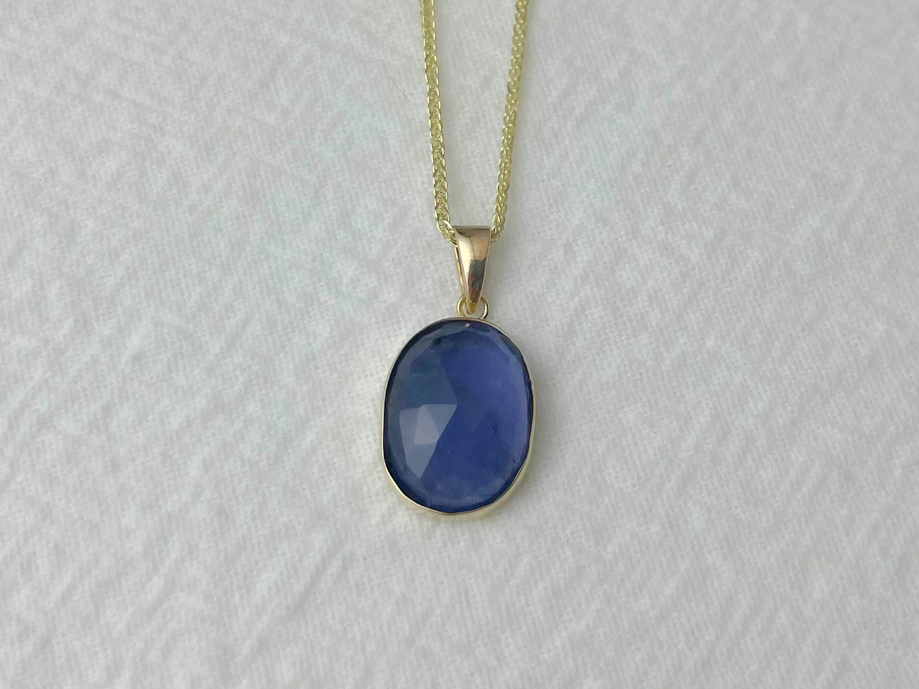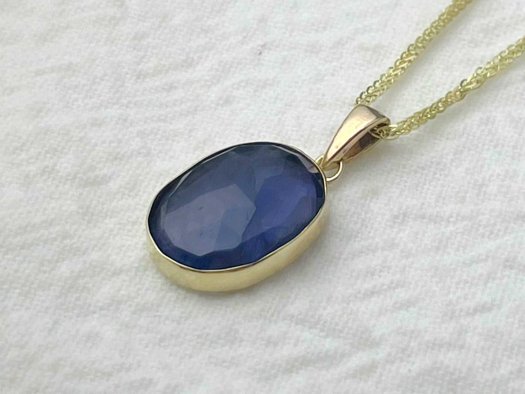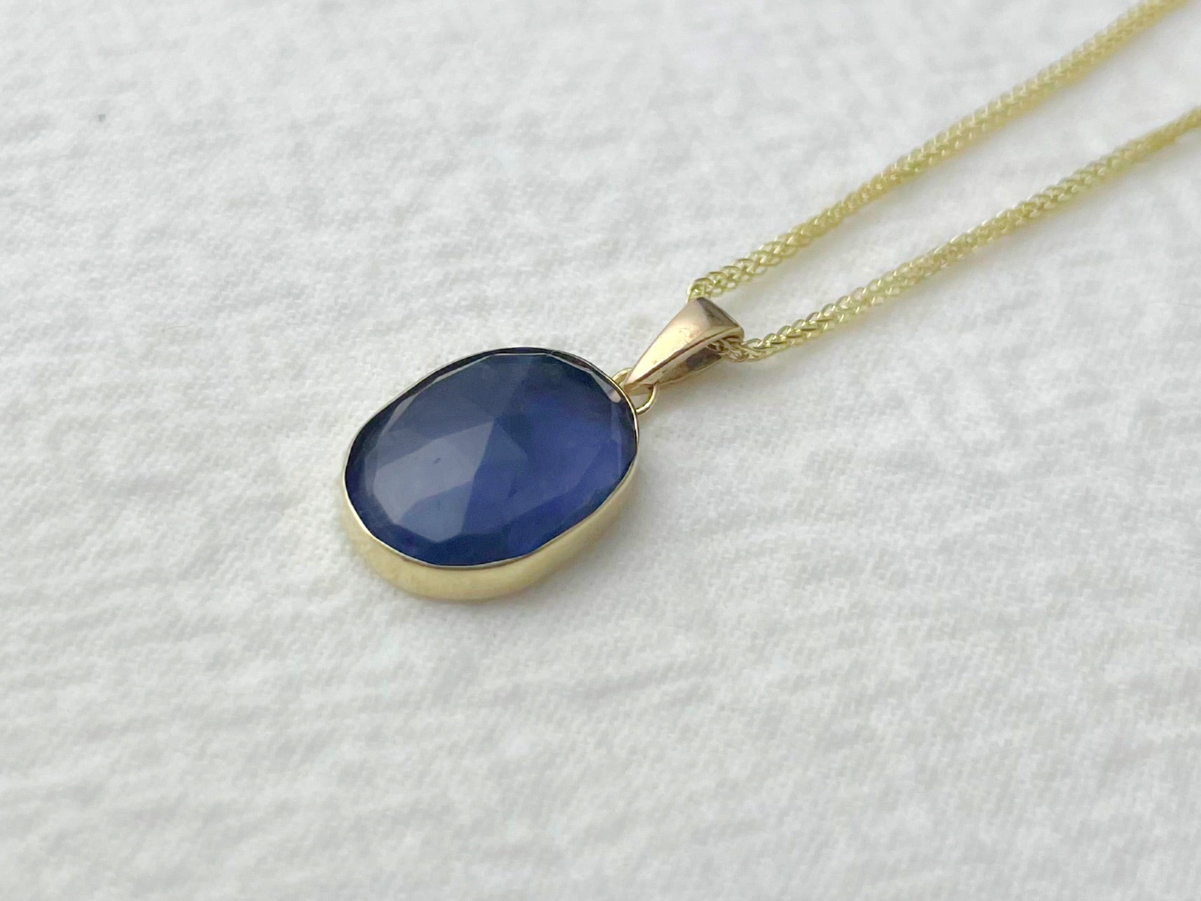 A 10x14mm rose-cut iolite rests in a warm 14k gold bezel, its deep blue-violet tones shifting subtly with the light — sometimes ocean, sometimes nightfall.