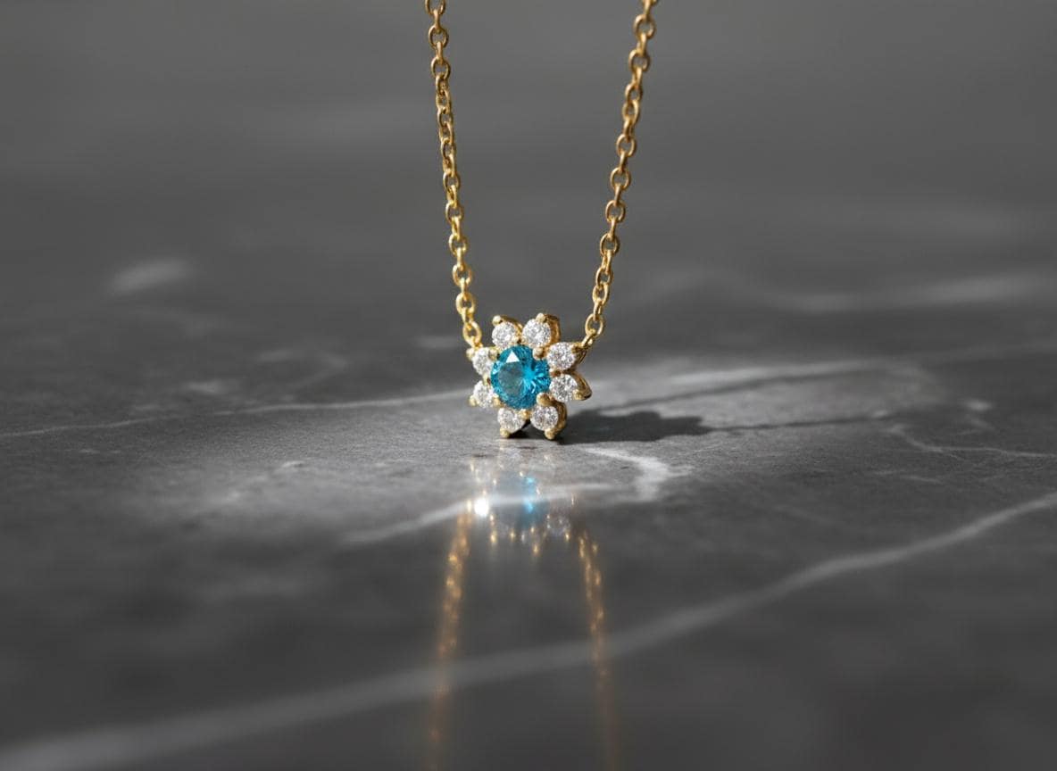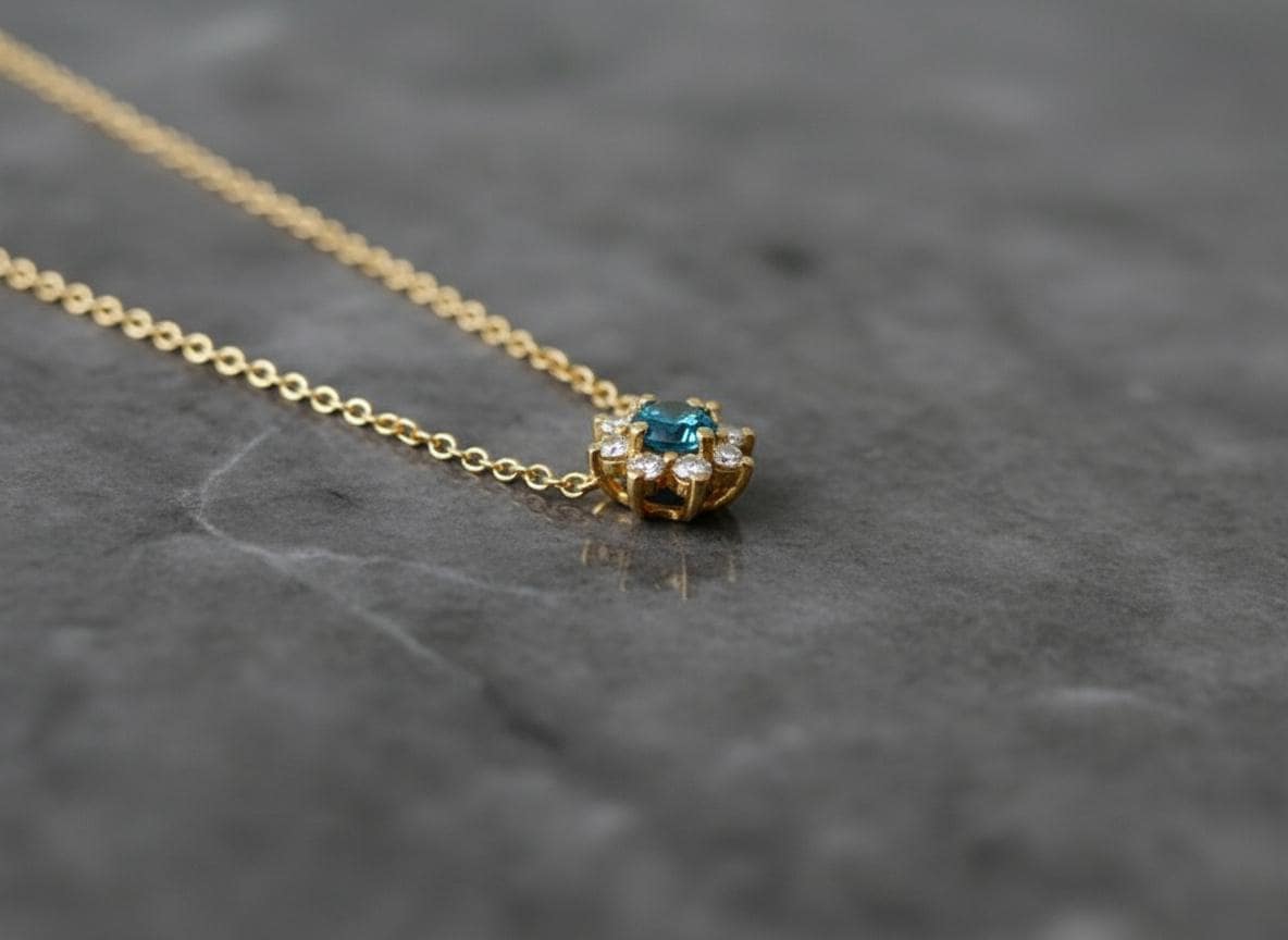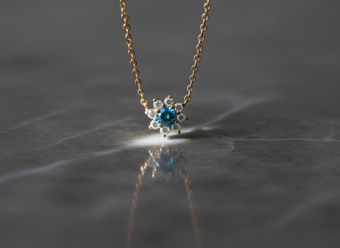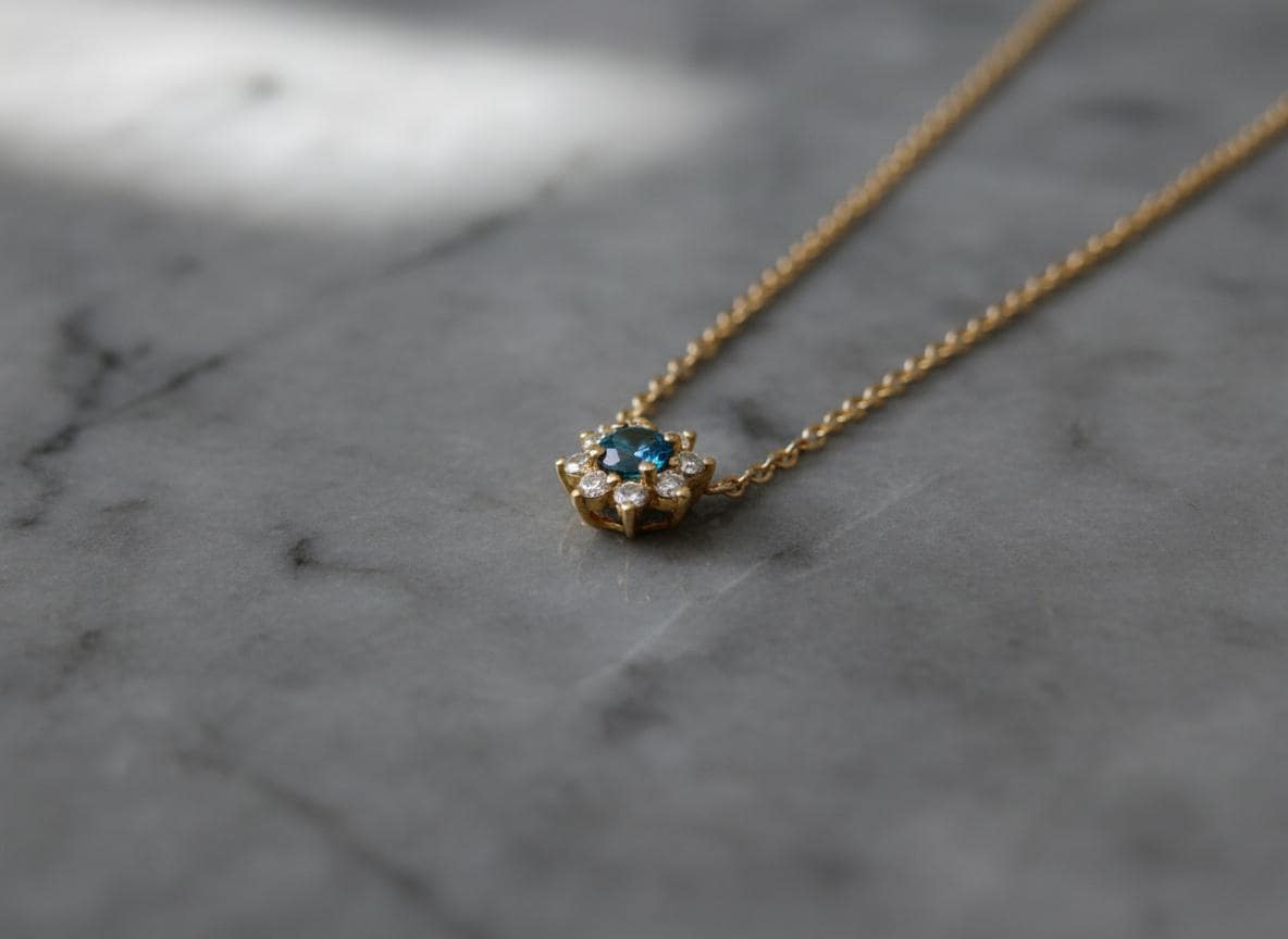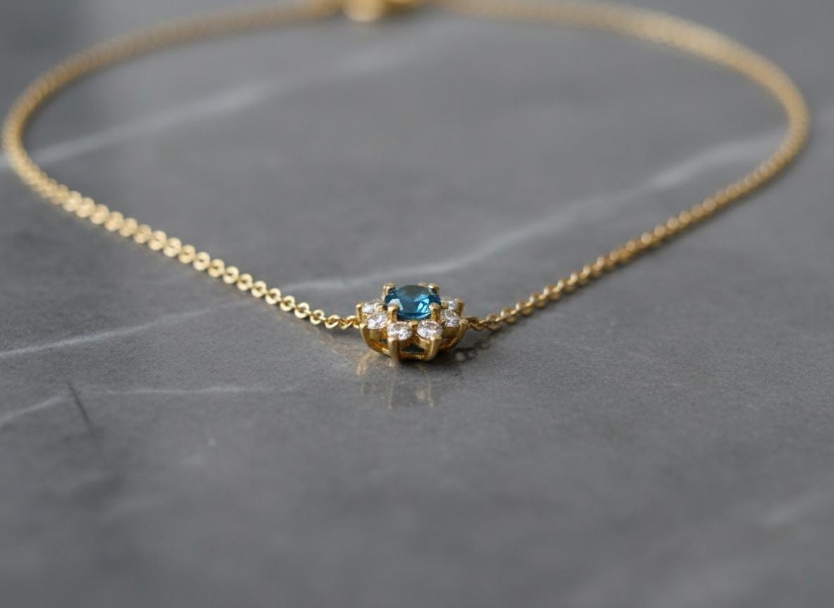 A captivating 14k solid gold necklace featuring a vivid 3.8mm London blue topaz encircled by sparkling white diamond petals for a timeless floral design. An additional bezel-set white diamond is placed on the delicate gold chain, adding a modern, romantic touch. The diamonds, totaling .19 carats, are meticulously set to catch the light beautifully. This elegant piece makes a perfect anniversary gift, bridal jewelry, or December birthstone necklace.