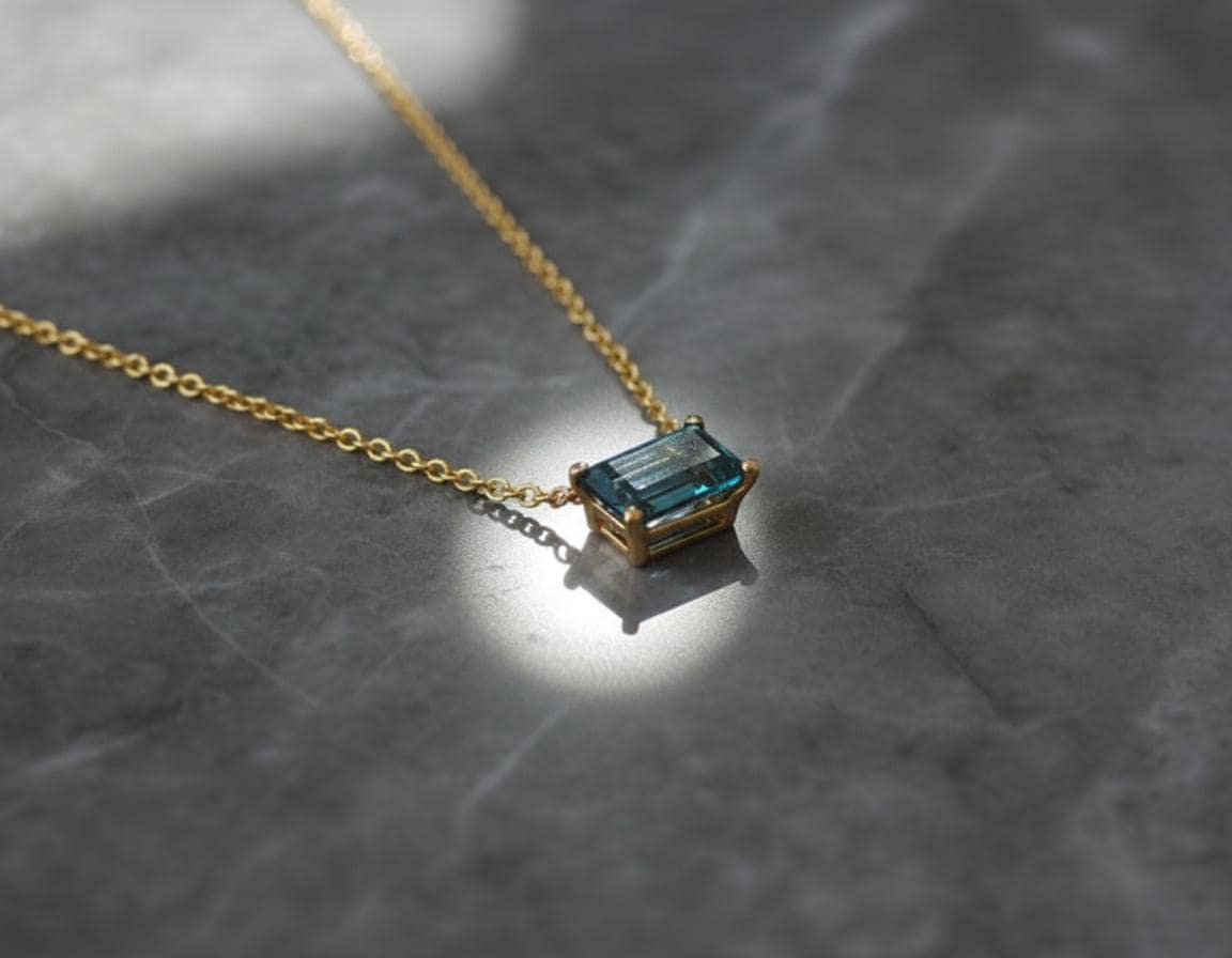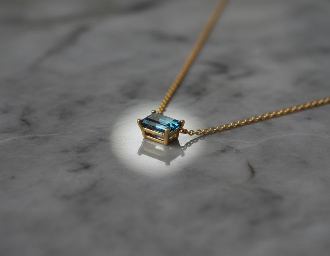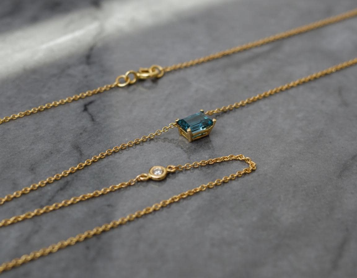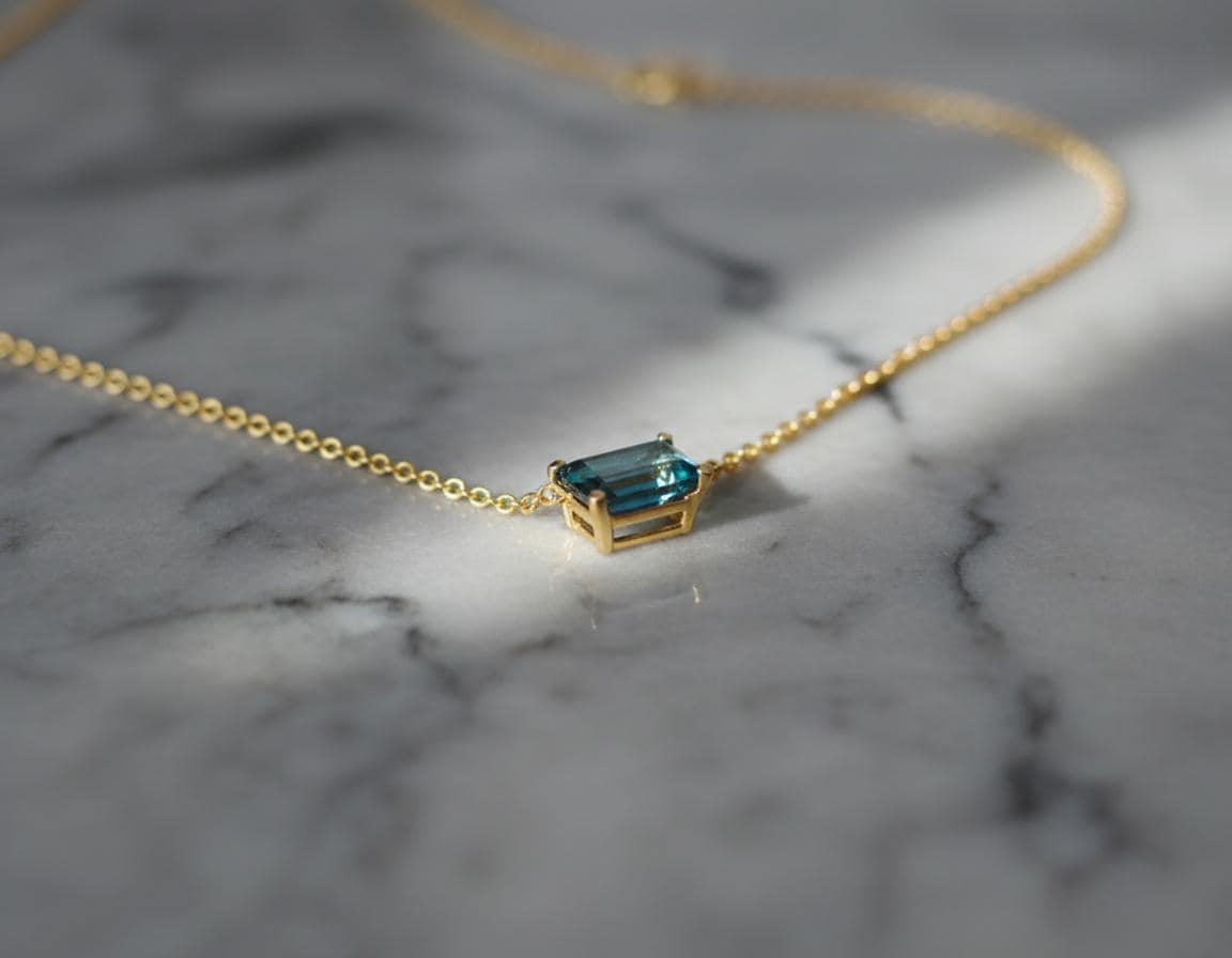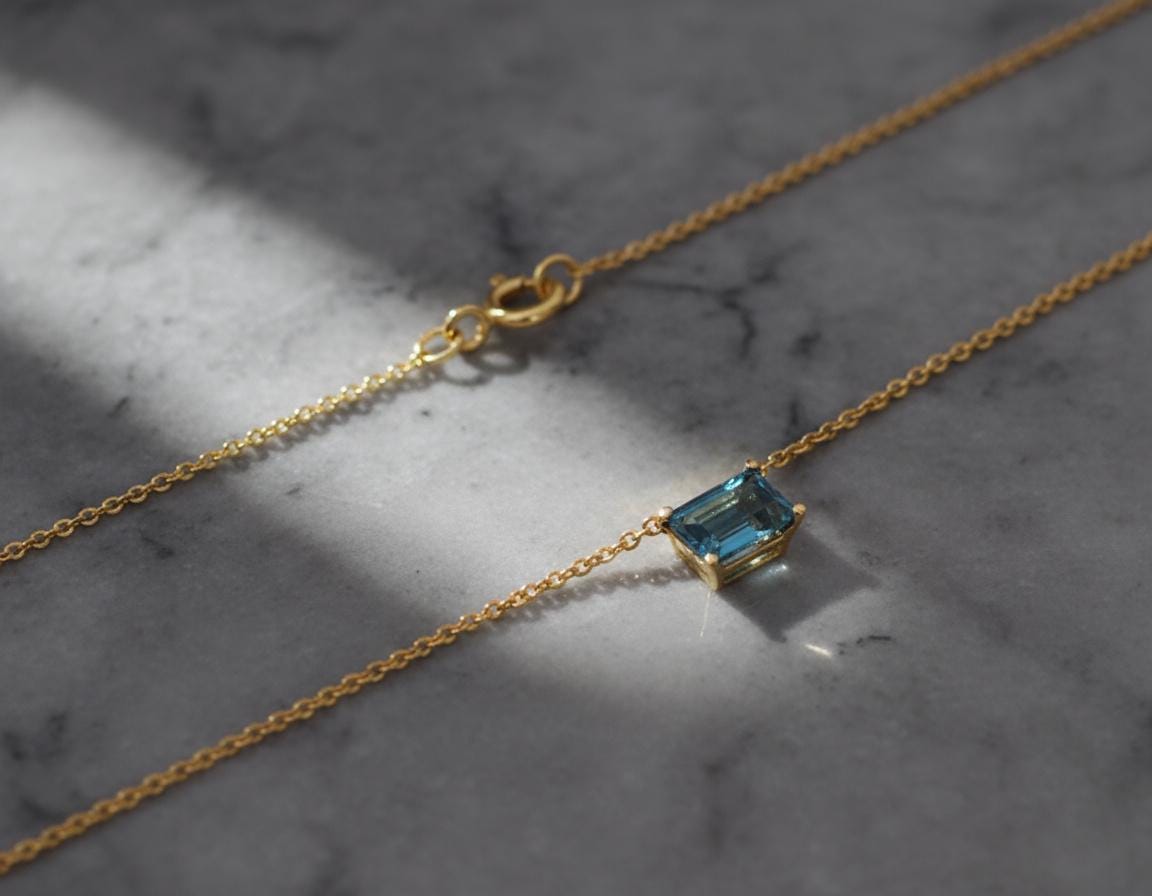 A brilliant pop of deep ocean blue, this 14K yellow gold necklace features a 5×7 mm emerald-cut London blue topaz prong-set between delicate chain links, accented by a single 2 mm SI-clarity diamond for an extra sparkle. Suspended on a fine 45 cm solid gold chain, it sits gracefully at collarbone height and layers beautifully with other pieces.