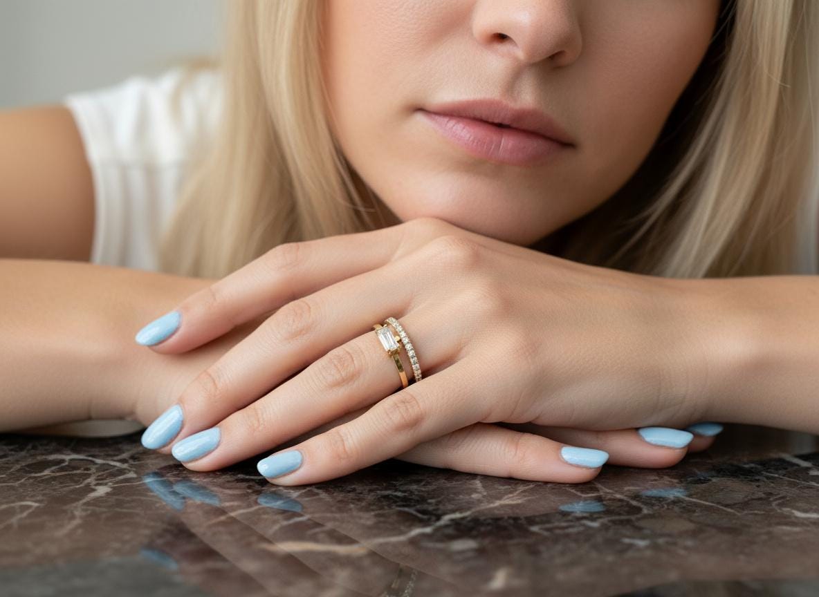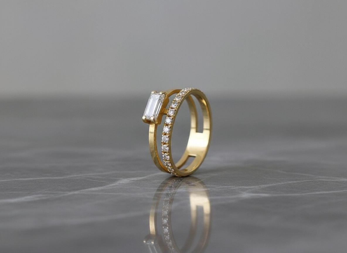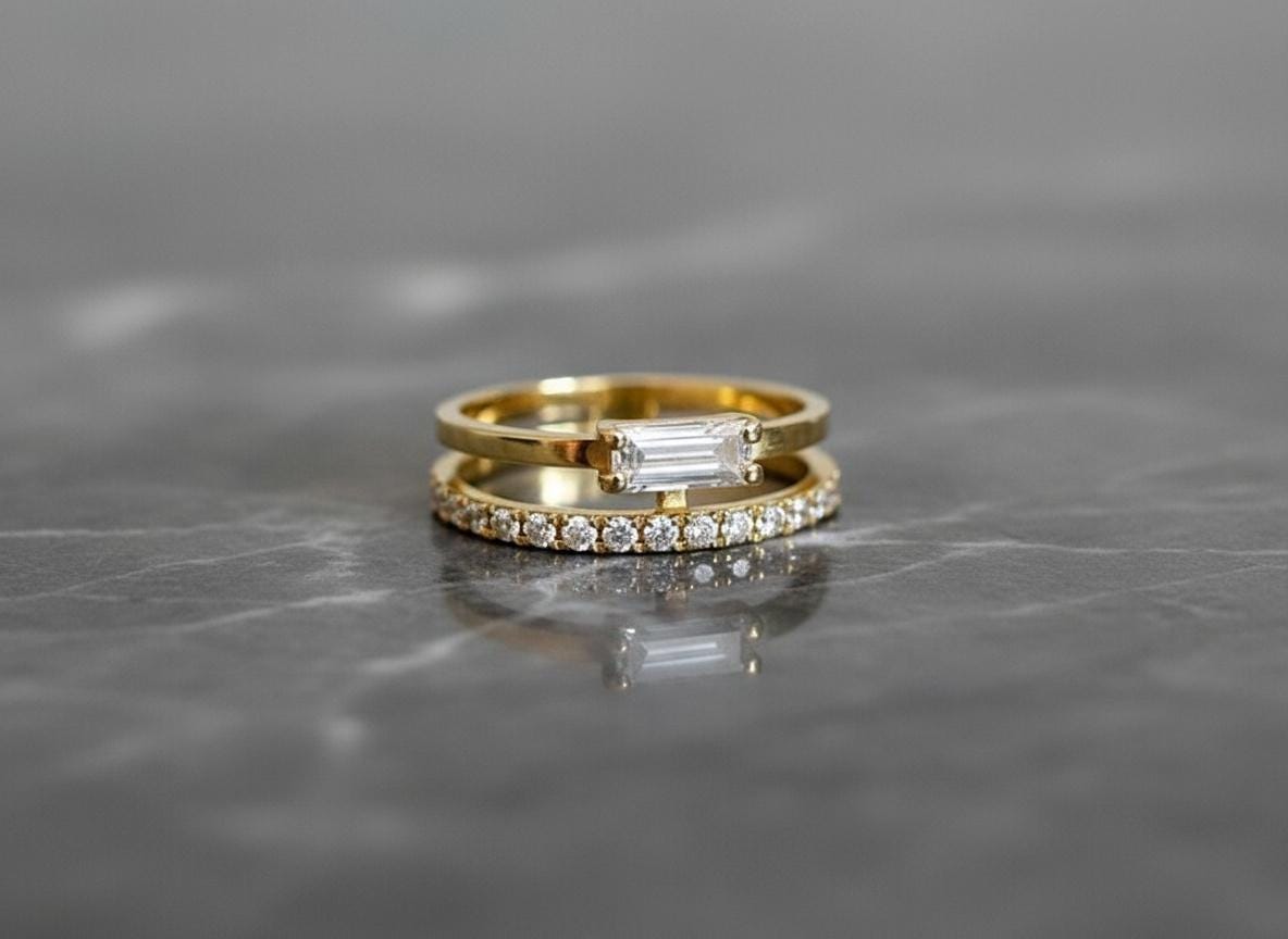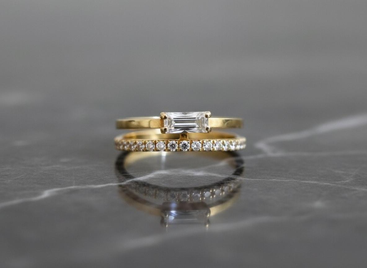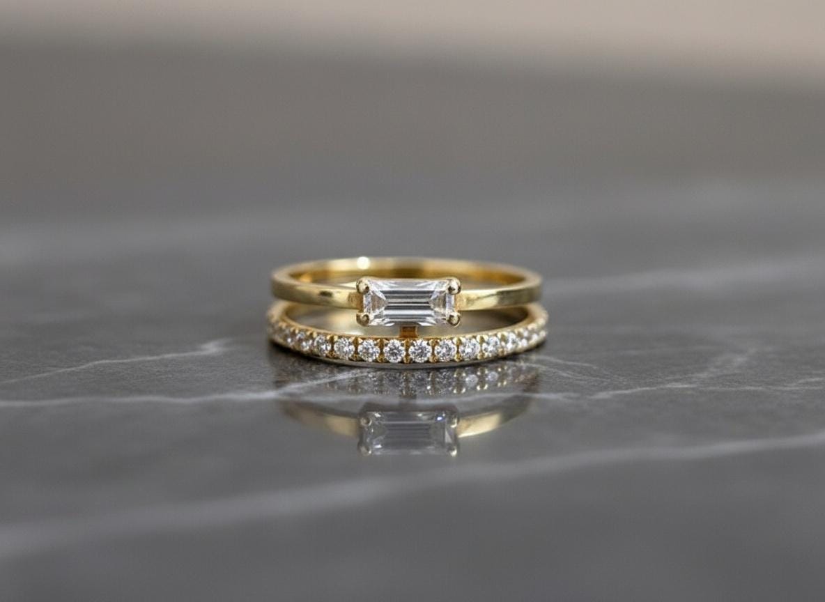 Baguette moissanite double engagement ring in 14K yellow gold.