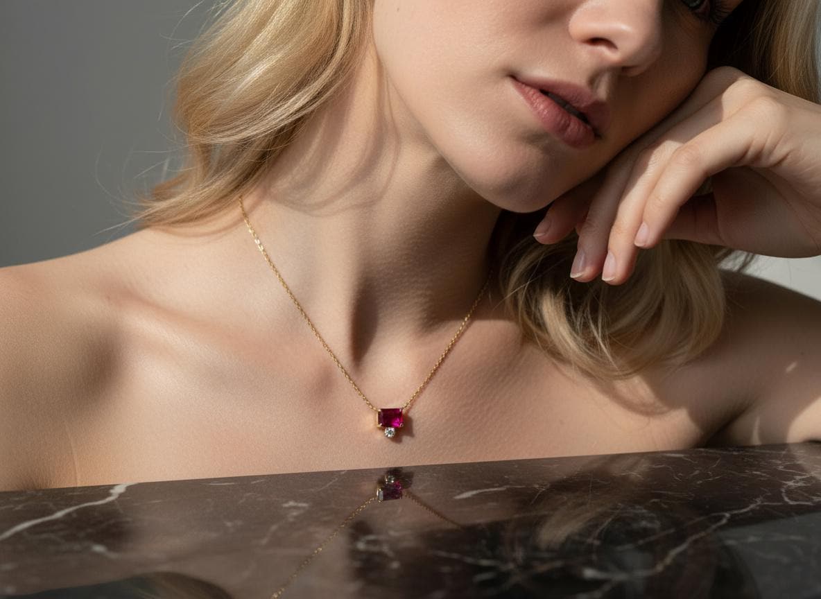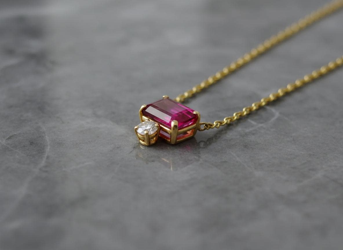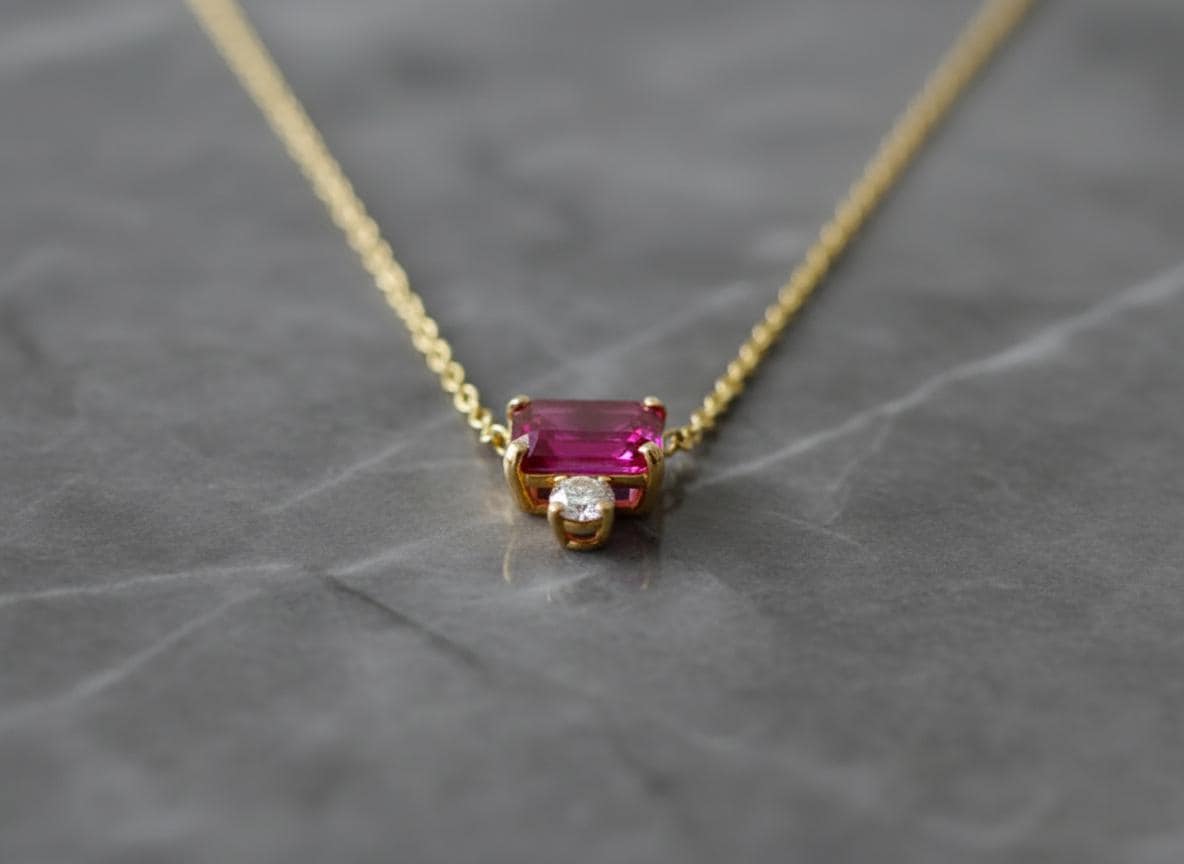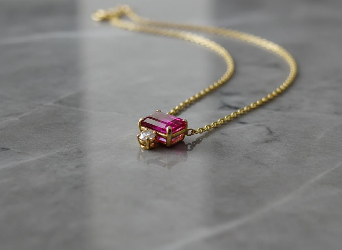 A perfect balance of bold color and sparkle. This elegant 14k gold necklace features a vibrant 9x11mm emerald-cut pink topaz paired with a brilliant 3mm moissanite. The two-stone pendant is set on a fine gold chain, combining warmth, color, and shine in a modern silhouette. A unique piece for everyday beauty or a heartfelt gift.