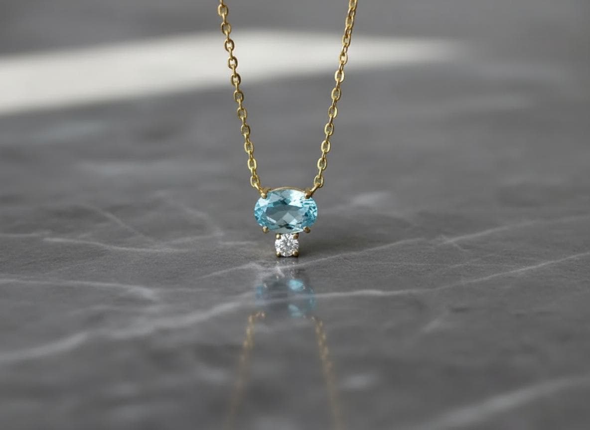 Elevate your jewelry collection with our enchanting 14k Gold Oval Aquamarine and Moissanite Necklace. This captivating piece features a stunning 6x8mm oval aquamarine stone, known for its serene blue hues and timeless appeal. Beneath the aquamarine, a brilliant 3mm moissanite is expertly set, adding an extra touch of sparkle and sophistication.