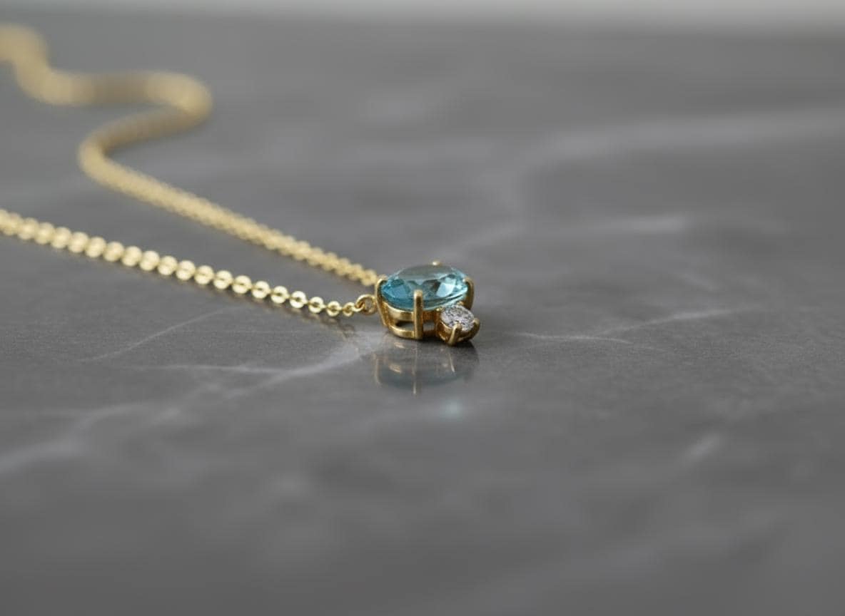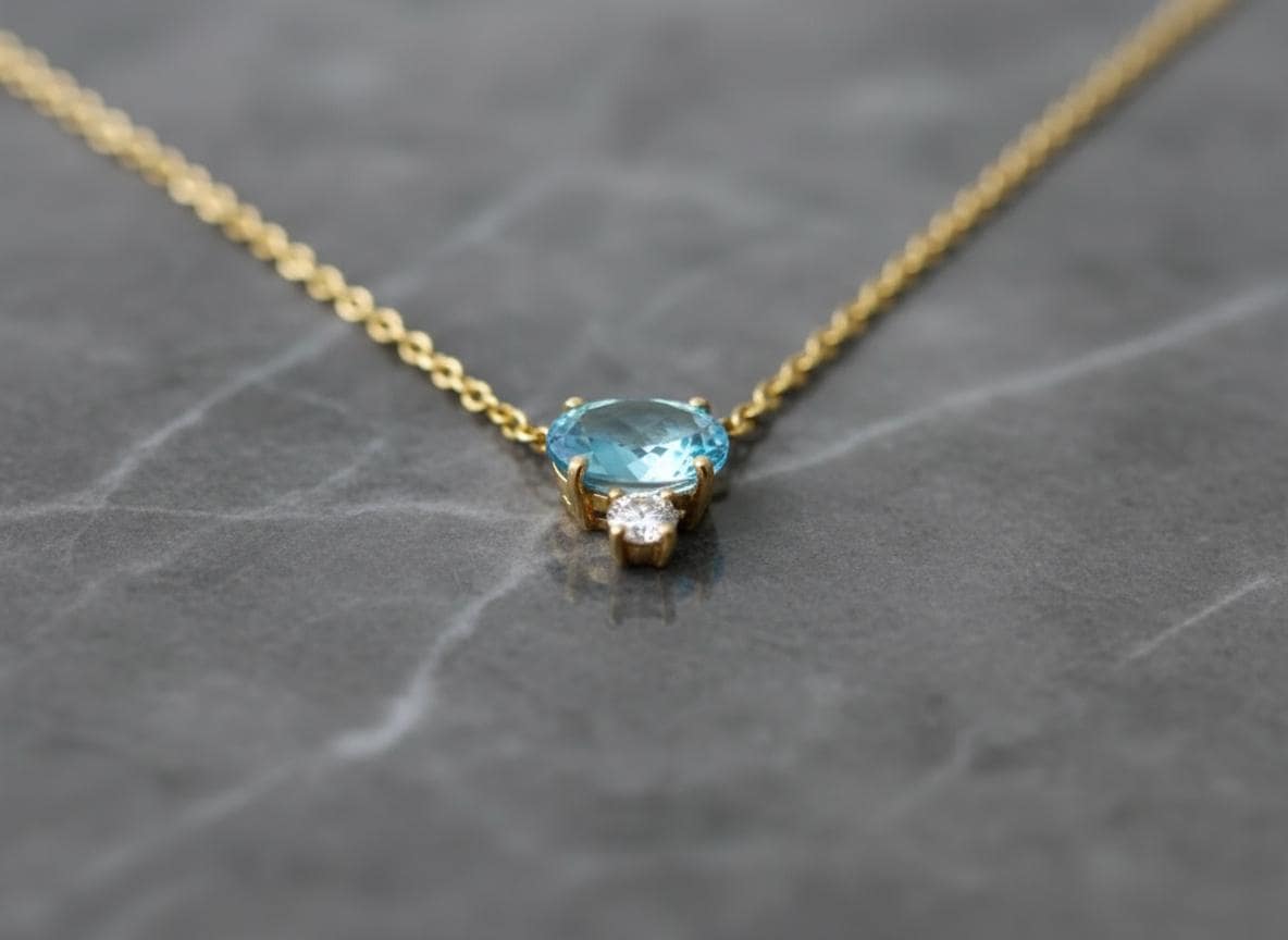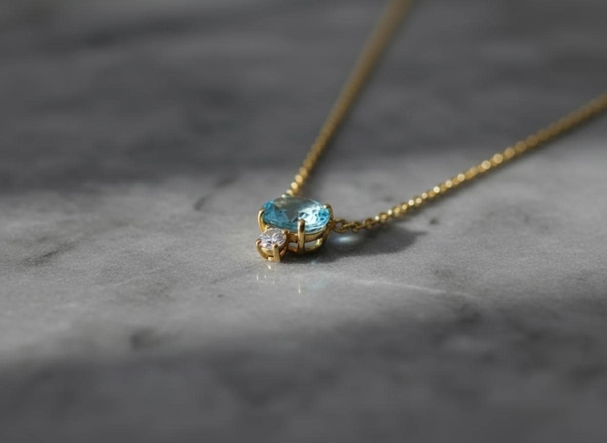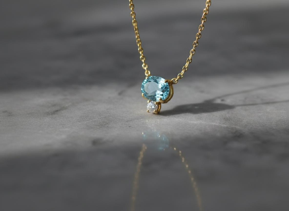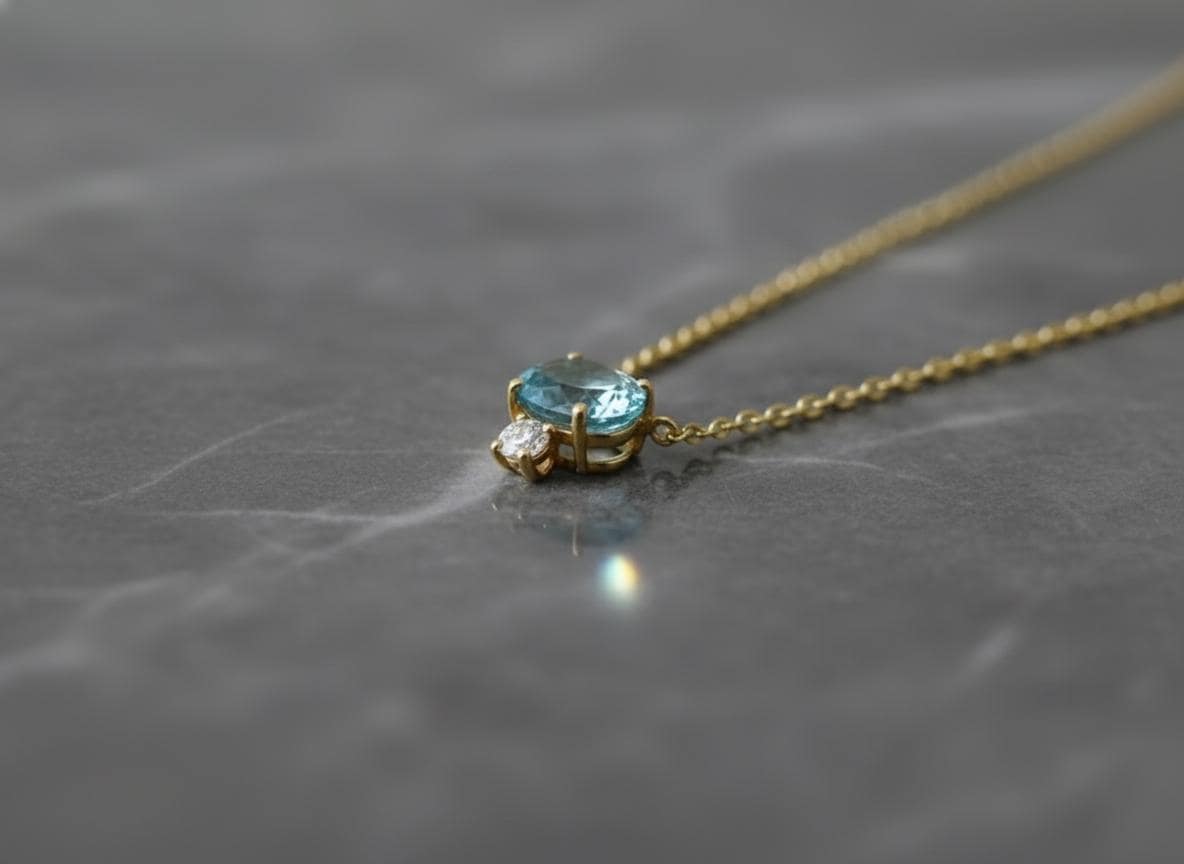 Crafted with precision and care, this necklace embodies the perfect blend of luxury and sustainability. Our lab-grown moissanite offers the brilliance and fire of natural diamonds, ensuring a dazzling sparkle that complements the natural beauty of the aquamarine.