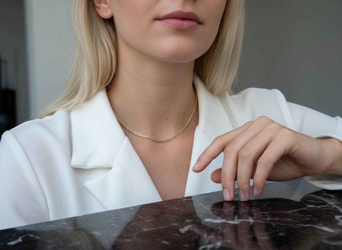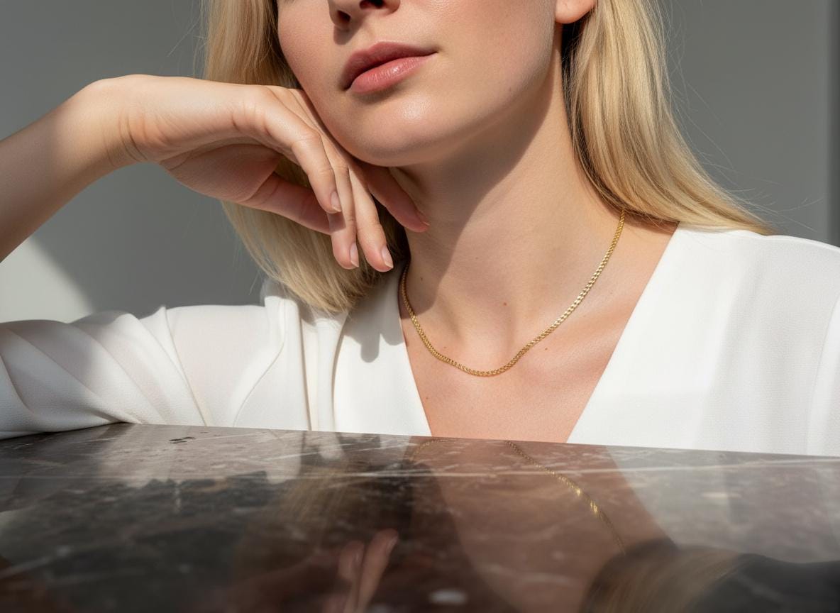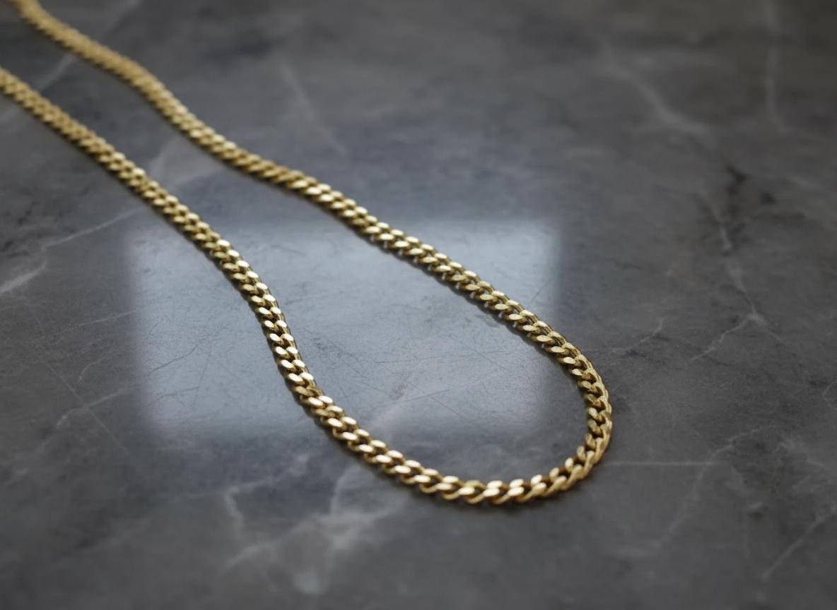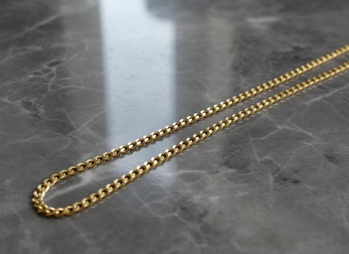 Designed for comfort and everyday wear, this chain features a flat gourmet design that lies smoothly against your skin. The secure lobster clasp ensures that your necklace stays in place, providing peace of mind and effortless elegance.