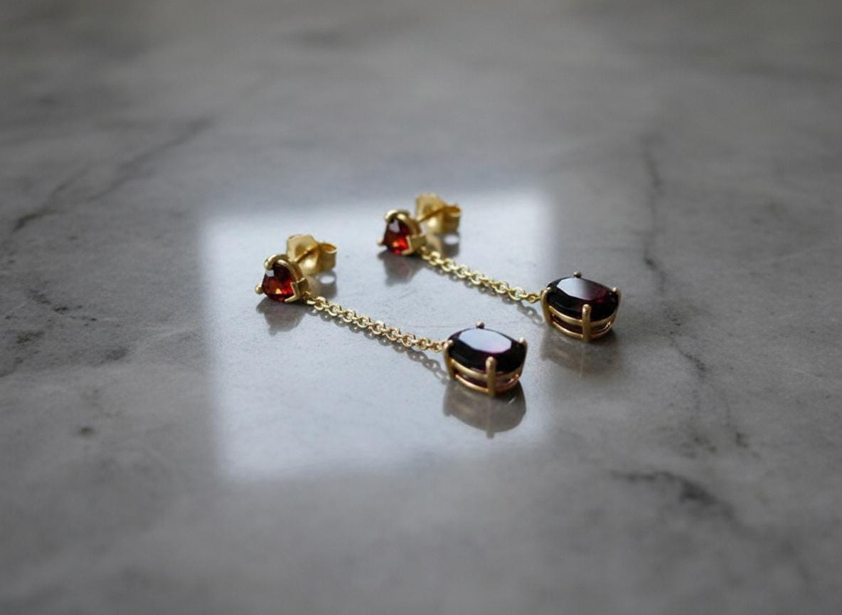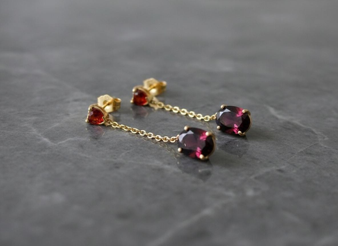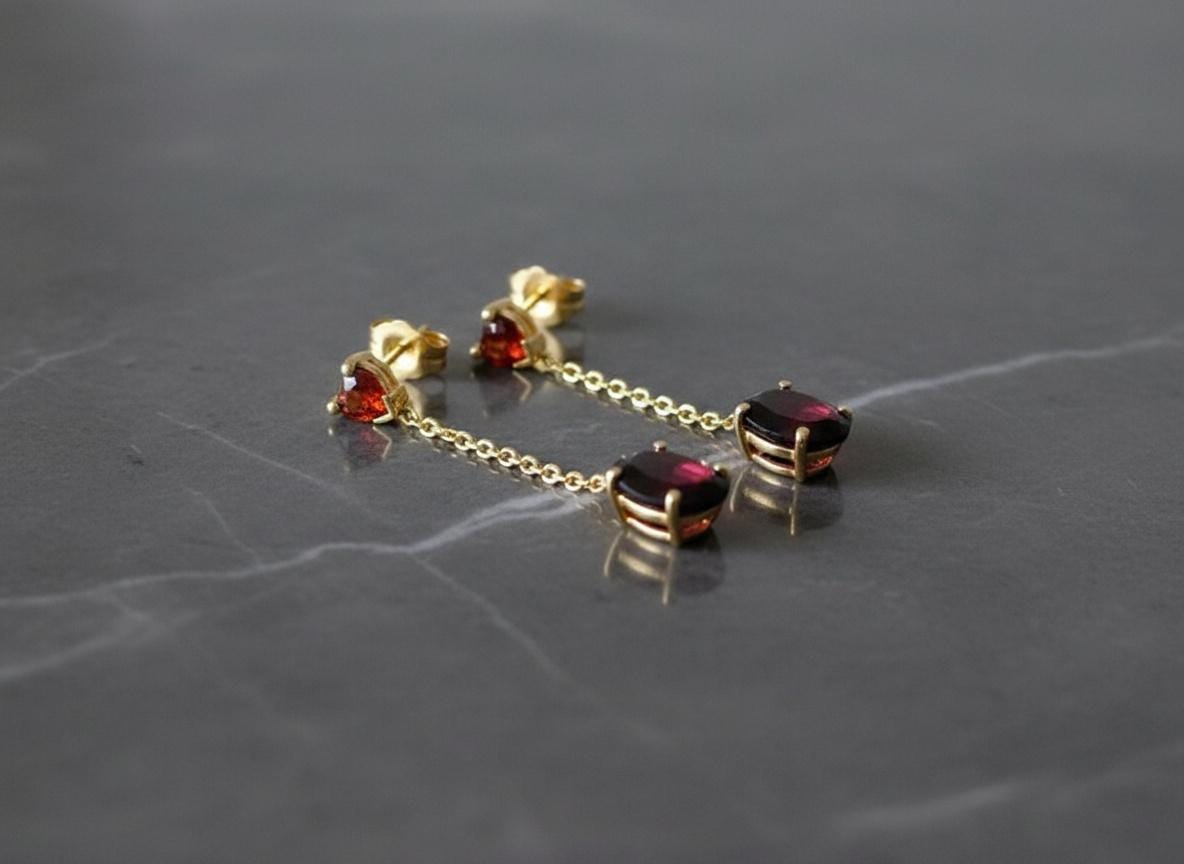 Introducing our luxurious 14k Gold Garnet Dangle Earrings, designed to captivate with their deep, rich hues and elegant design. These stunning earrings feature a unique combination of heart and oval-cut garnet stones, linked by a delicate gold chain that adds movement and grace to each piece.