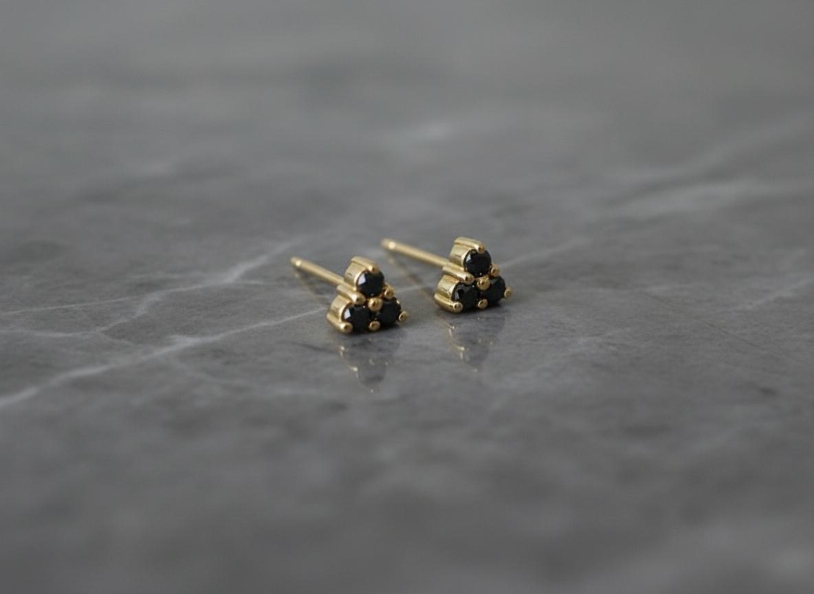 Striking and sophisticated, these 14K Yellow Gold Black Diamond Stud Earrings offer a bold yet delicate touch of edge. Set in a petite triangle cluster, each stud features three 2.2mm black diamonds, totaling 0.25 carats per pair. The contrast of dark sparkle against warm gold creates a unique and modern look — perfect for everyday wear or special occasions.