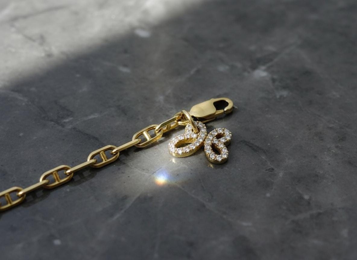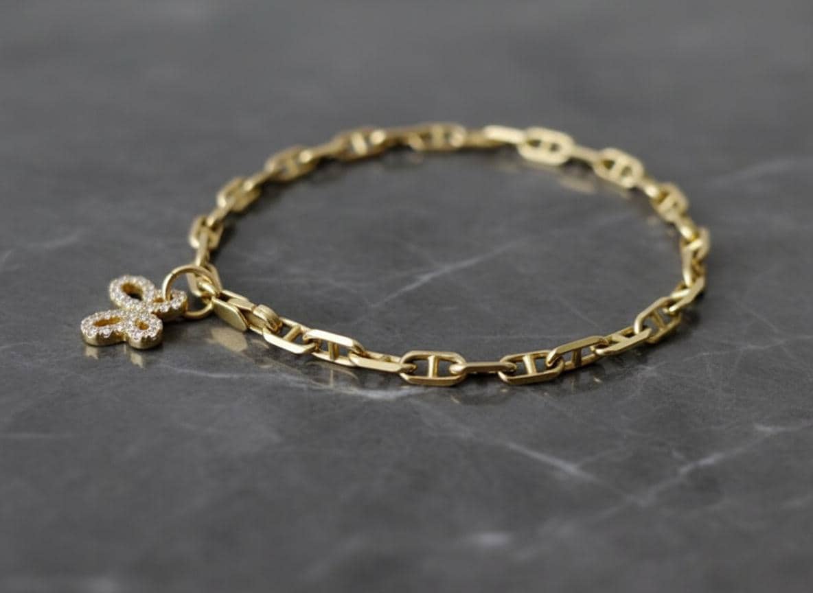 This elegant 14k solid gold bracelet features a charming 8x10mm butterfly pendant adorned with sparkling white moissanites, symbolizing transformation and beauty. The 3mm gold chain strikes the perfect balance between dainty and durable, making it an ideal choice for everyday wear or special occasions.