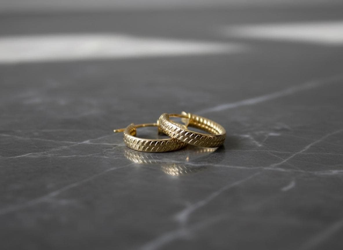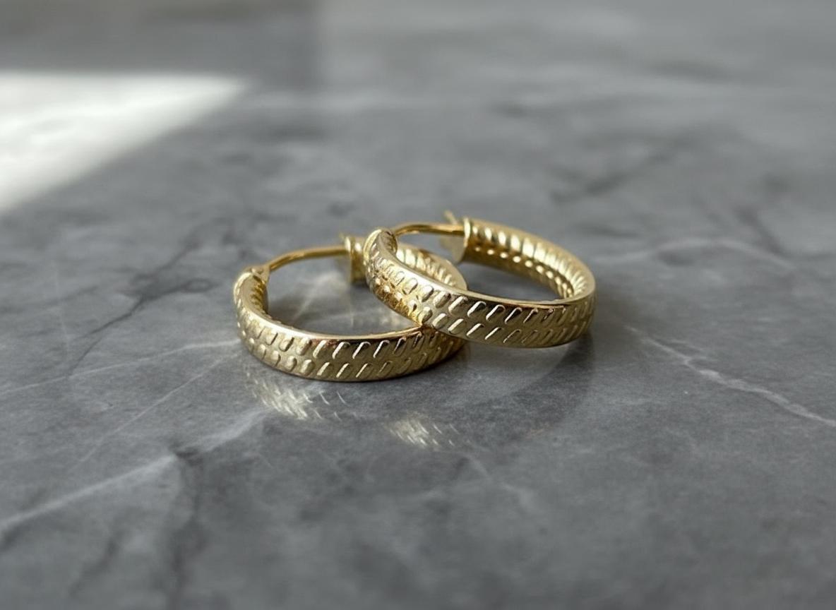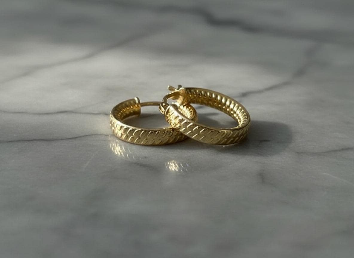 Discover the perfect blend of elegance and modern style with these 14k gold hoop earrings. Measuring 14mm in outer diameter and 3mm wide, they feature a unique textured pattern that adds a touch of sophistication to any outfit. The diagonal, repeating grooves give it a similar look to the surface of a tire, adding a unique and edgy touch to the classic gold hoop design. Crafted from high-quality 14k solid gold, these hoops are both lightweight and durable, making them suitable for everyday wear or special occasions.