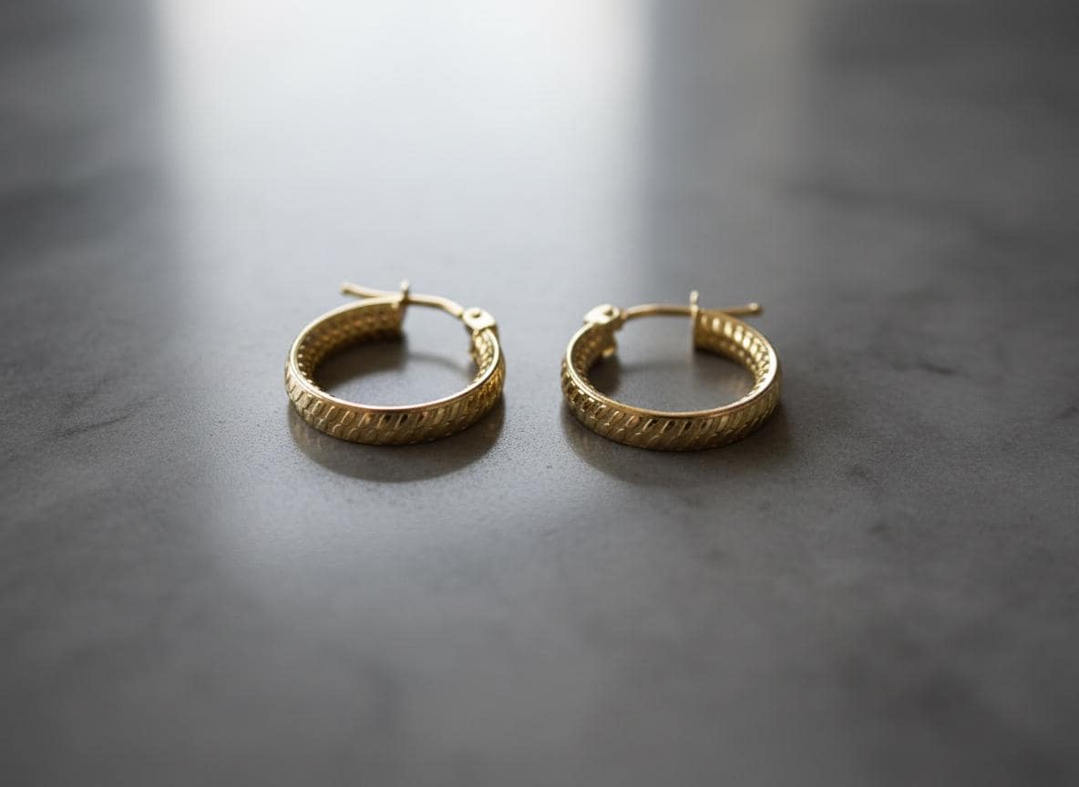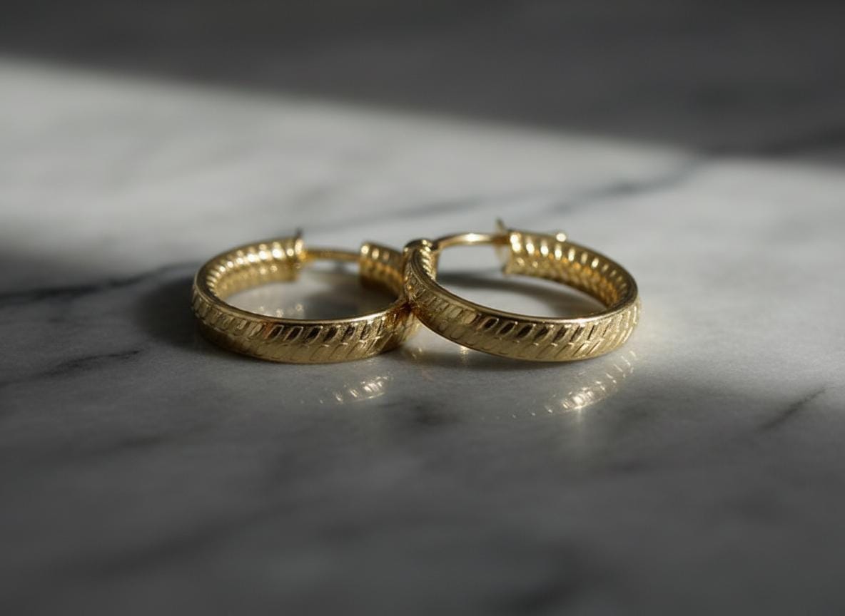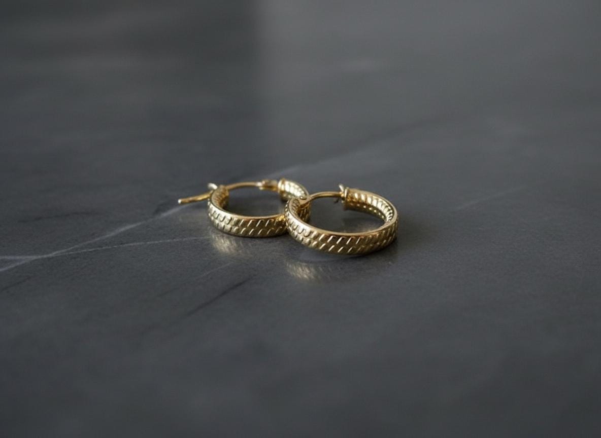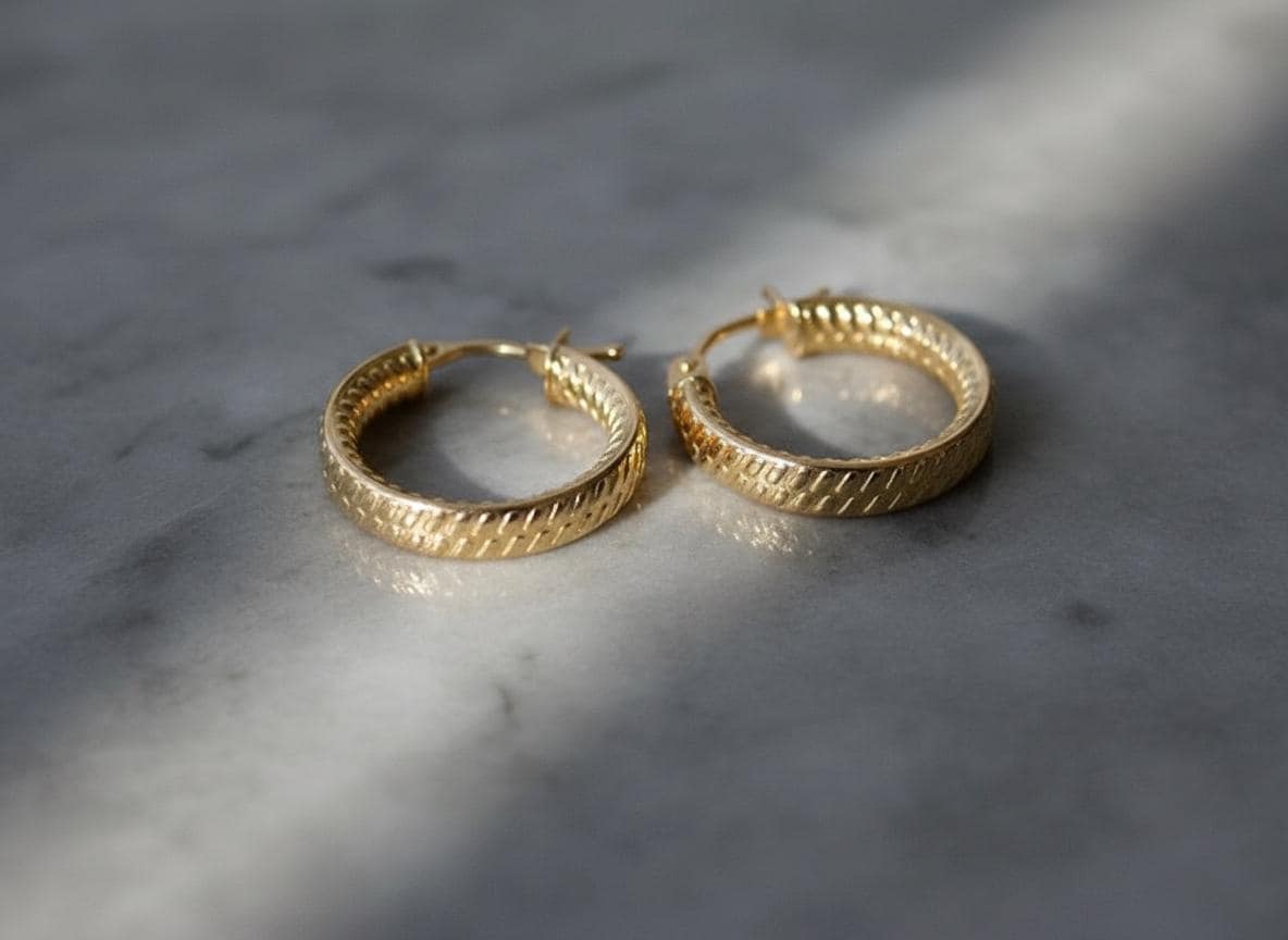 Discover the perfect blend of elegance and modern style with these 14k gold hoop earrings. Measuring 14mm in outer diameter and 3mm wide, they feature a unique textured pattern that adds a touch of sophistication to any outfit. The diagonal, repeating grooves give it a similar look to the surface of a tire, adding a unique and edgy touch to the classic gold hoop design. Crafted from high-quality 14k solid gold, these hoops are both lightweight and durable, making them suitable for everyday wear or special occasions.