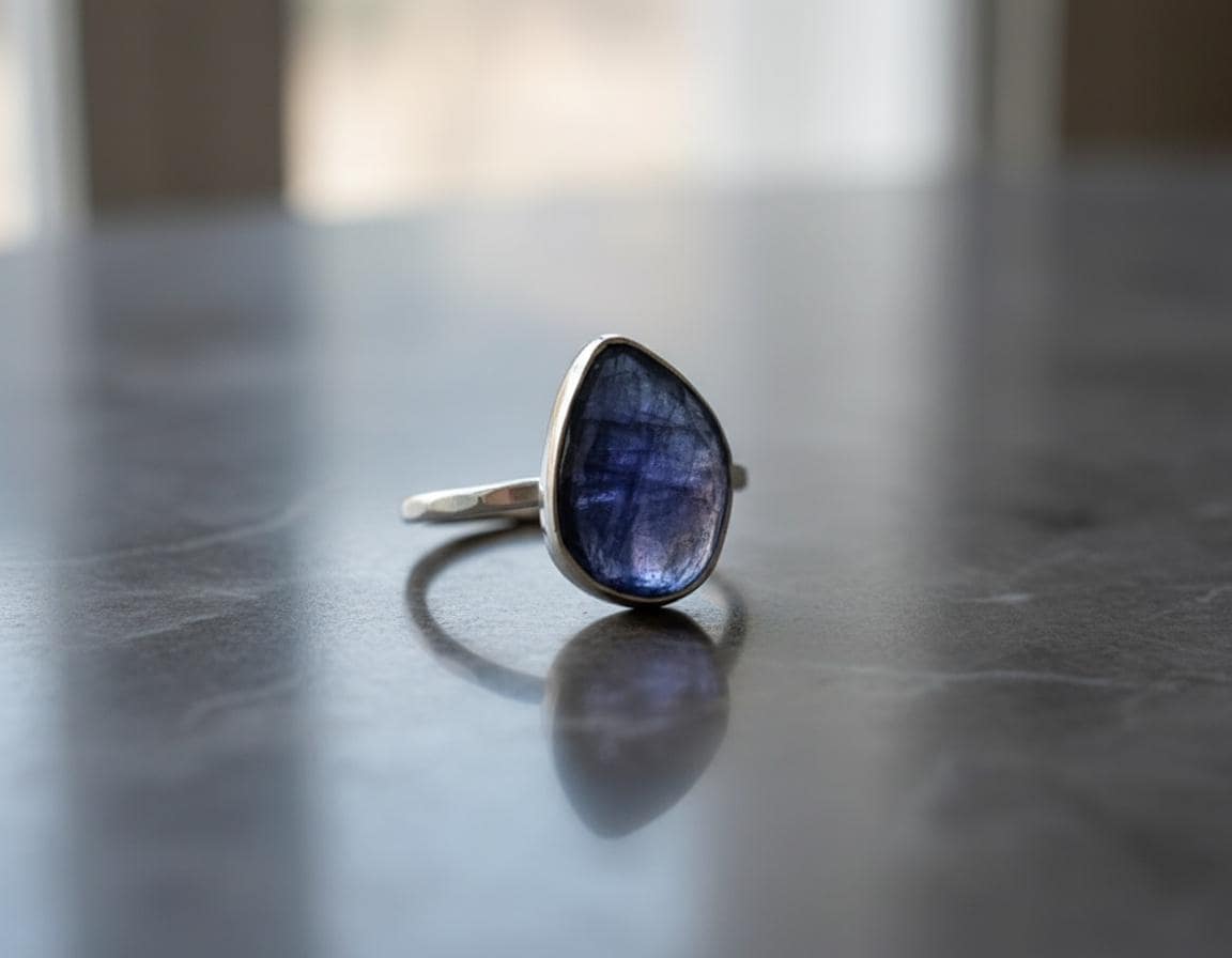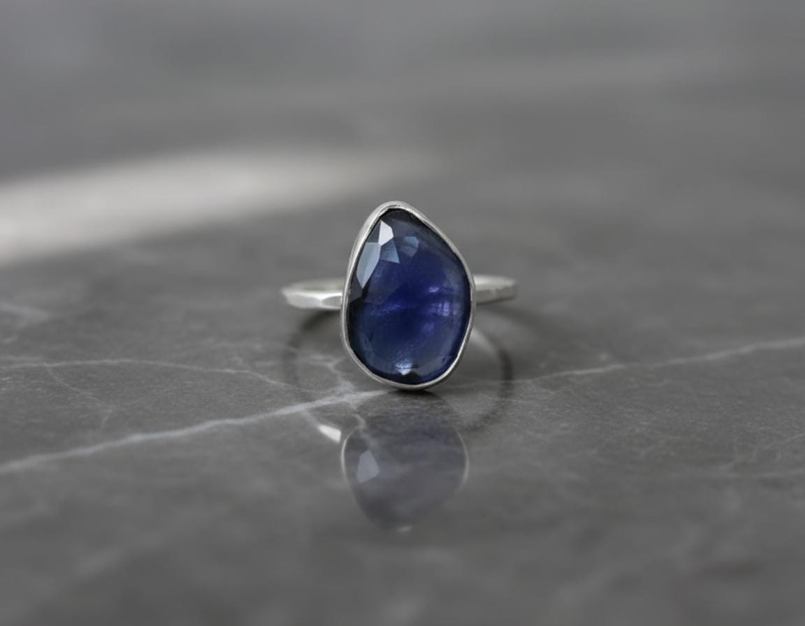 This sterling silver iolite ring features a striking 10x15mm pear-shaped gemstone in a sleek bezel setting. The rich violet-blue tones of iolite shift beautifully in the light, making it a unique and captivating piece. The slender 1.8mm shank offers a minimalist profile, allowing the gemstone to be the focal point. Perfect for everyday wear or as a special December birthstone gift, this ring blends elegance with modern simplicity.