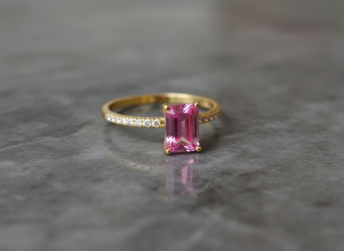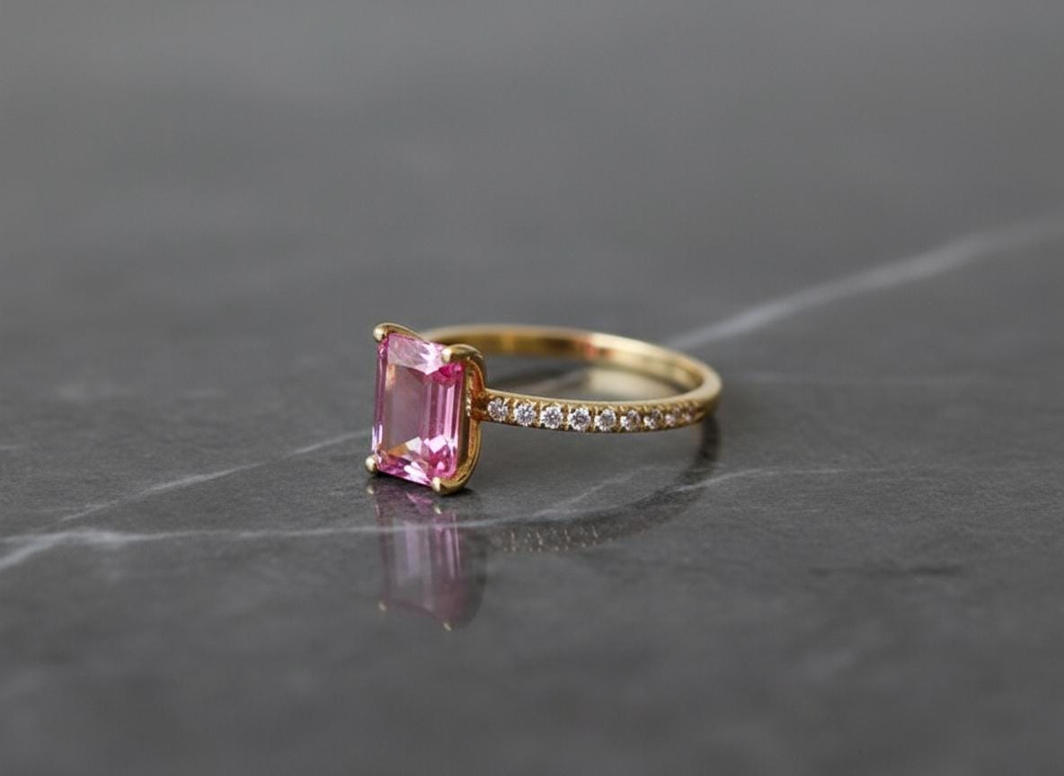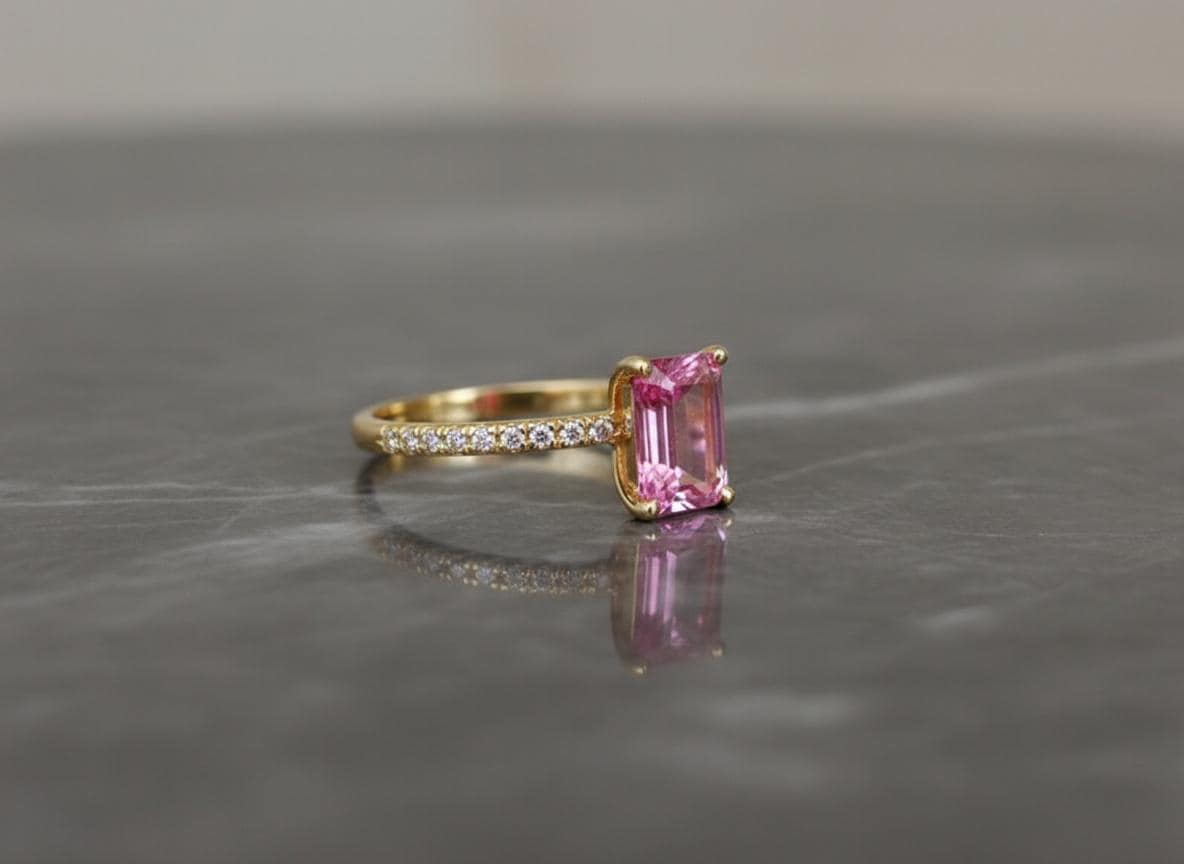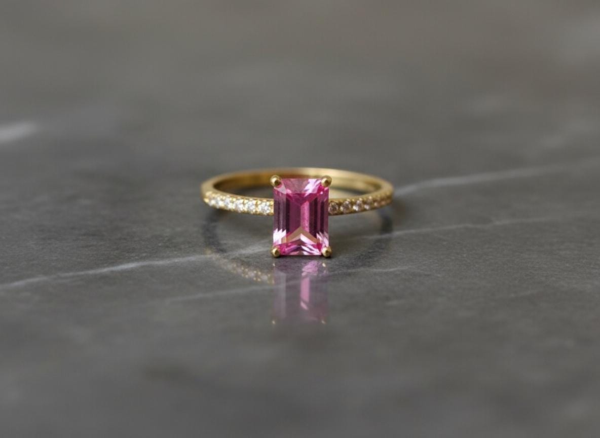 Bright and feminine with a touch of fire — this 14K Yellow Gold Ring features a vivid 5x7mm emerald-cut pink topaz, accented with sparkling moissanites along a 1.5mm solid gold shank. With its clean lines and glowing hues, this ring is a fresh take on classic romance.