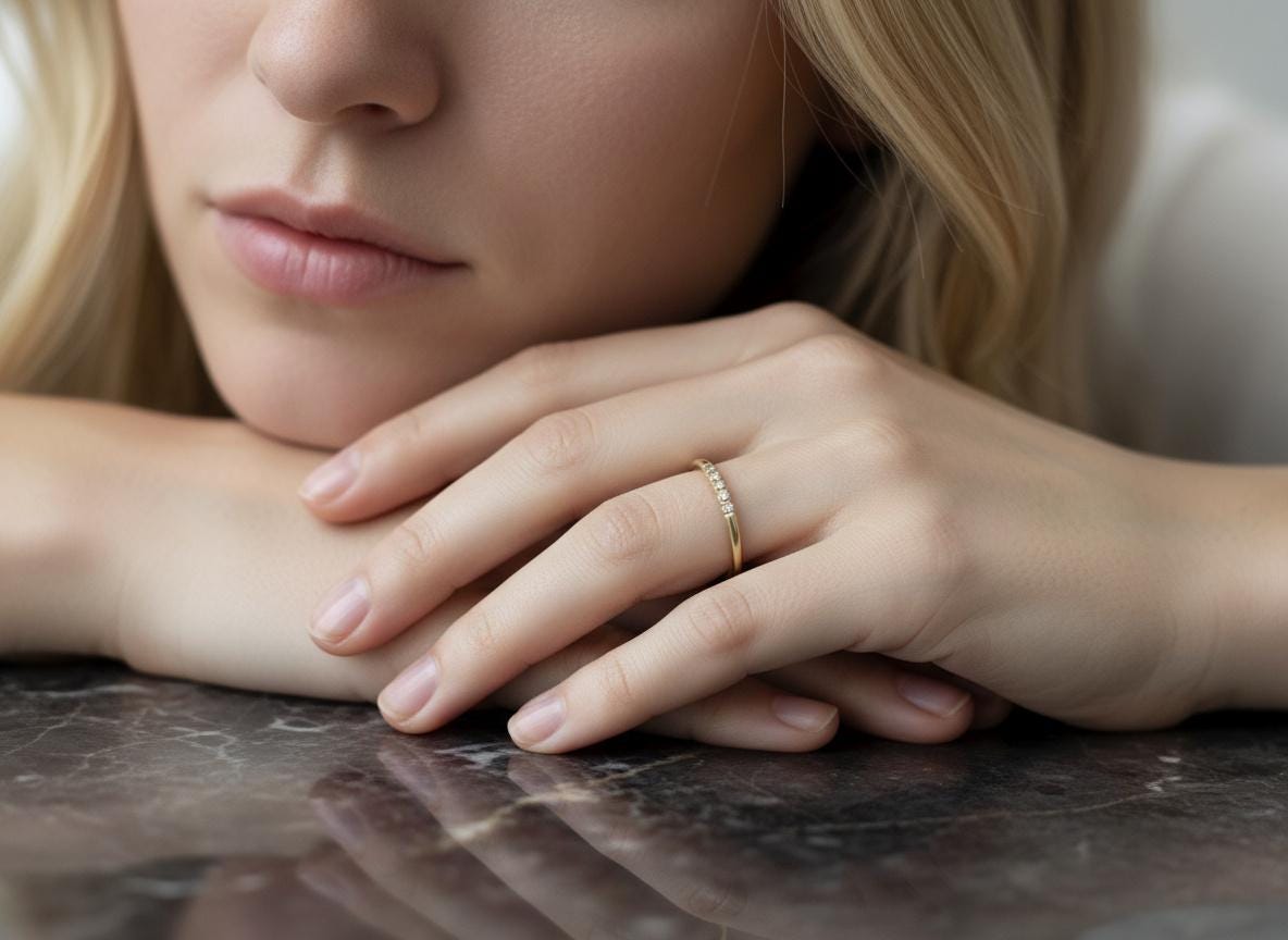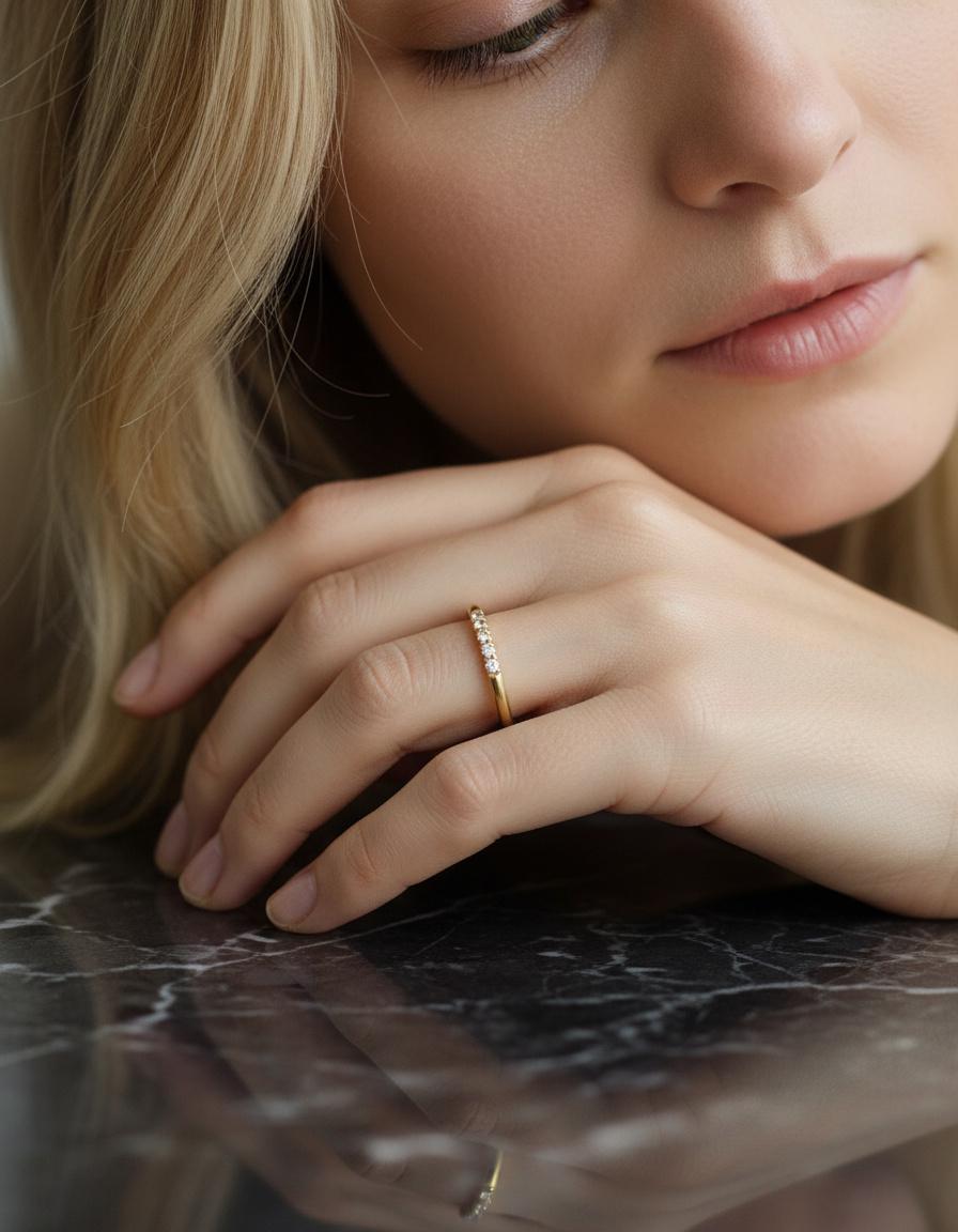 Whether worn solo as a minimalist statement or stacked for extra shine, this five-stone moissanite band is a graceful symbol of commitment—and a sparkling addition to your jewelry collection.