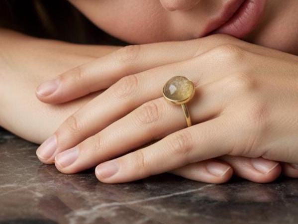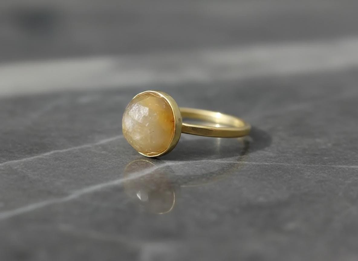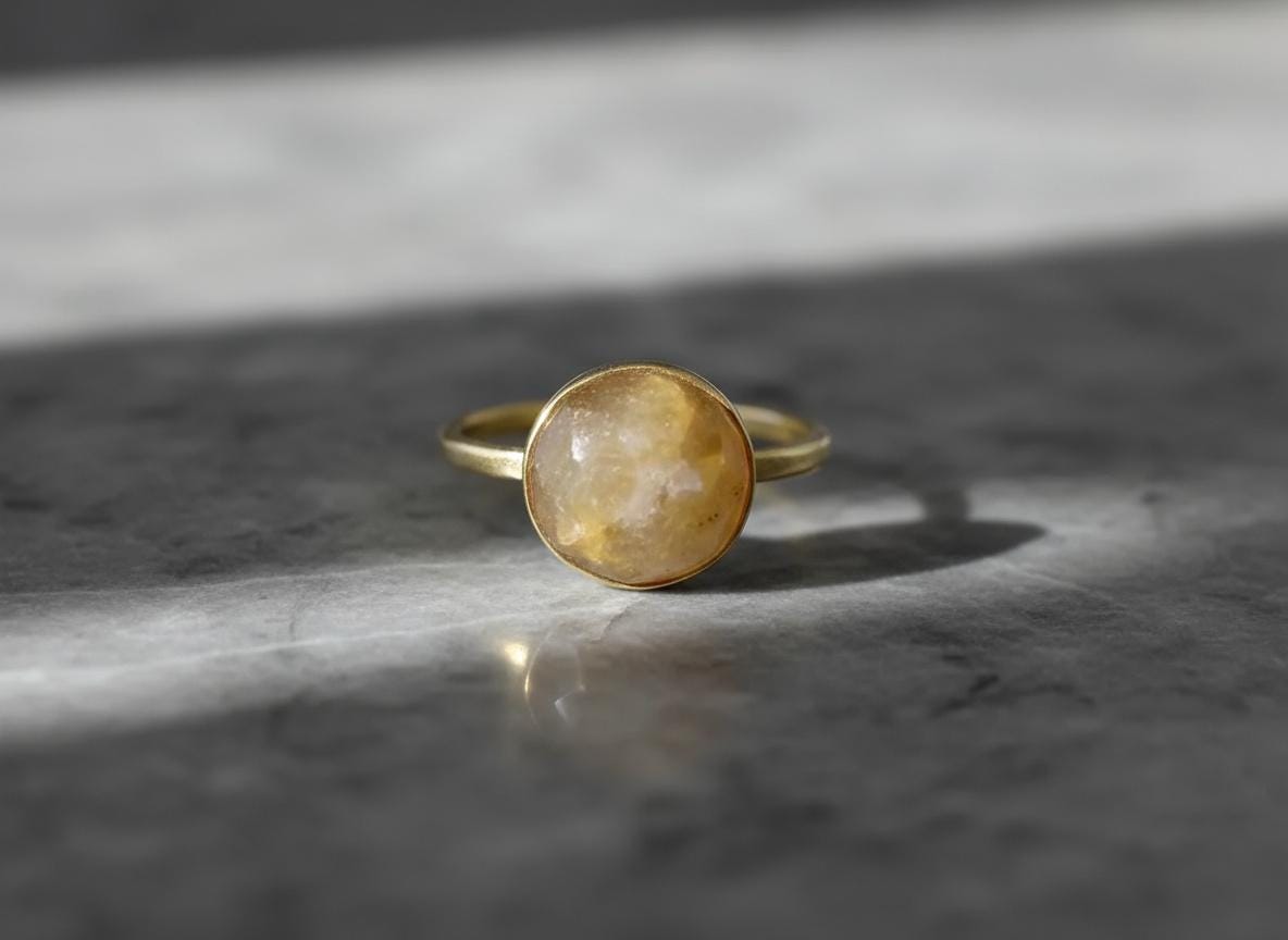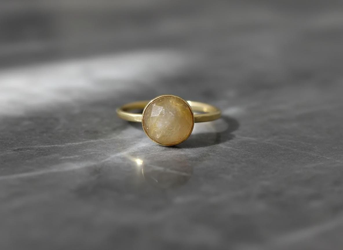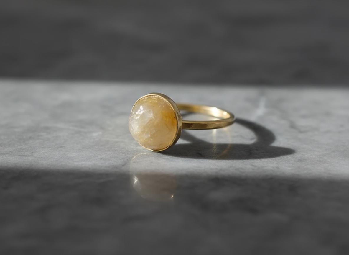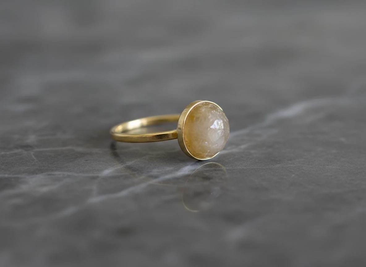 This handcrafted 14k solid gold ring features a 10mm rose-cut rutilated quartz with golden needle-like inclusions. Set in a smooth bezel on a classic band, this one-of-a-kind piece blends natural beauty with warm elegance. Size 7 US. A perfect statement ring, gift, or alternative engagement piece for those drawn to unique, earthy gemstones.