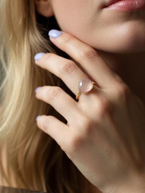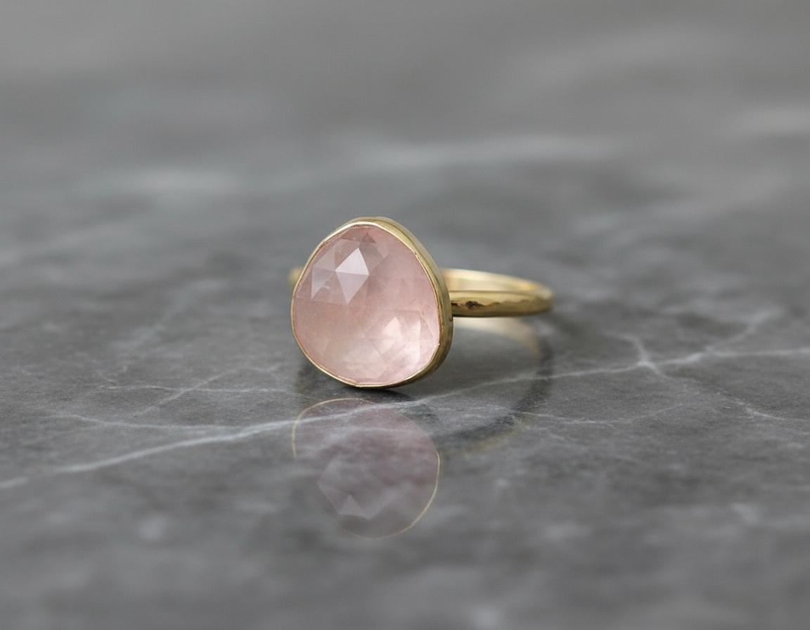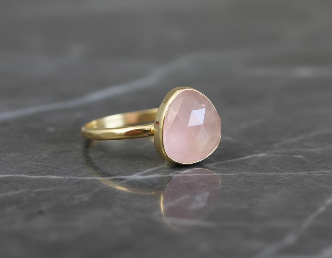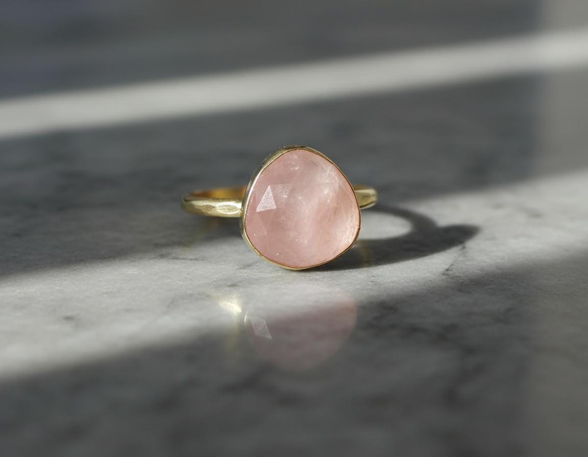 A soft touch of elegance for everyday or special moments. This 14k solid gold ring features an 13mm rose-cut natural rose quartz set in a smooth bezel. The 2mm gold band offers a timeless, minimalist look. Rose quartz is known for promoting love and harmony — making this handcrafted size 7.5 US ring both beautiful and meaningful.