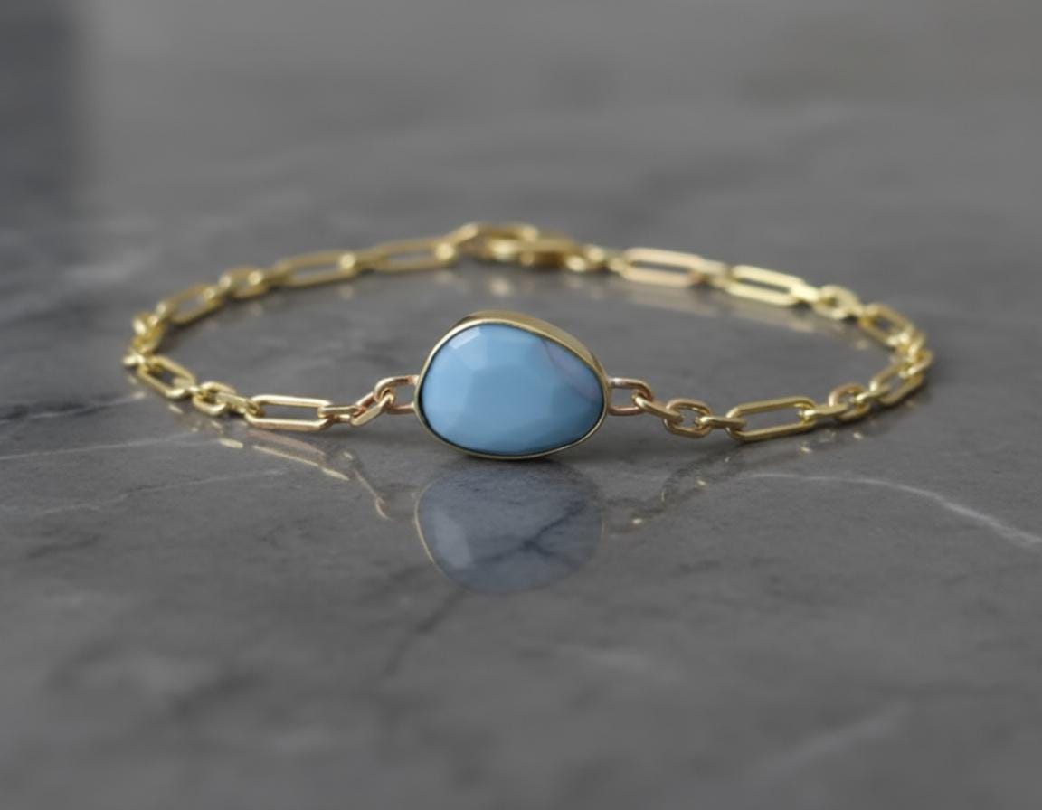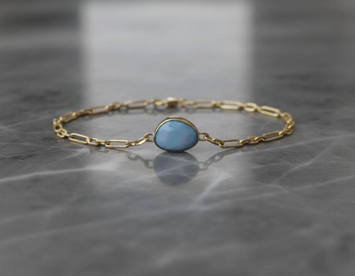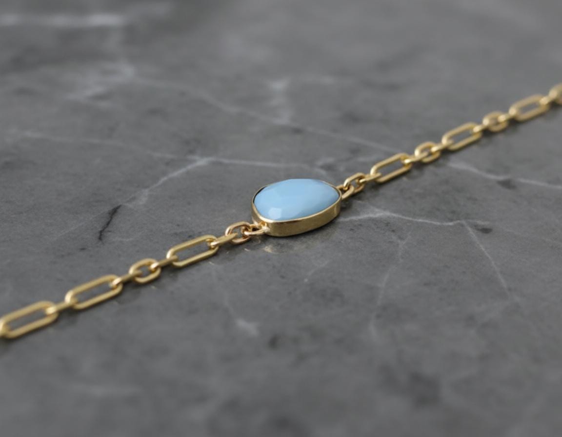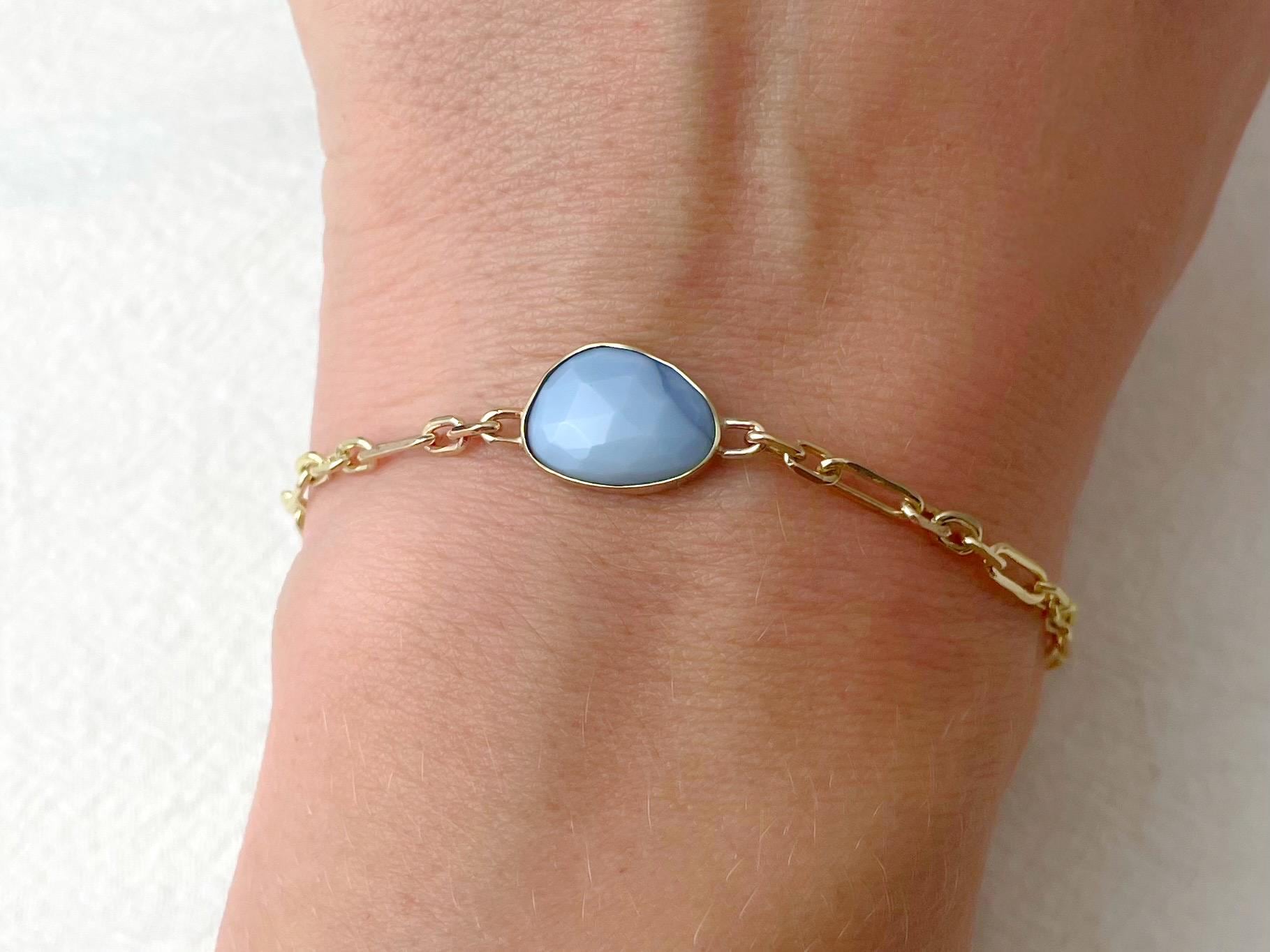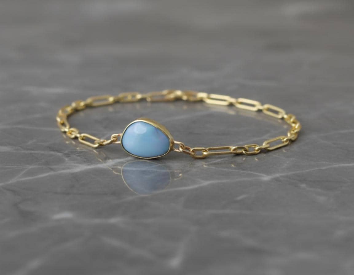 This 14k gold bracelet features a dreamy blue opal set in a smooth bezel on a paperclip-style chain. Each piece is handcrafted and made to order in your desired length. The soft glow of the opal paired with the bold chain creates a perfect balance of elegance and edge — ideal for everyday wear or a meaningful gift.