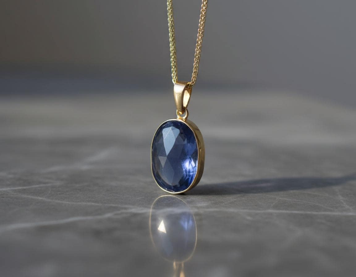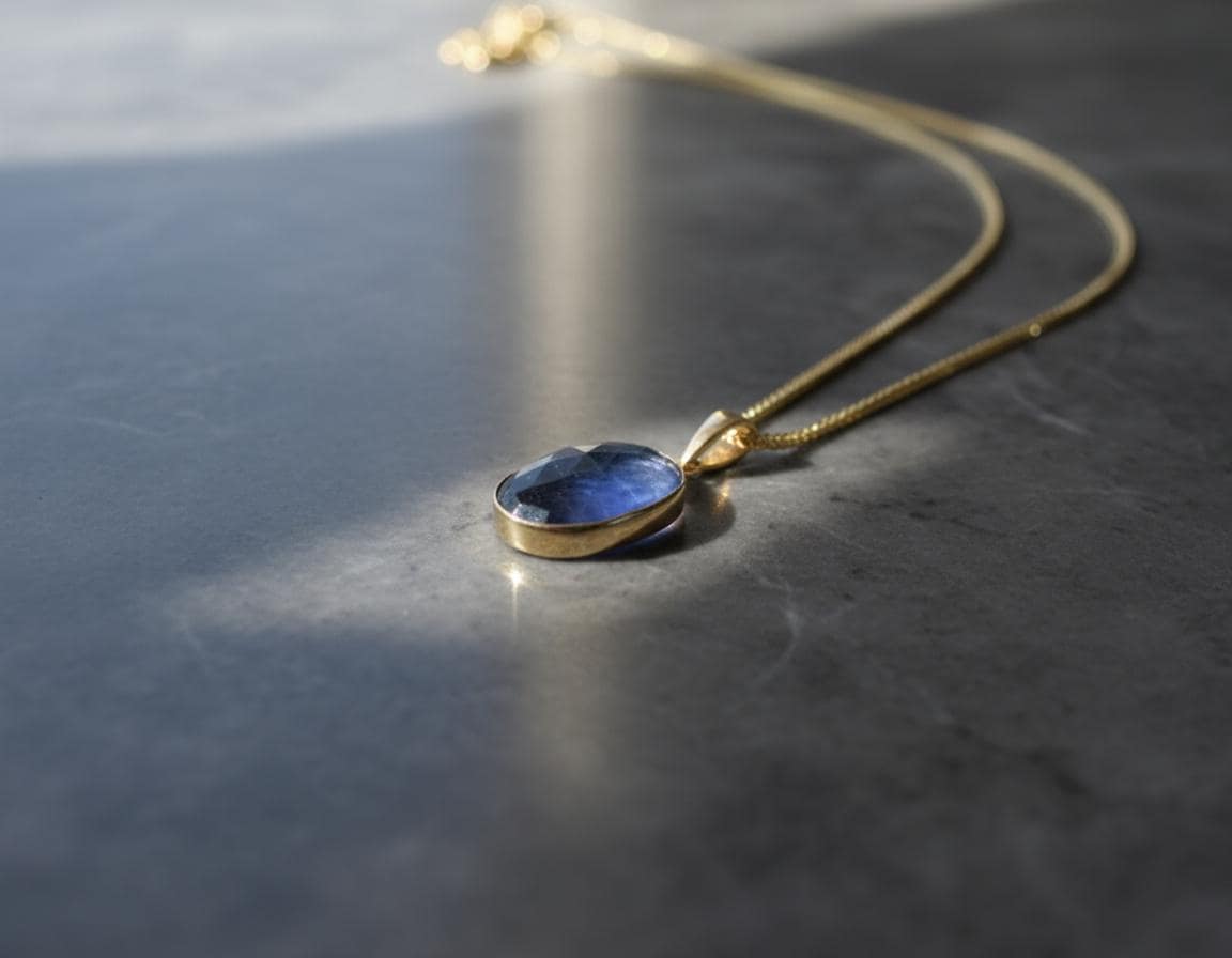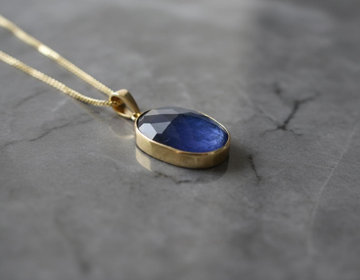 This elegant 14k gold necklace showcases a deep blue-violet 10x14mm rose-cut iolite, bezel-set in solid gold. Suspended from a classic spiga chain, this piece is made to order in your choice of 42 cm or 45 cm. A timeless design that pairs beautifully with any style — perfect as a gift or a meaningful September birthstone piece.