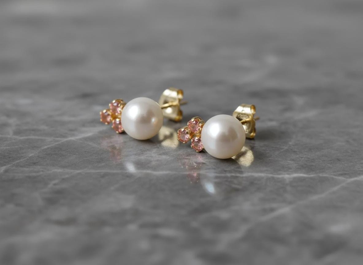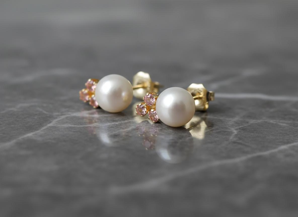 Elegant and timeless with a touch of royal charm — these 14K Yellow Gold Stud Earrings feature luminous 7mm cultured pearls paired with a trio of 2mm peach pink tourmaline. Set in solid gold, the contrast between the soft glow of the pearl and the sparkle of tourmalines creates a sophisticated and feminine design.