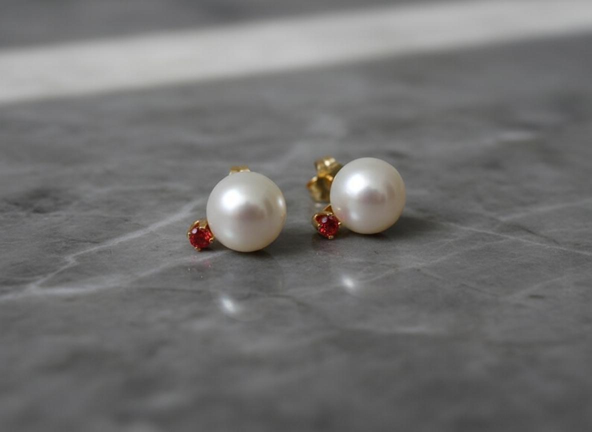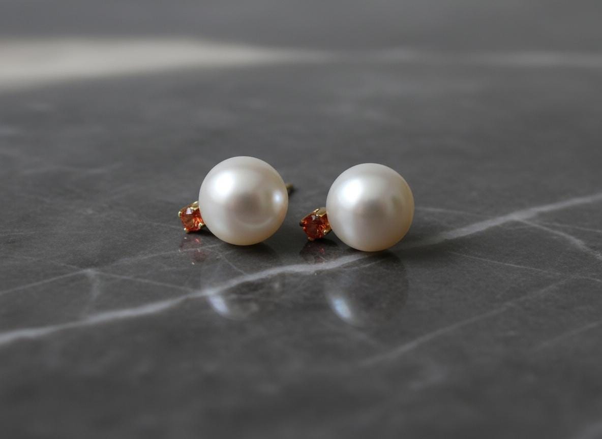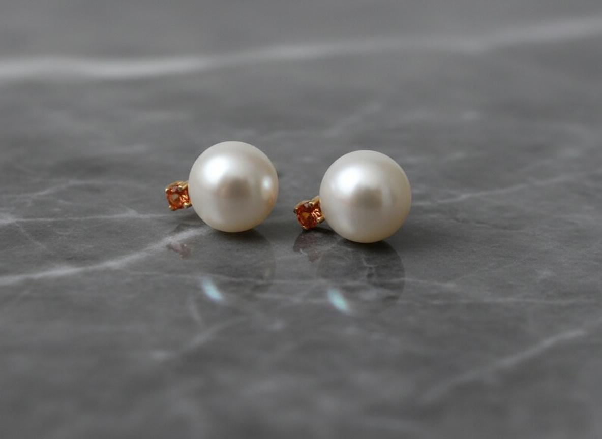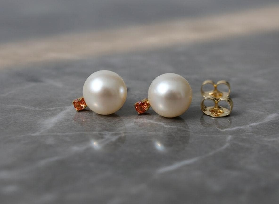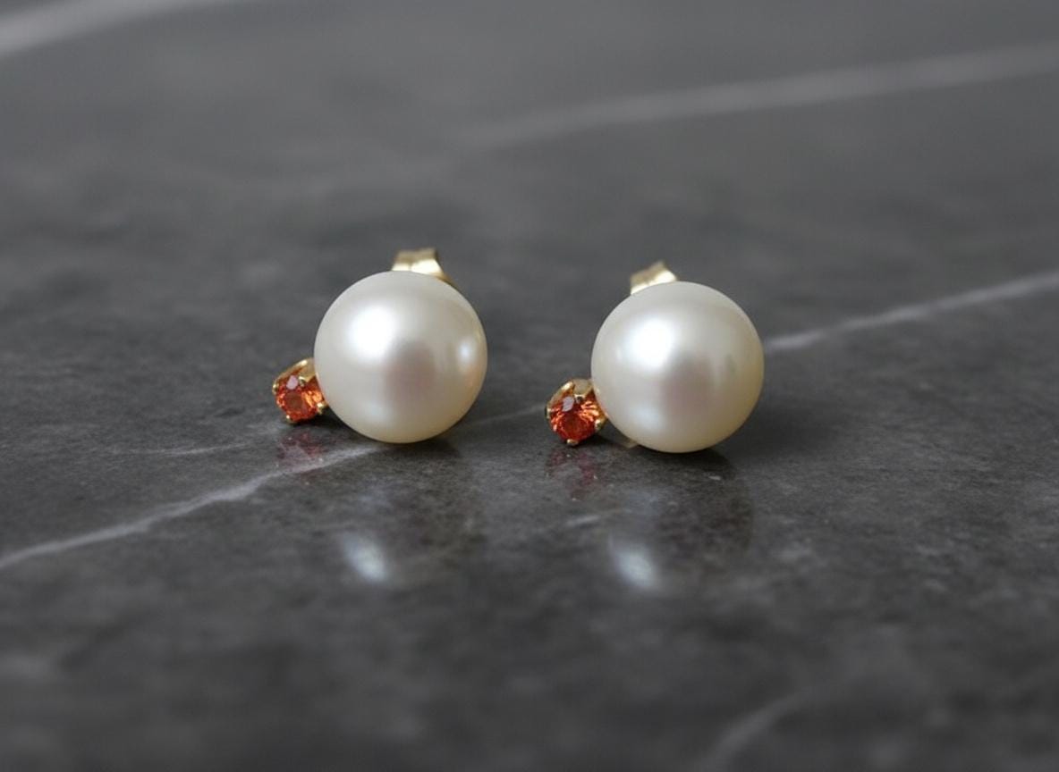 Bright and timeless, these 14k gold stud earrings combine the soft glow of 7mm white freshwater pearls with the vibrant warmth of 2.0mm orange sapphires. Handcrafted with solid gold settings, they bring together classic elegance and a lively pop of color, making them perfect for both everyday wear and special moments.