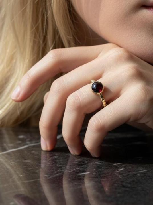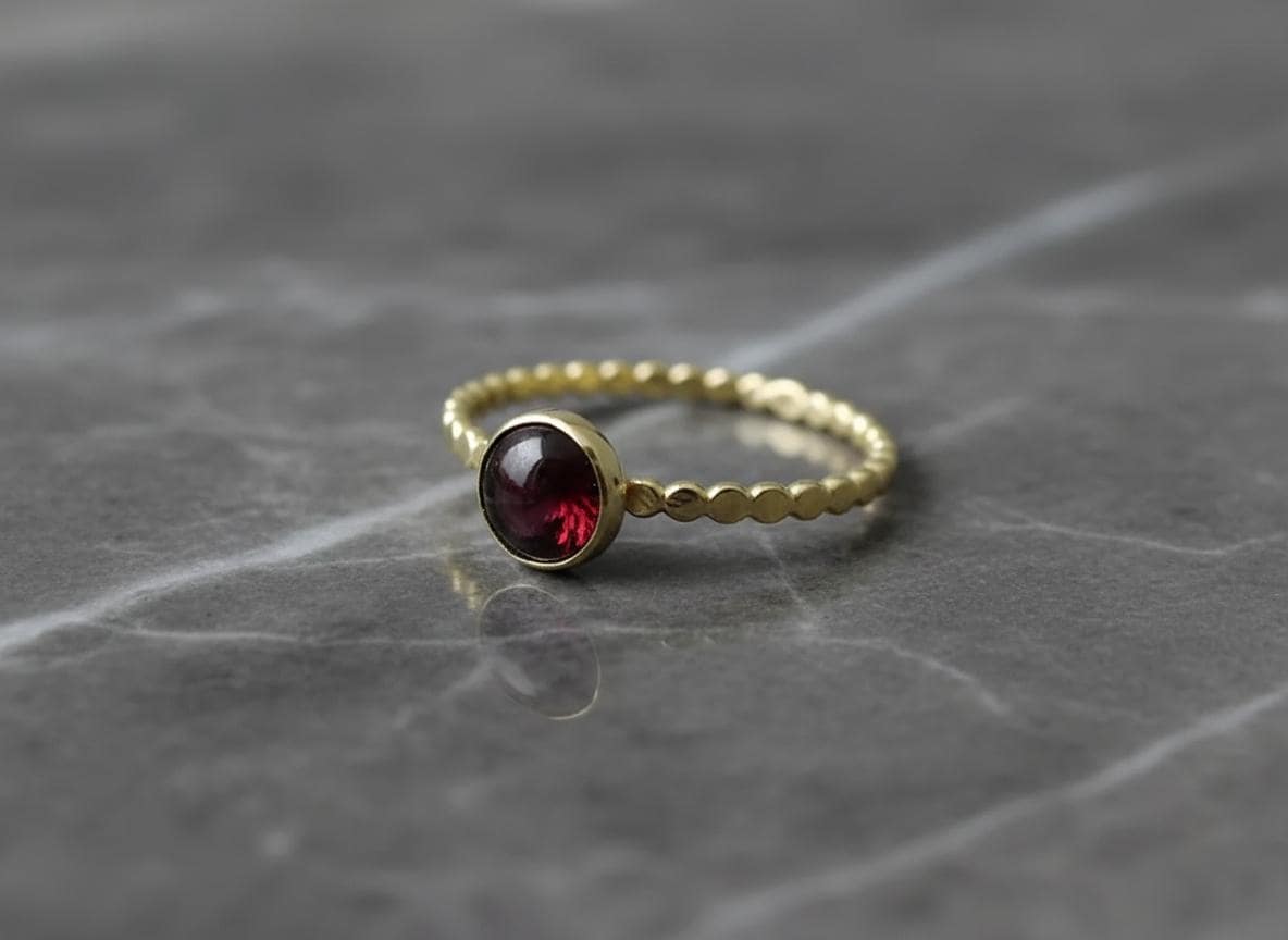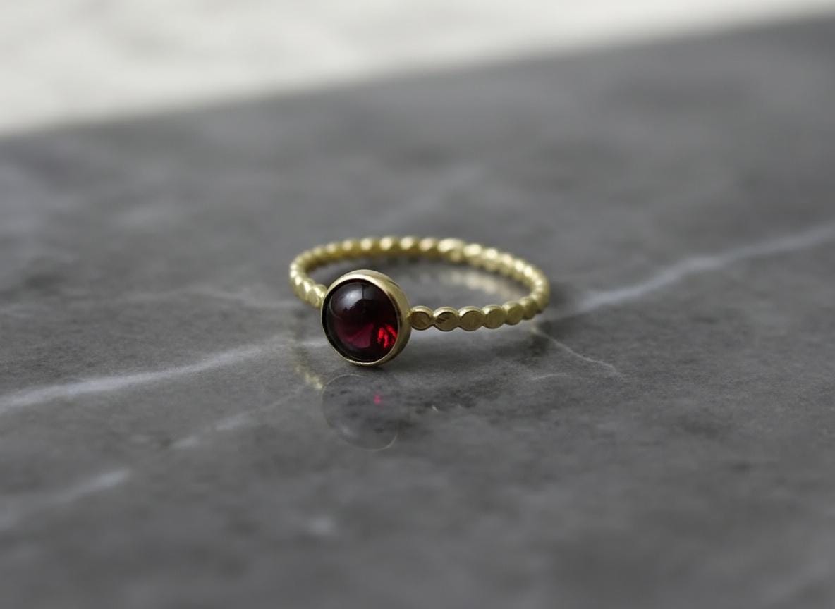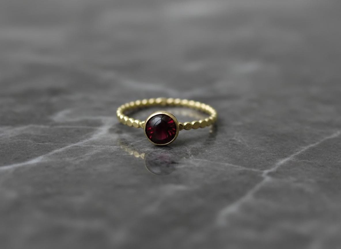 This elegant 14k gold ring features a rich, deep red 6mm garnet cabochon set in a sleek bezel on a delicate beaded band. The garnet’s warm hue and smooth surface create a timeless piece that’s both minimal and captivating.