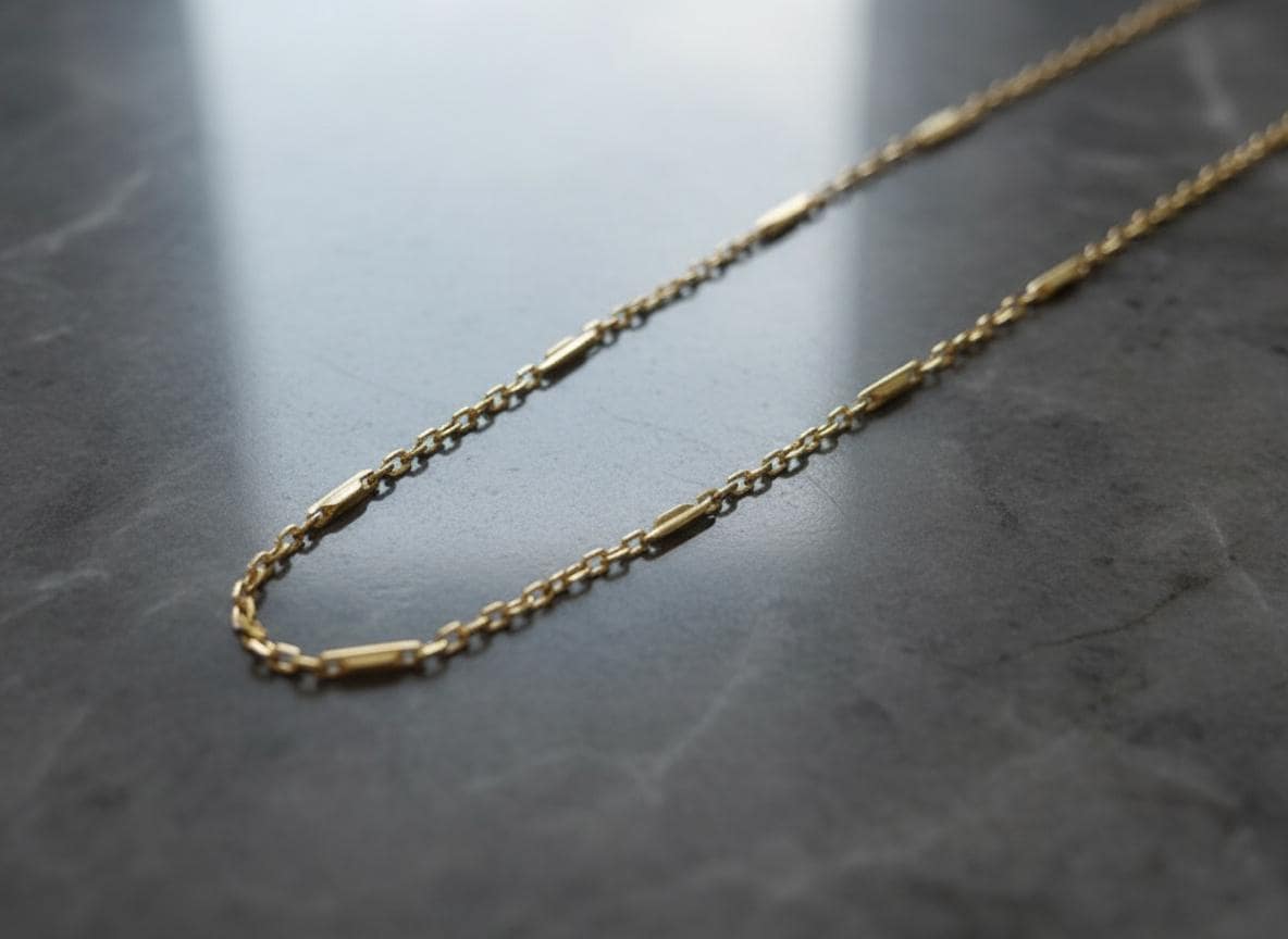 Elevate your everyday style with this 14k solid gold bar chain necklace, crafted with slender flat bar links for a sleek, modern aesthetic. The delicate design (1.8mm thickness) makes it perfect for wearing solo or layering with other necklaces. Each bar reflects light beautifully, creating subtle sparkle with every movement.
