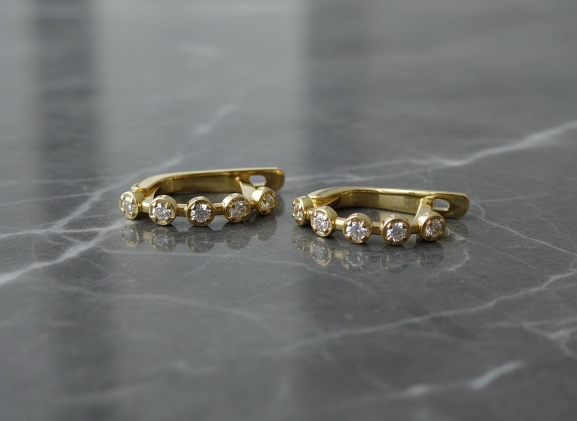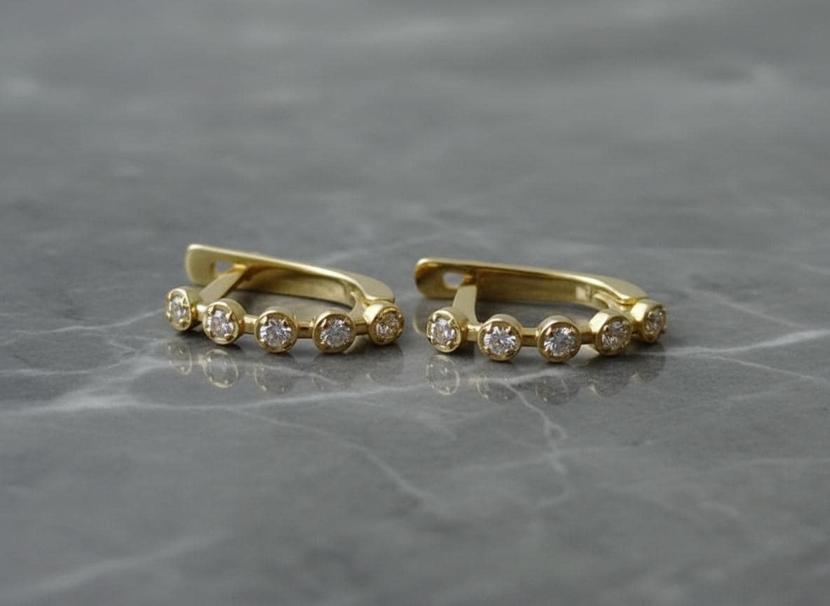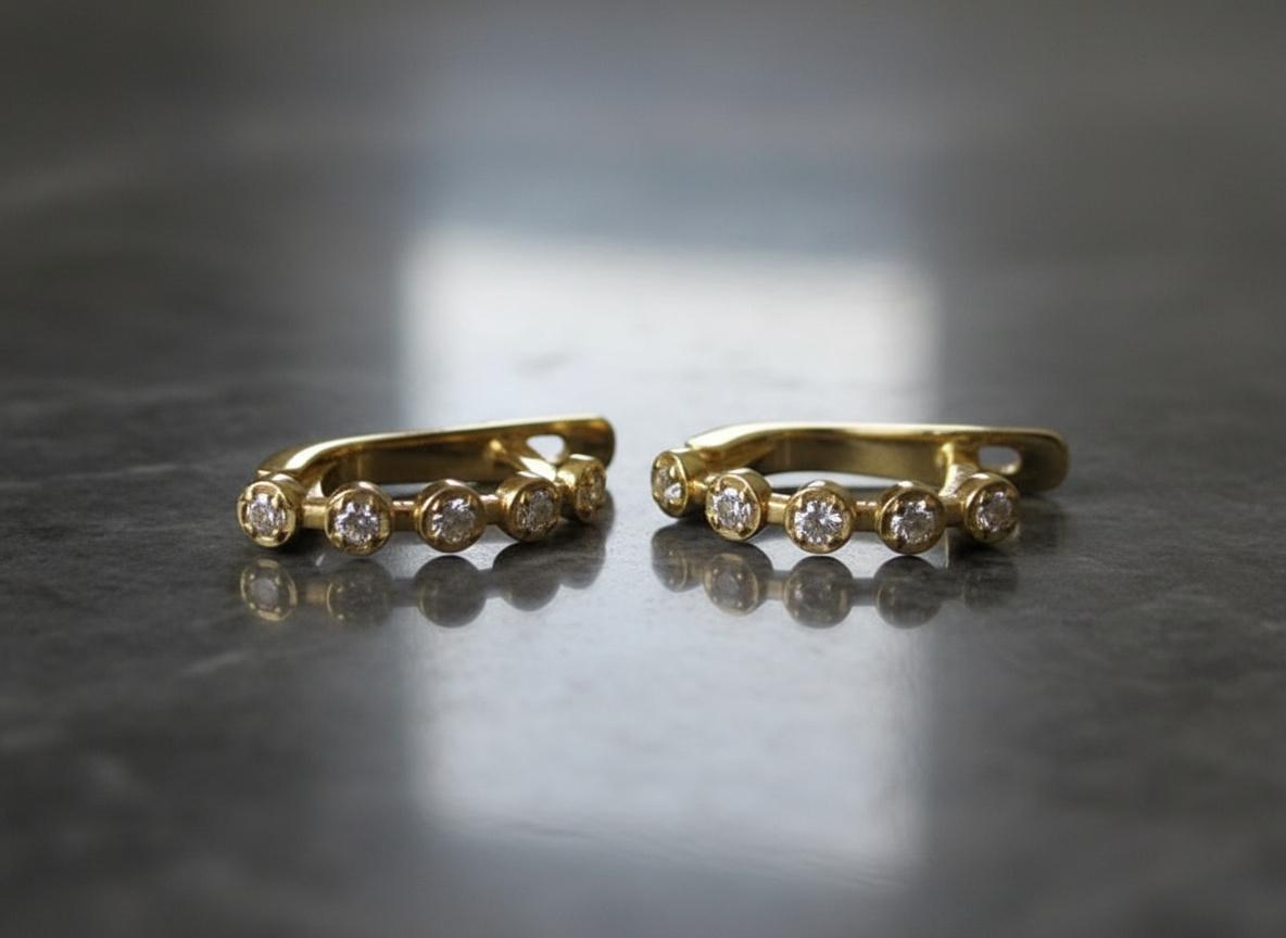 These 14k solid gold moissanite huggie hoop earrings bring a perfect balance of sparkle and elegance to your everyday style. Adorned with five round 1.5mm moissanites on each earring (ten total), they create a continuous shimmer that catches the light beautifully from every angle.