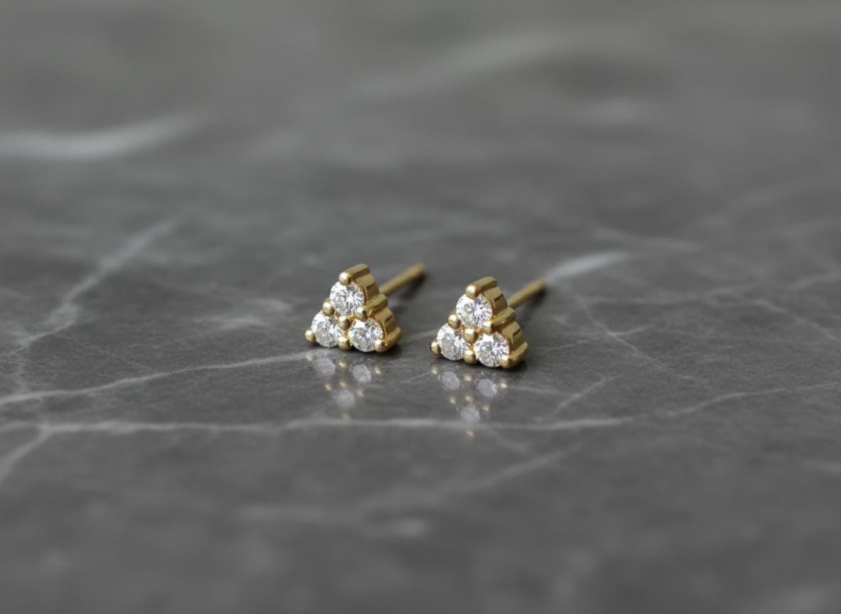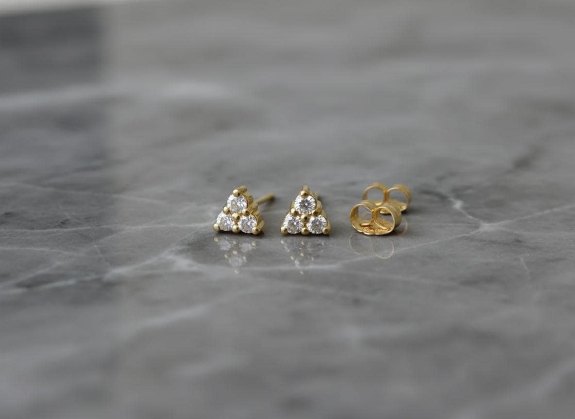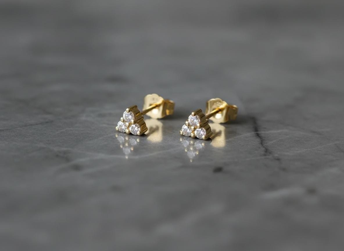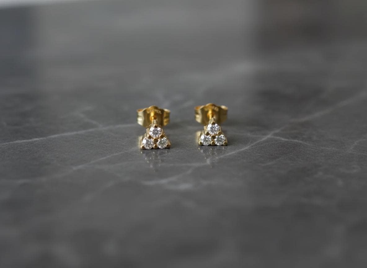 These elegant 14K gold triangle diamond stud earrings are the perfect blend of minimalism and sparkle. Each earring features three round natural diamonds, each 2.2mm in diameter, forming a chic geometric triangle design. Crafted in solid 14K yellow gold, these studs are designed for everyday wear yet refined enough for special occasions.