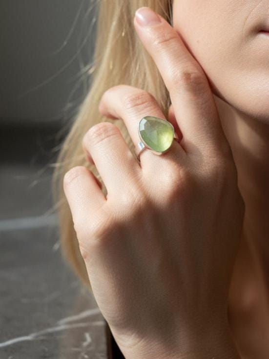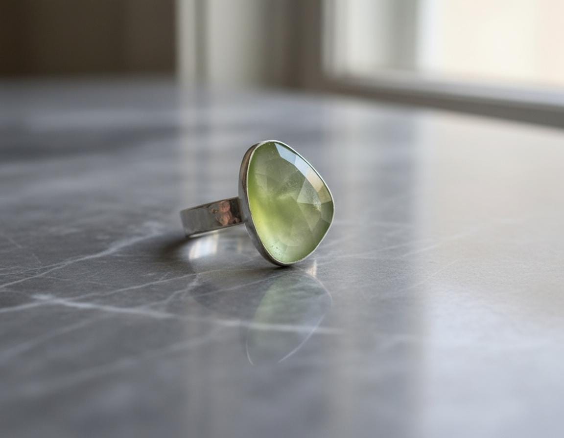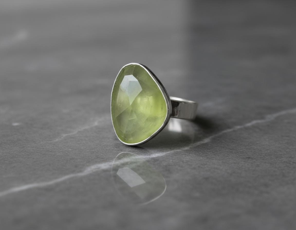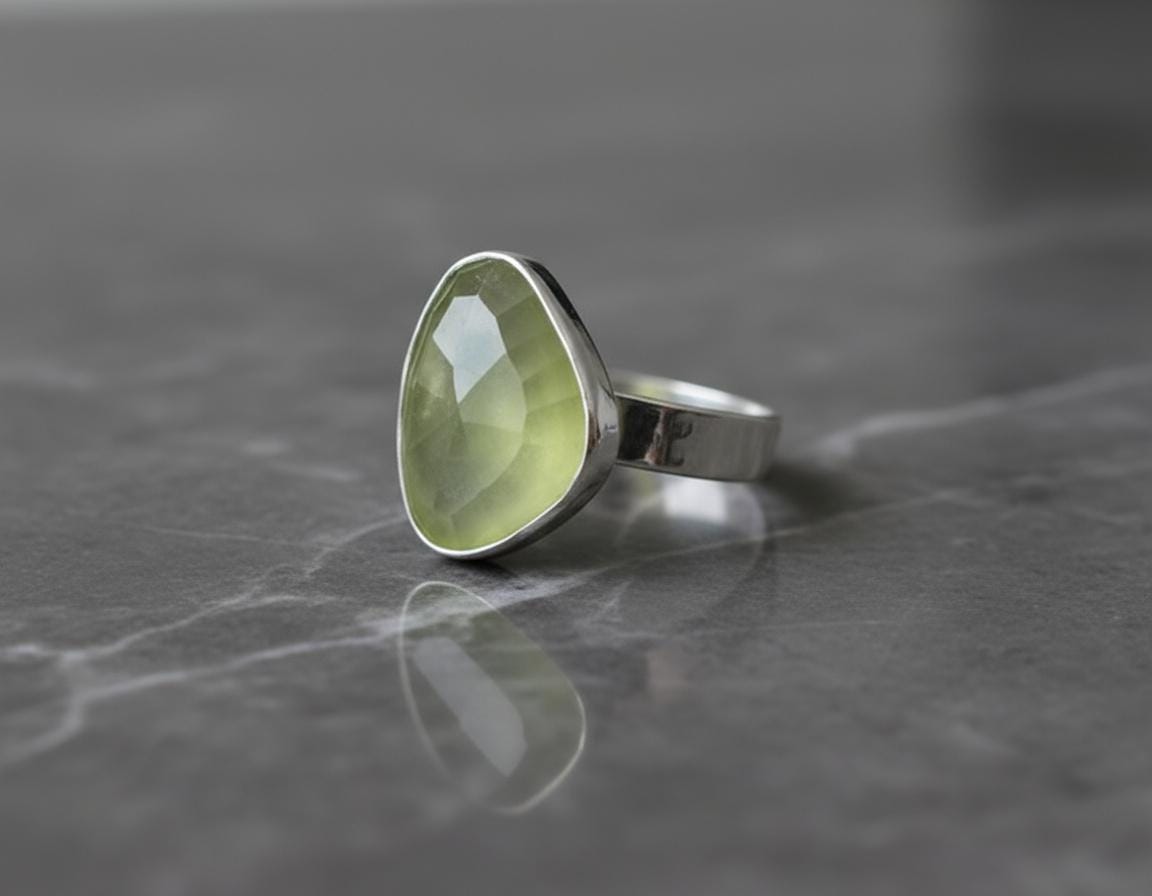 Prehnite is often called the “stone of prophecy” and is believed to inspire inner peace and harmony, making this ring not only beautiful but also meaningful.