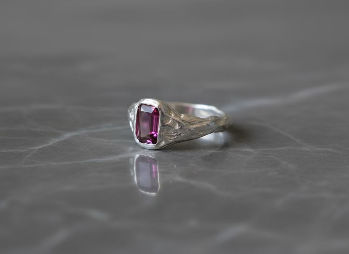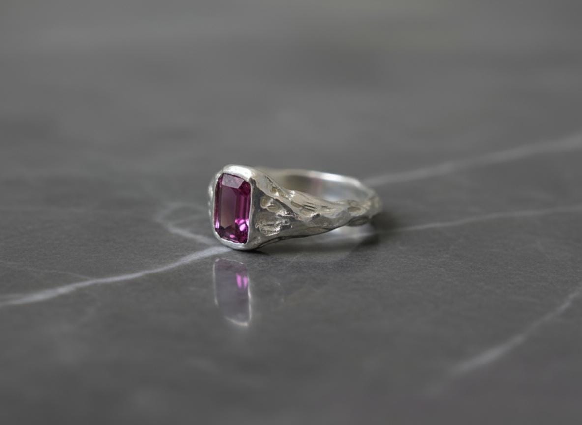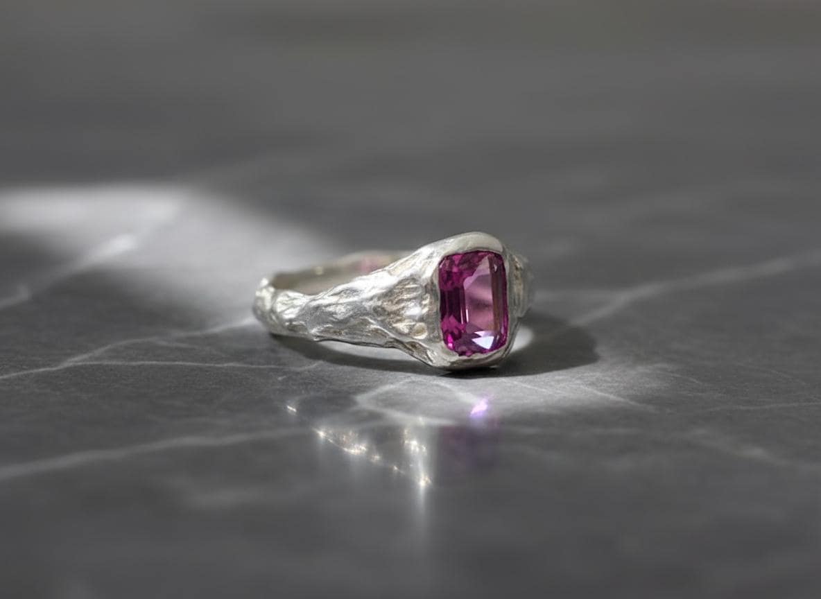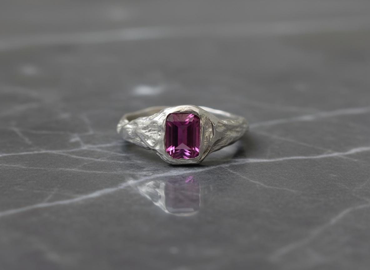 This elegant yet artistic sterling silver ring features a radiant 7x9mm pink topaz, cut in a classic emerald shape and set in a handcrafted organic band. The molten-style silver texture adds a raw, sculptural feel that contrasts beautifully with the gemstone’s bright, refined sparkle.