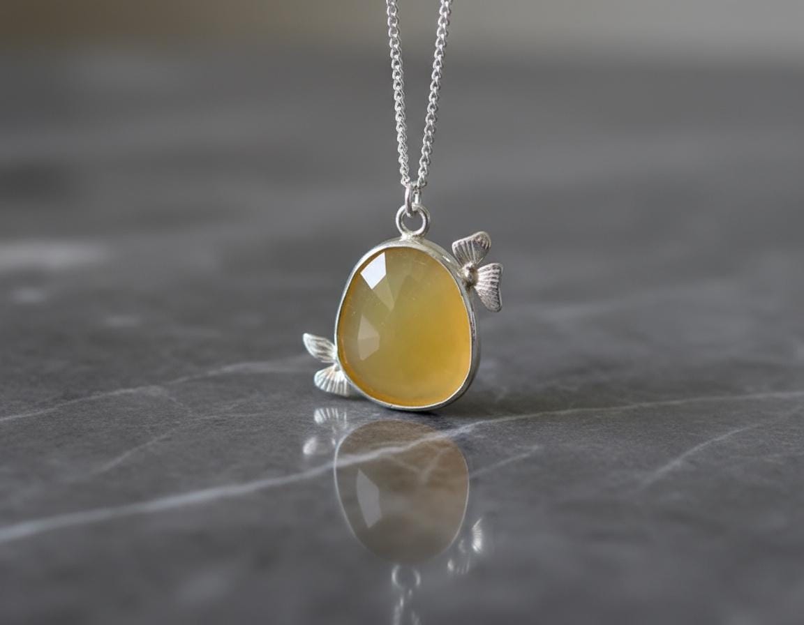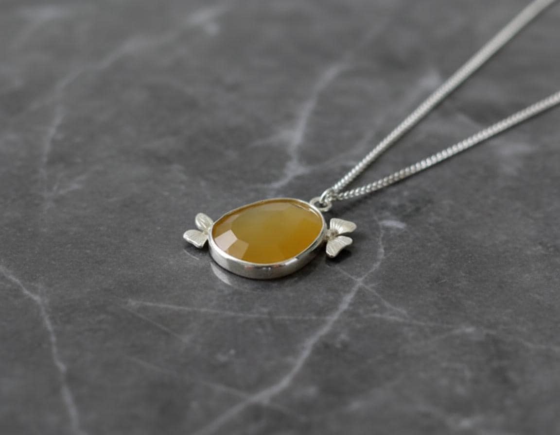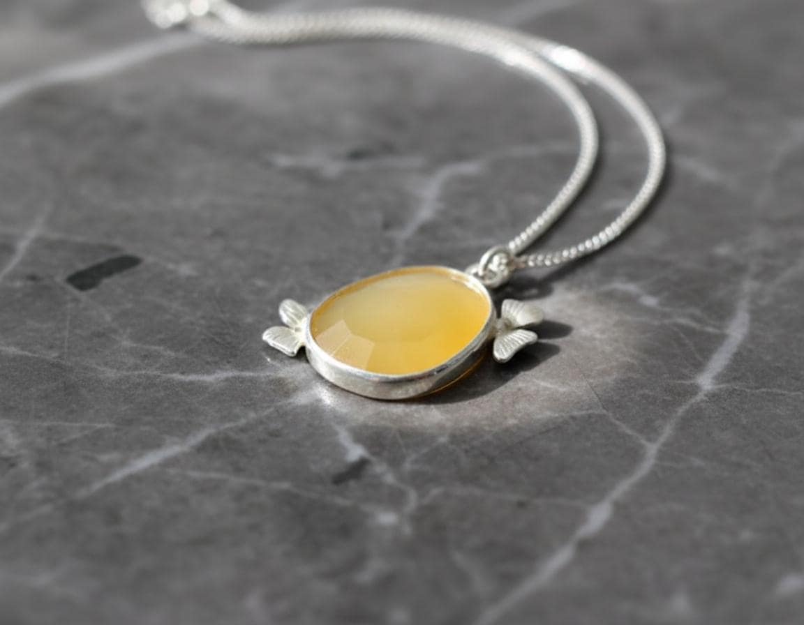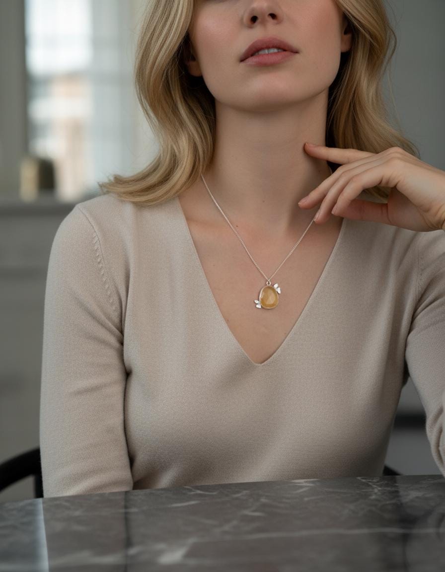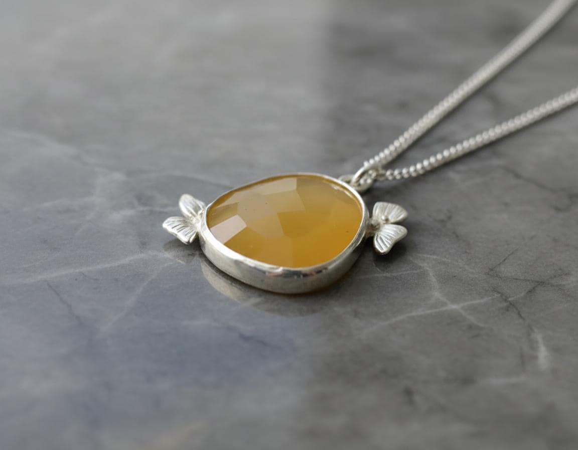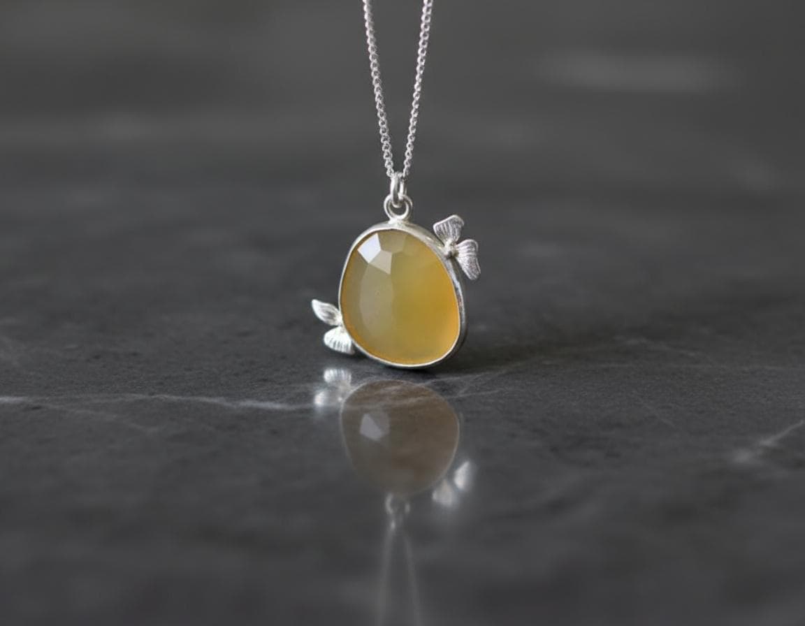 Bright and full of warmth, this sterling silver necklace features a faceted yellow calcite gemstone, measuring 16x18mm. Its golden hue is enhanced by delicate silver leaf accents on the sides, giving the piece a natural, organic charm.