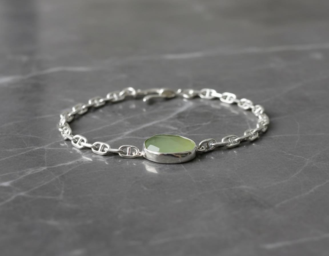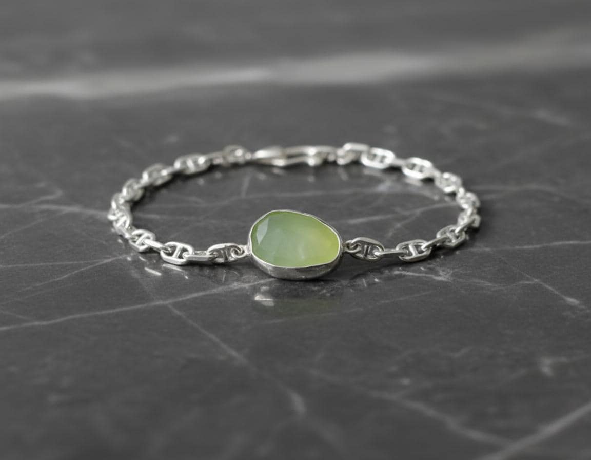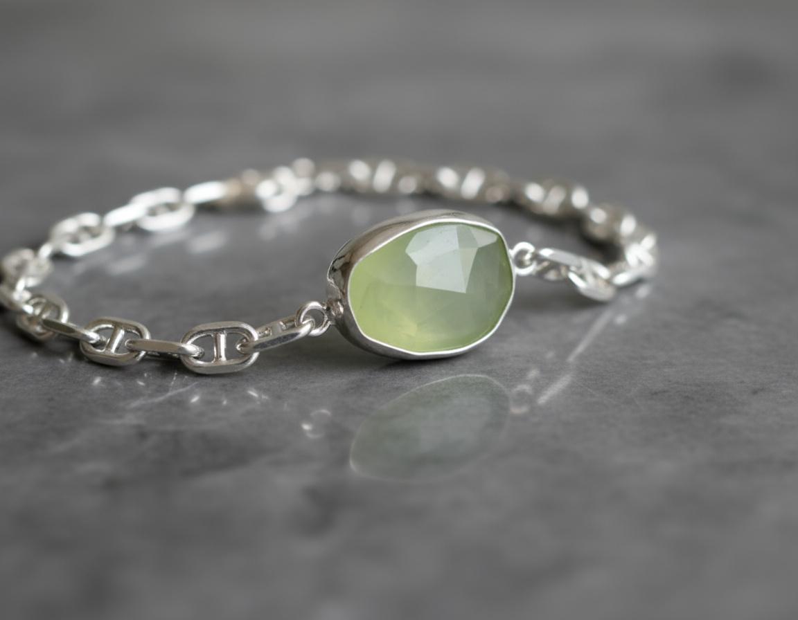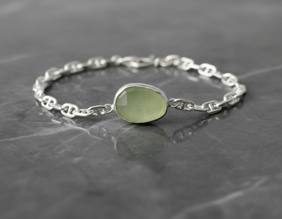 This elegant bracelet features a natural prehnite gemstone, measuring 12x15mm, bezel set in polished sterling silver. The soft green hues of prehnite glow beautifully against the silver, making this bracelet a unique and versatile piece.