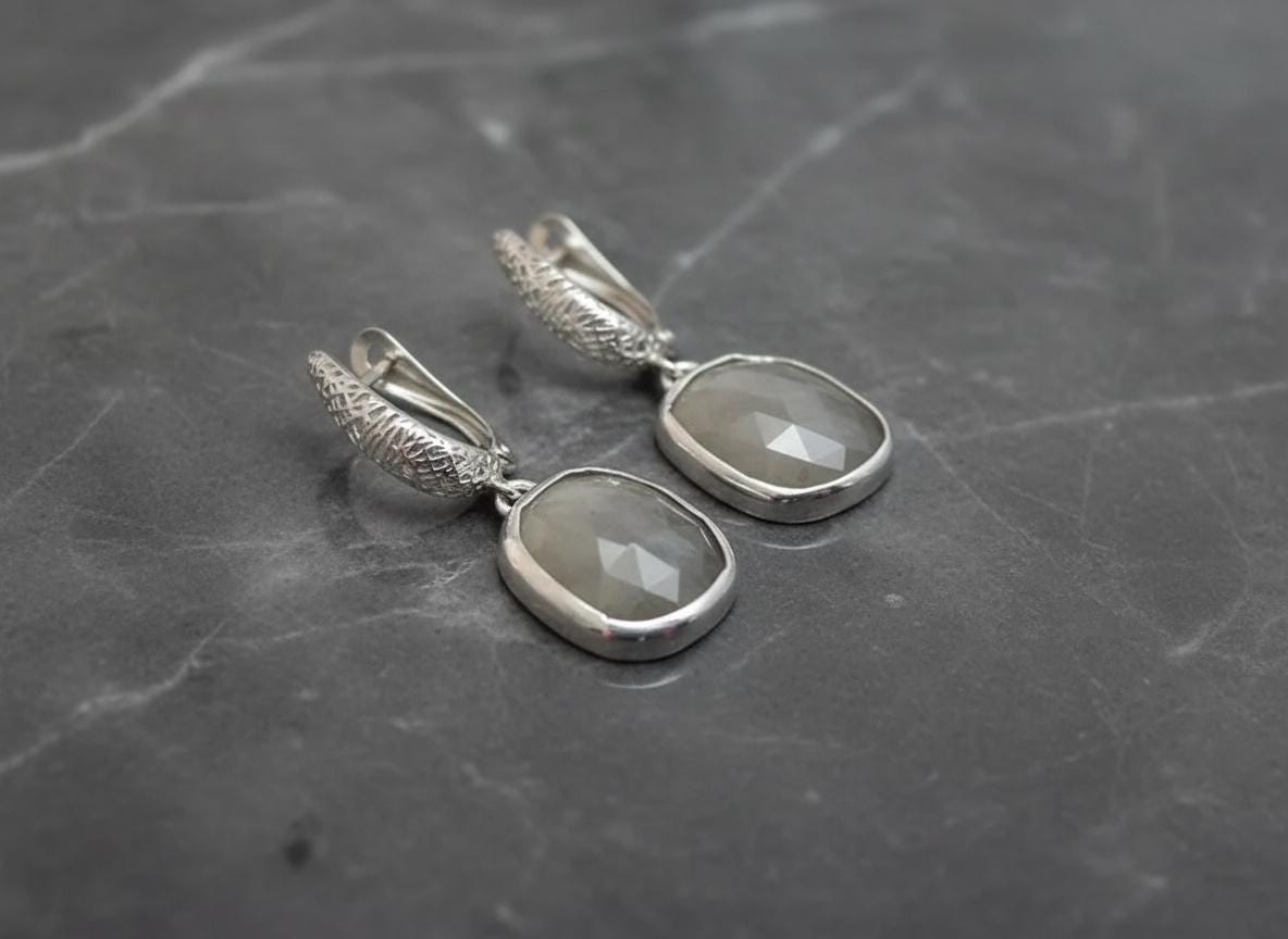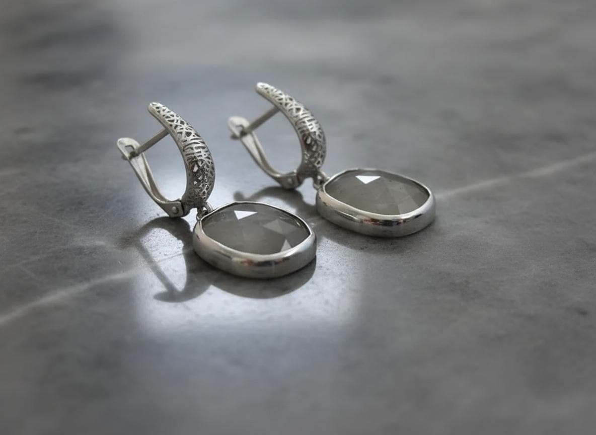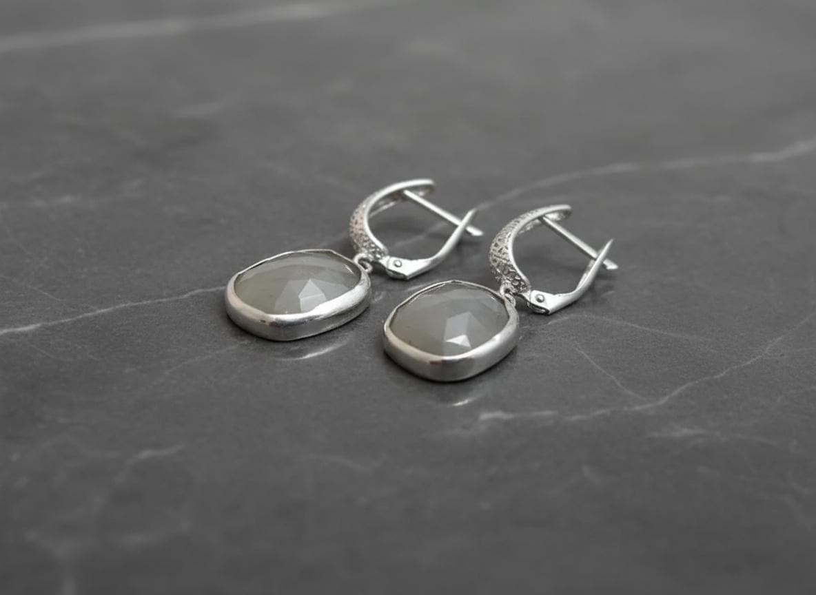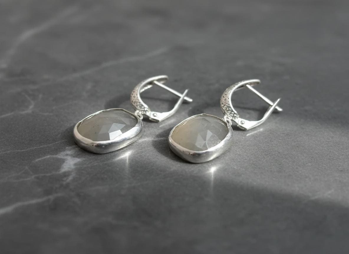 These elegant sterling silver dangle earrings feature soft, cloudy aquamarine gemstones in rose-cut cushion shapes, set in polished bezels. They hang from textured hoops with secure clasps, blending subtle shimmer with timeless design. A perfect gift for those who love serene tones and artisan style.