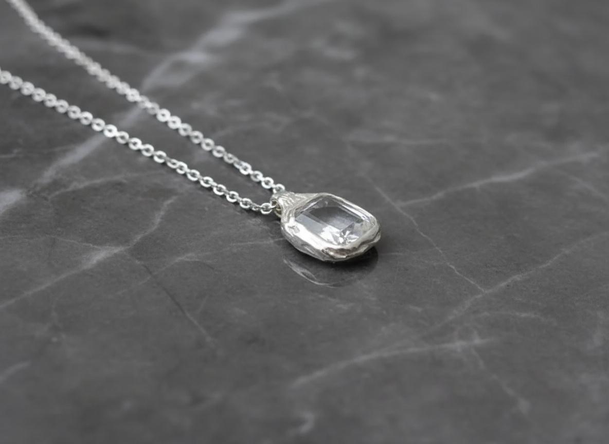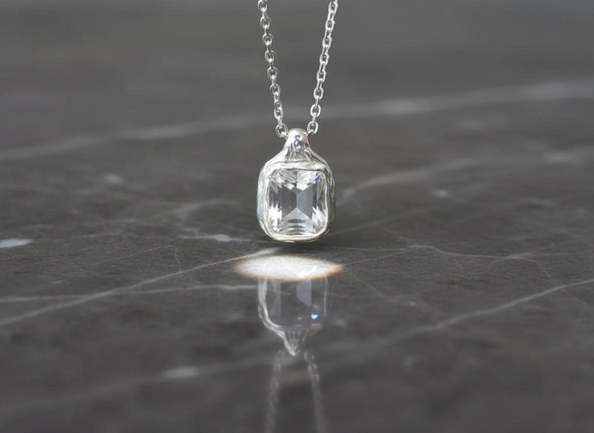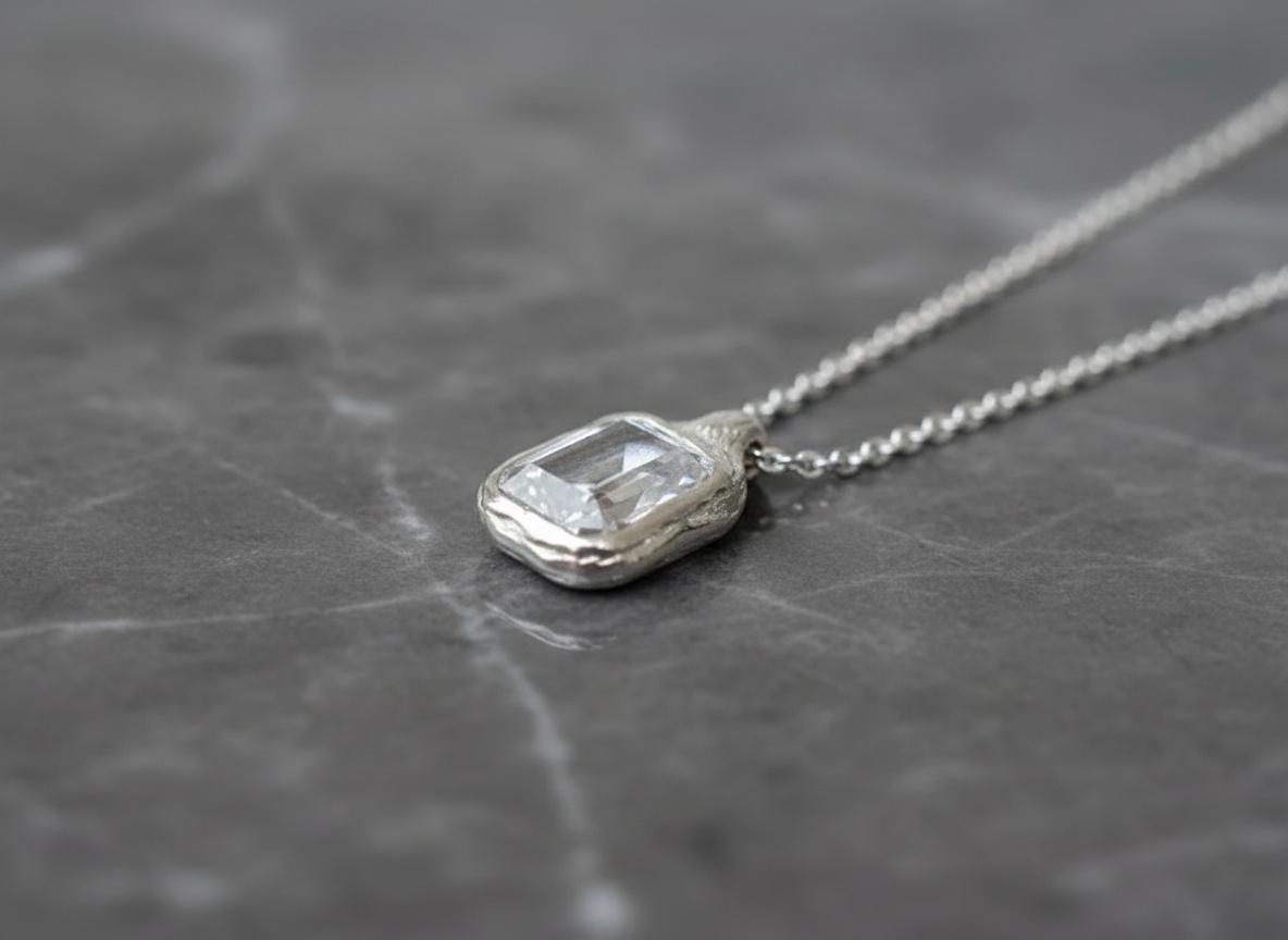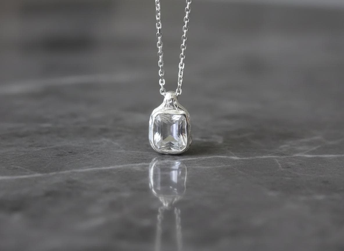 Elegant and timeless, this sterling silver necklace features a sparkling 8x10mm white topaz gemstone. The emerald-cut stone is bezel set in an organically shaped silver frame, handcrafted to highlight the stone’s clarity and brilliance.