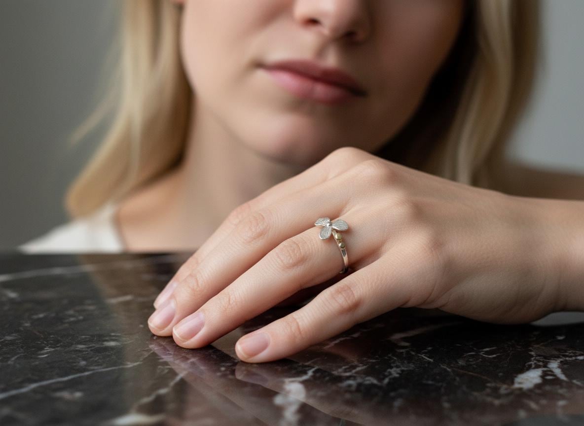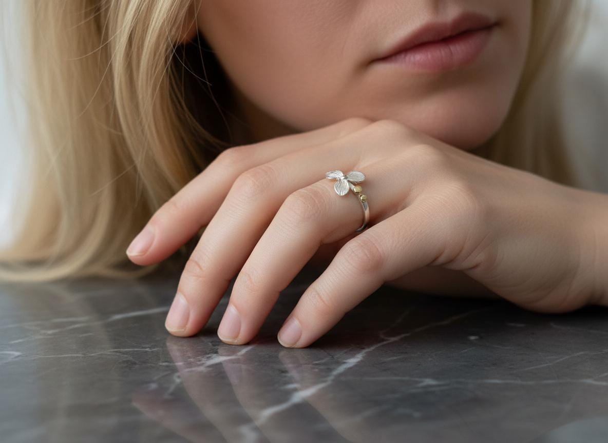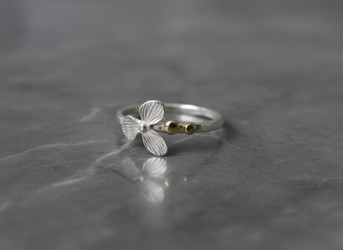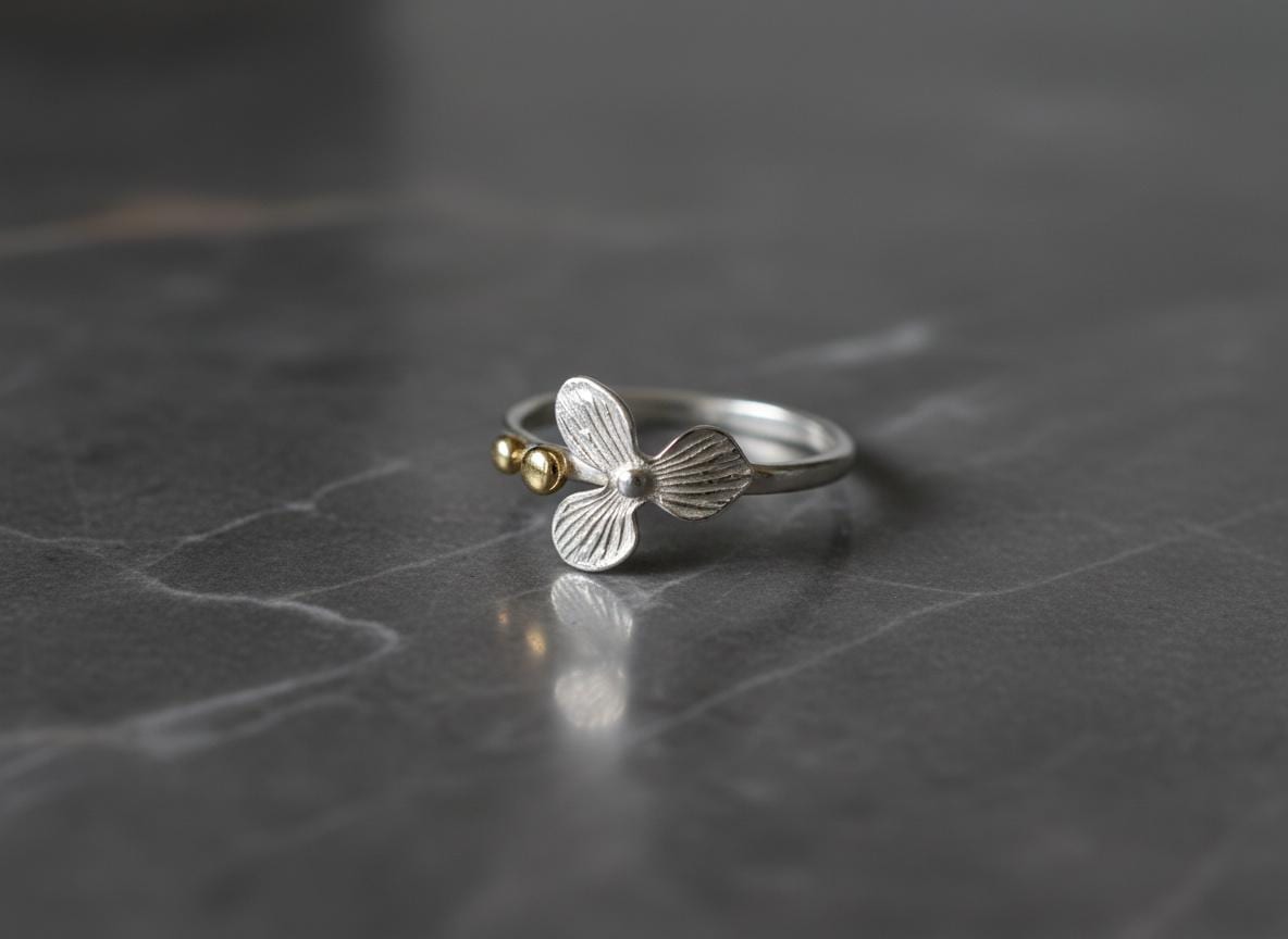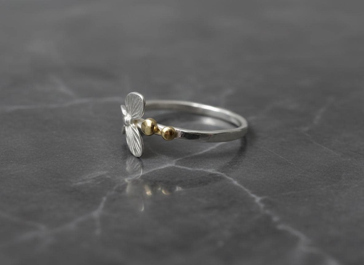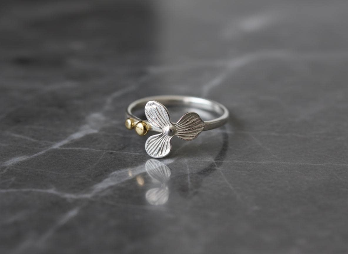 This delicate sterling silver ring is adorned with a detailed three-petal flower and accented by two solid 14K gold balls for a touch of warmth and contrast. Handcrafted with care, the 1.8mm hammered shank adds texture and charm, making it a perfect everyday piece or a thoughtful gift for nature lovers. Ideal for stacking or wearing solo, this size 7 ring blends organic elegance with timeless design.