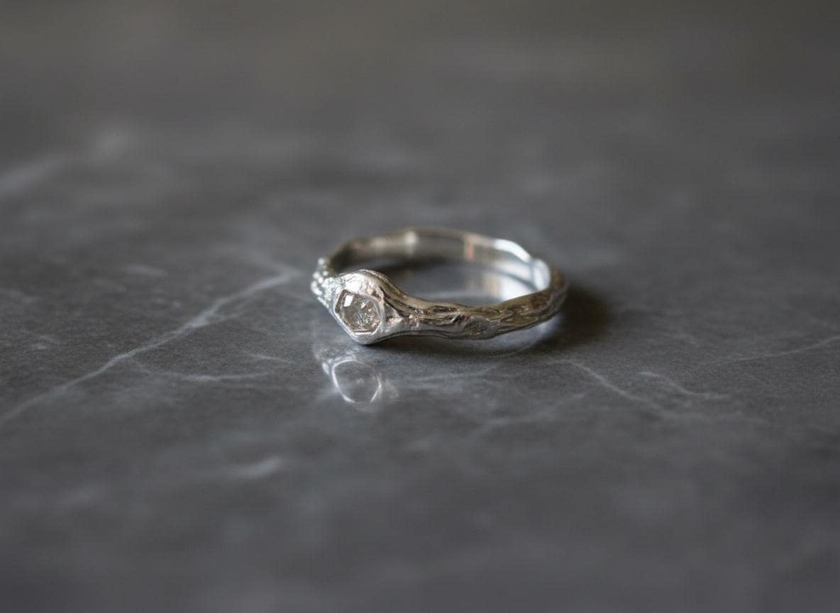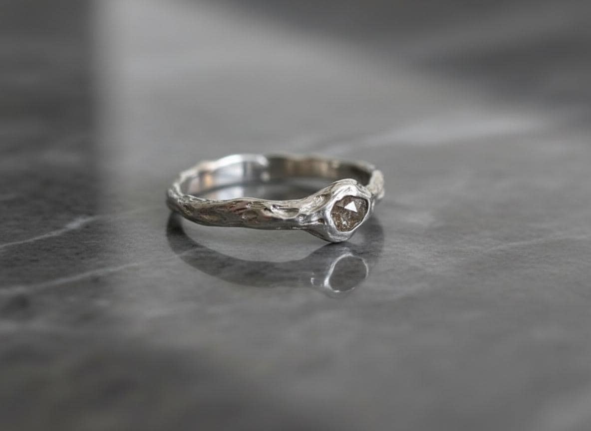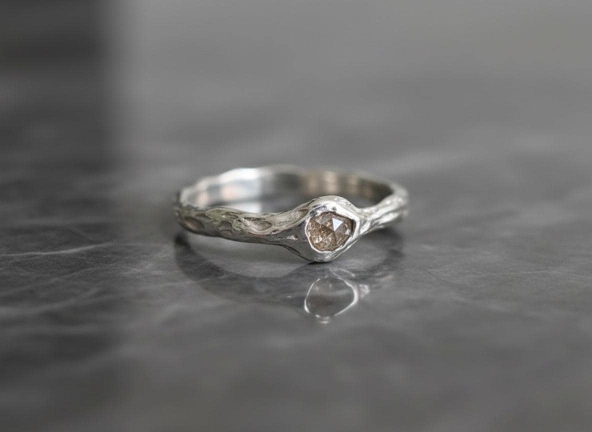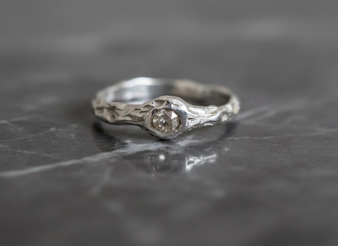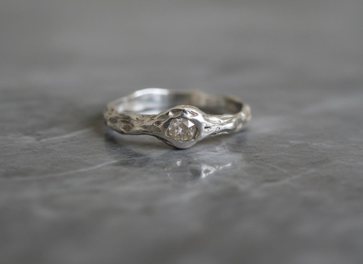 A soulful and earthy piece — this sterling silver ring features a 3.5mm rough natural diamond, captured in an organic, molten-textured band. The raw diamond retains its natural shape and character, giving the ring a beautifully unpolished, elemental charm.