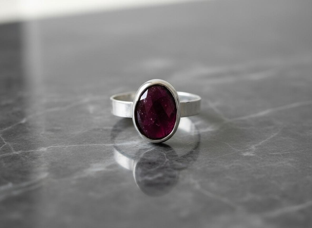 A bold yet elegant piece for gemstone lovers — this sterling silver ring features a deep wine-red oval ruby, faceted to catch the light with every movement. The stone measures 10x12mm and is set in a smooth bezel for a timeless look. The solid silver band is 3.5mm wide, offering both durability and comfort for everyday wear.