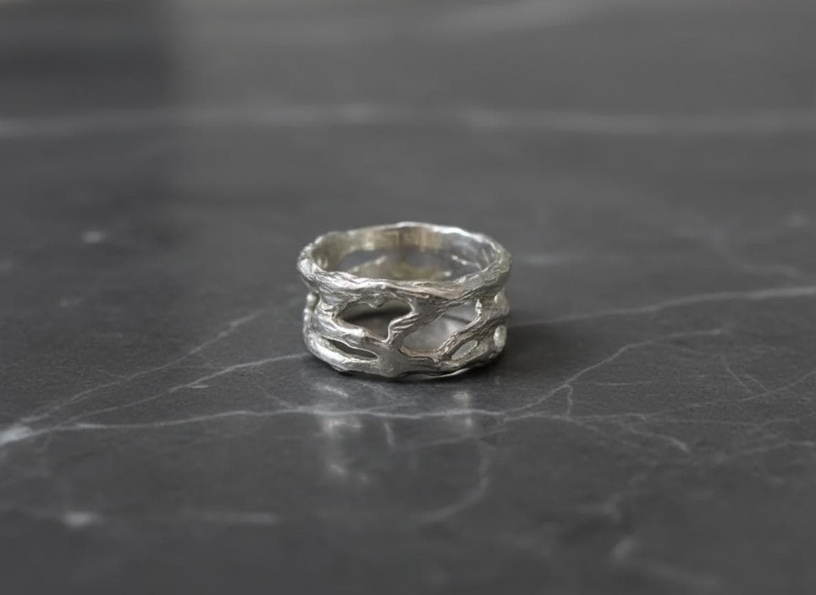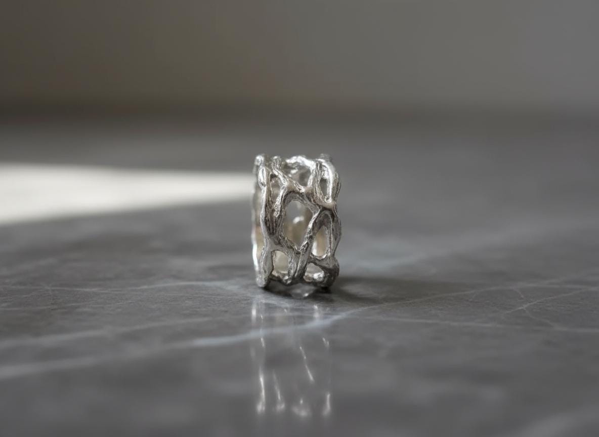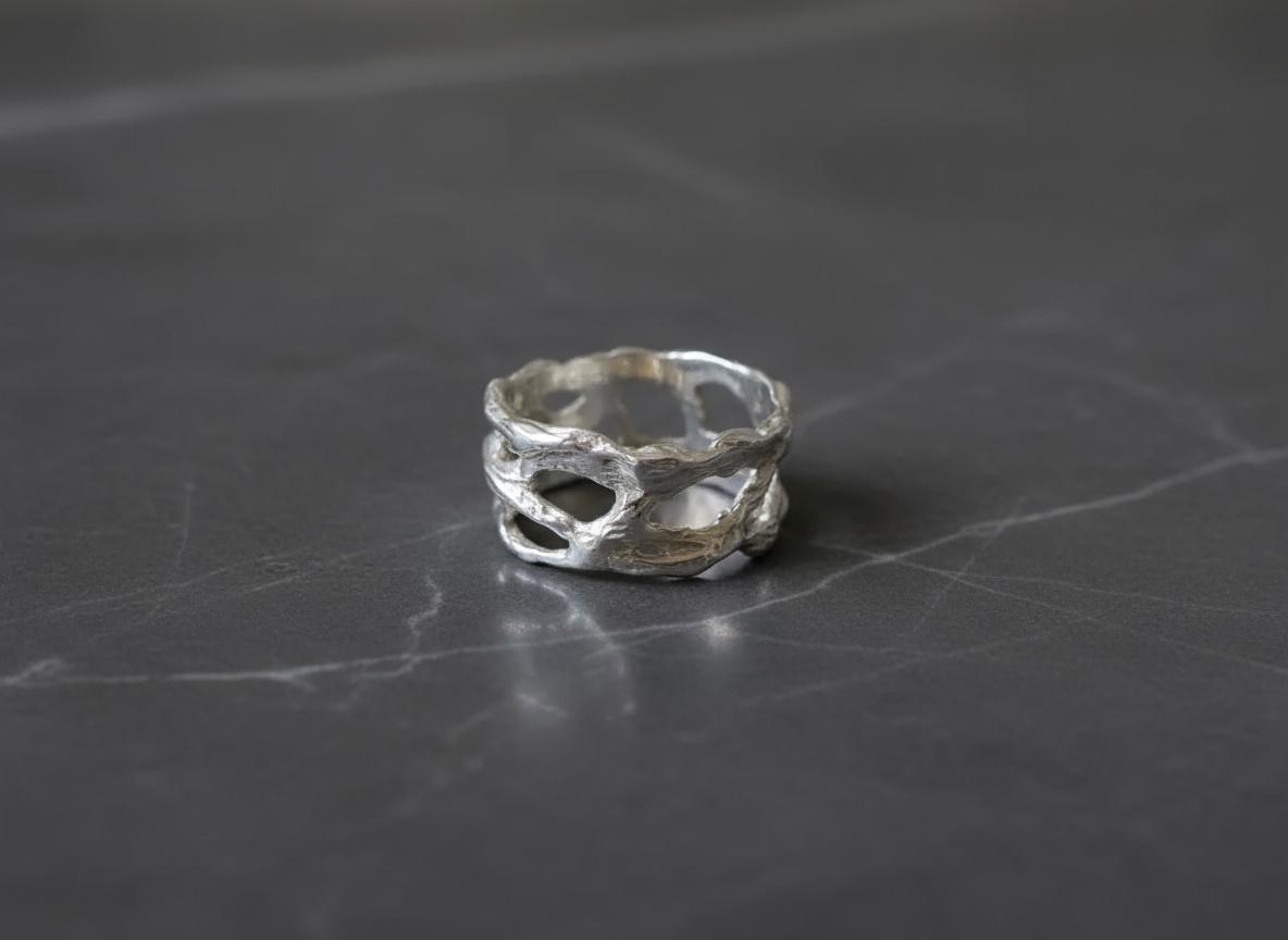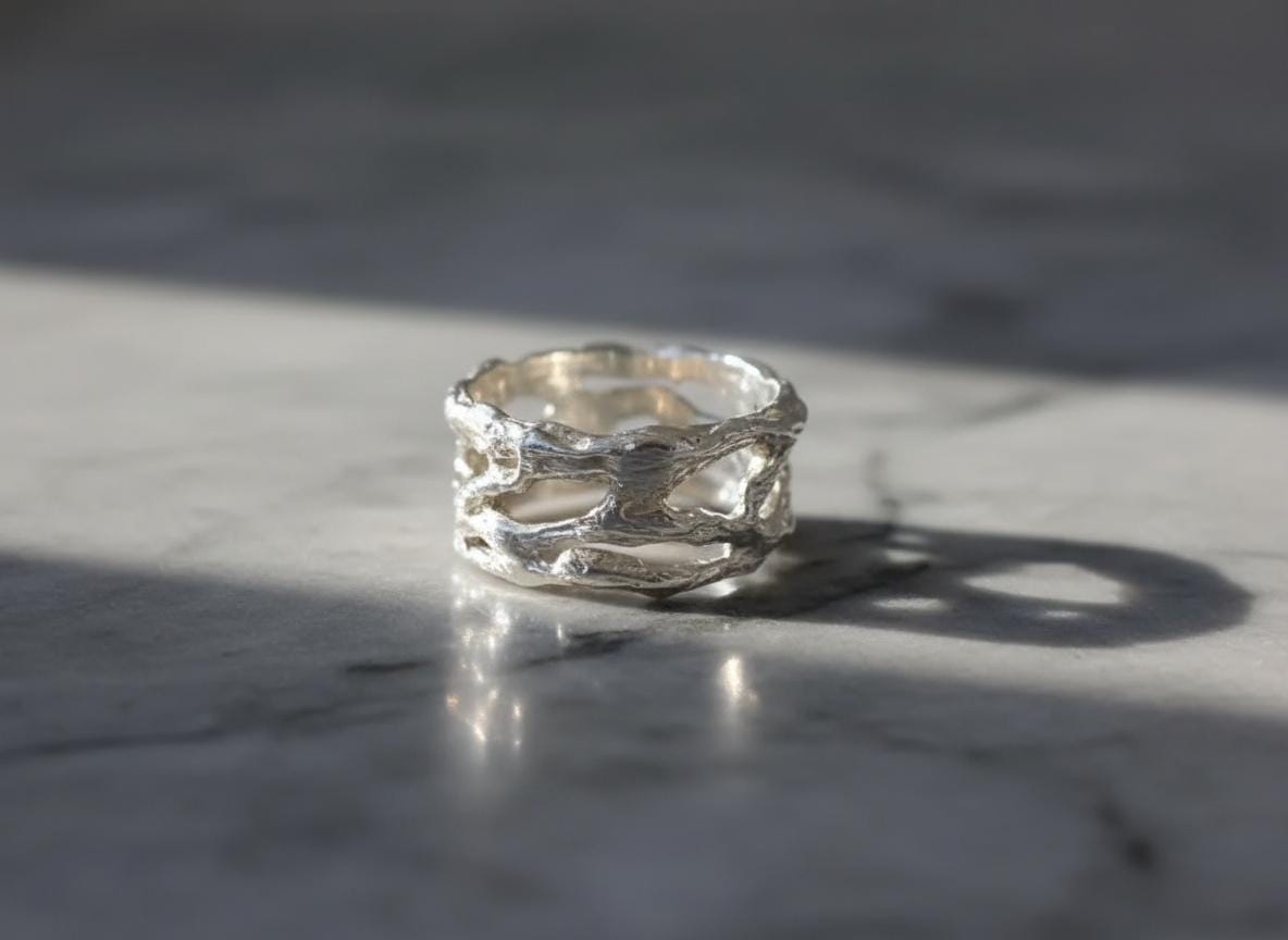 A bold yet refined design — this sterling silver ring features an openwork, organic structure inspired by the fluid forms of nature. Each curve and hollow is sculpted by hand, creating a one-of-a-kind texture that plays beautifully with light and shadow.