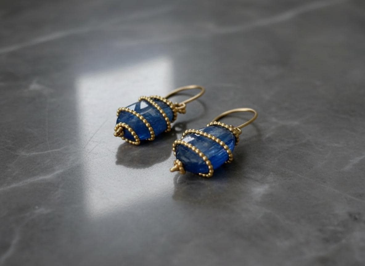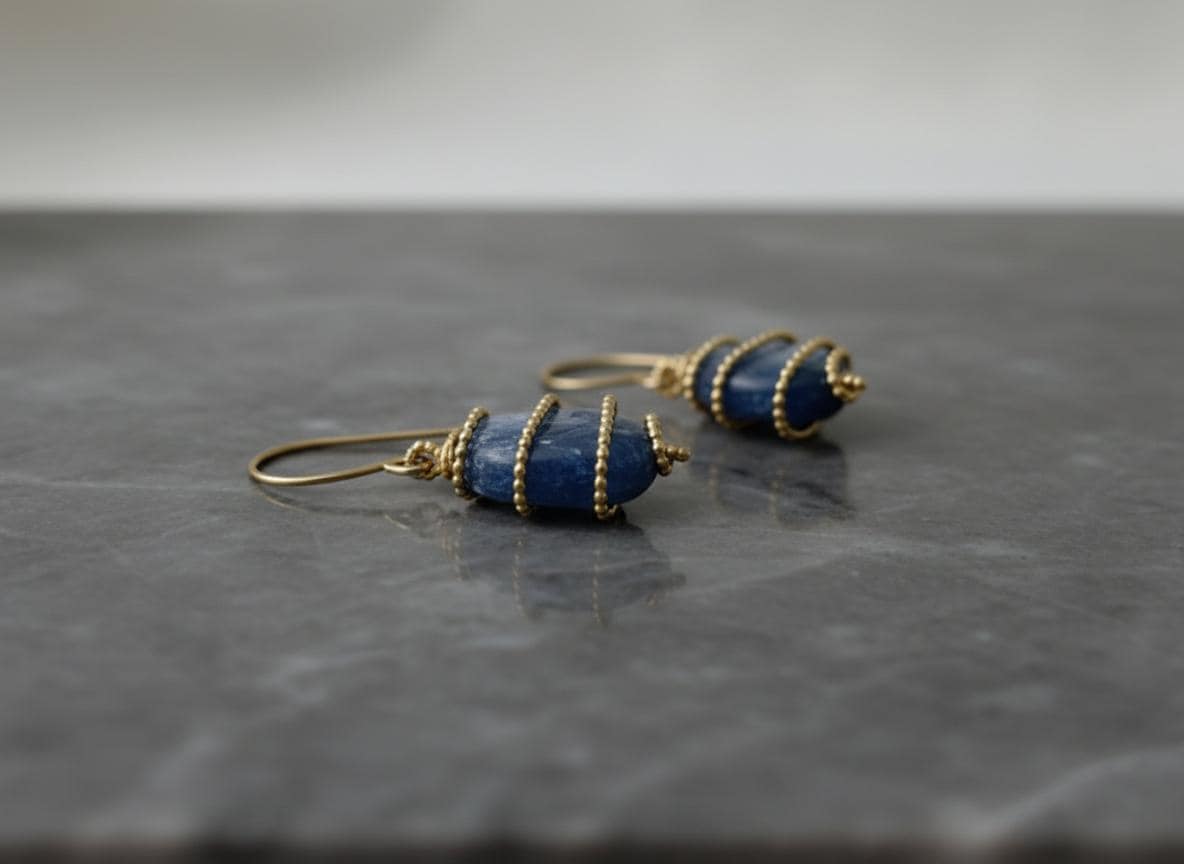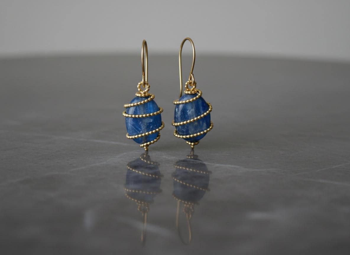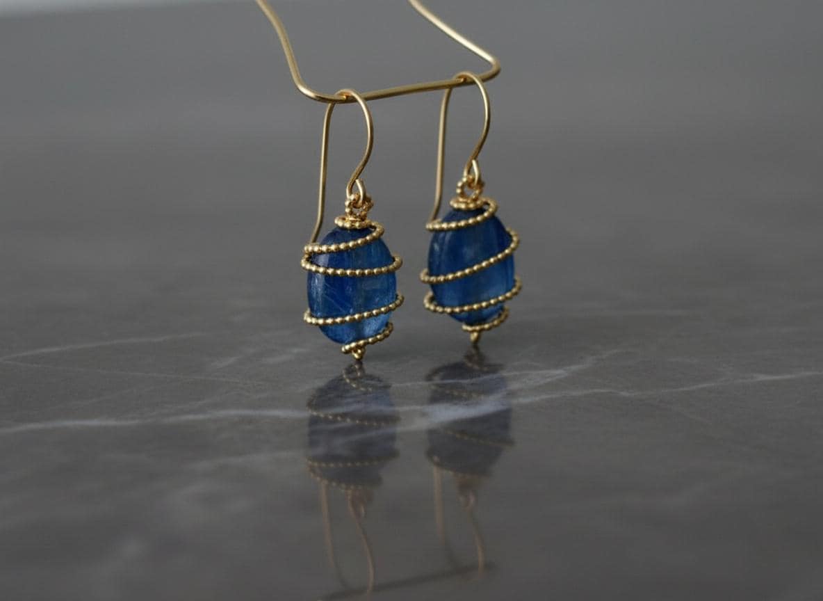 These stunning gold filled kyanite earrings combine the deep, mesmerizing beauty of natural blue kyanite gemstones with the timeless elegance of gold. Each oval kyanite, measuring 10x14mm, is hand-wrapped with delicate gold filled beaded wire, creating a unique spiral design that catches the light beautifully. The lightweight and comfortable French hook style makes them perfect for both everyday wear and special occasions.