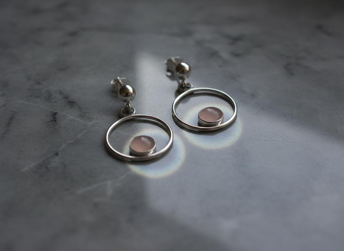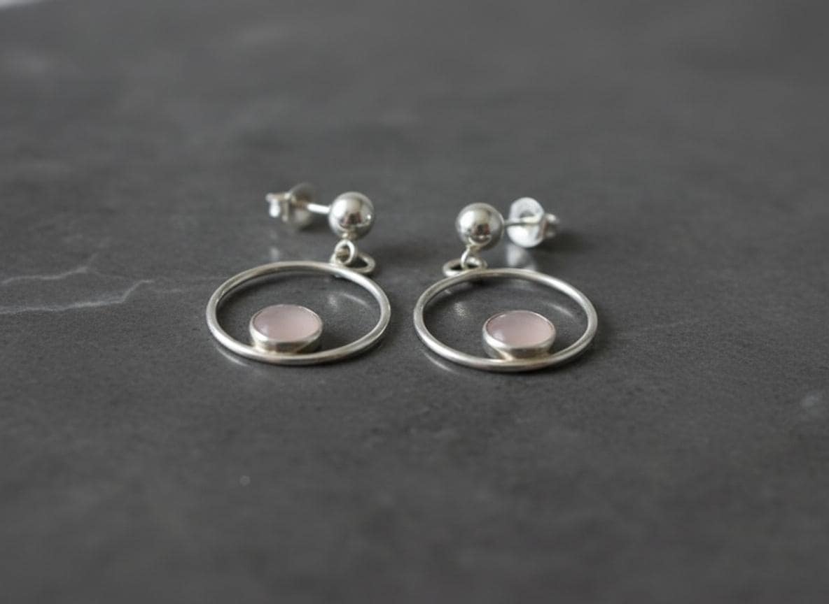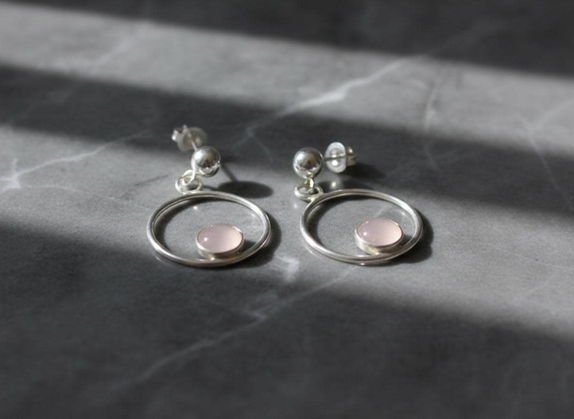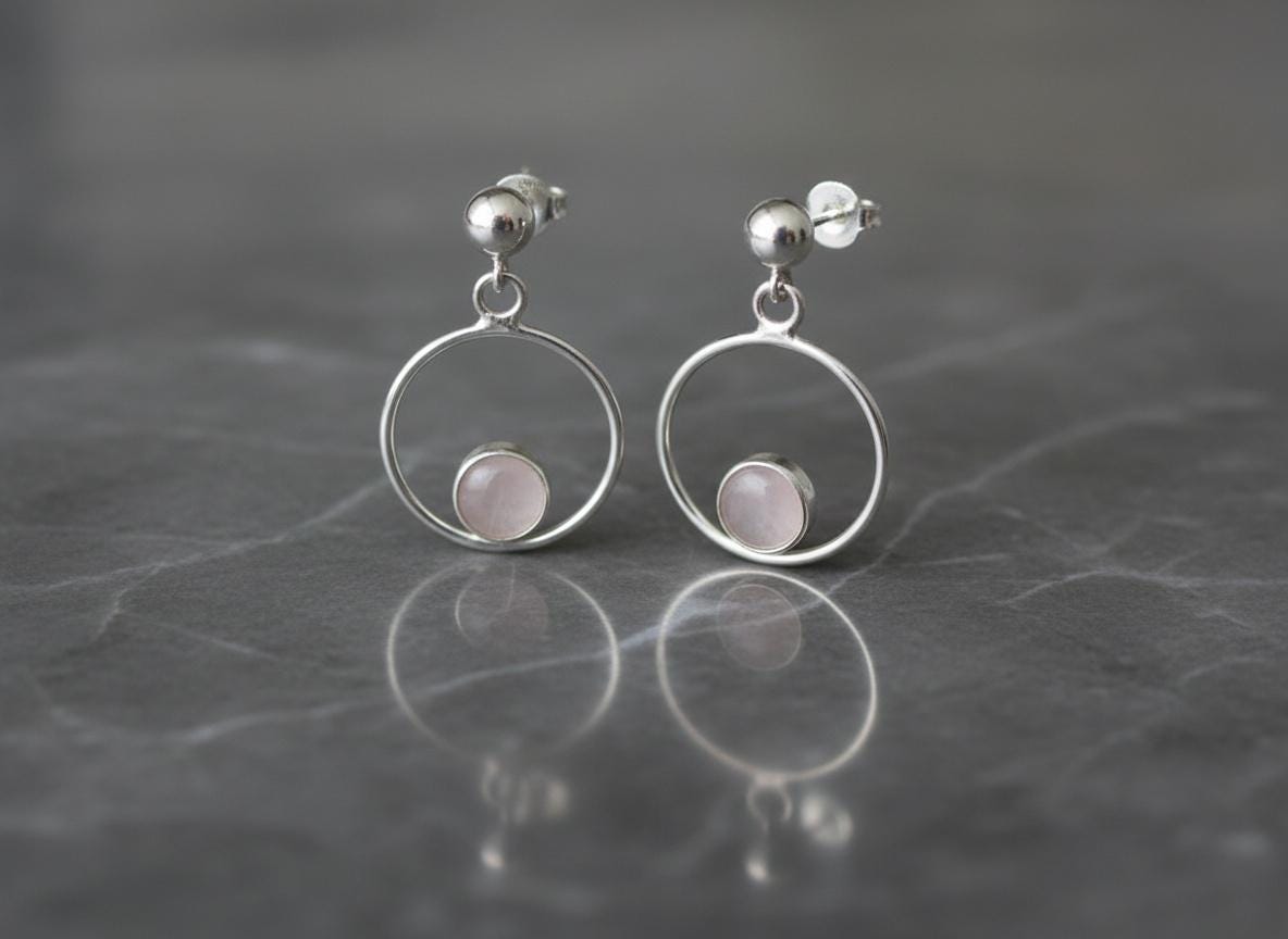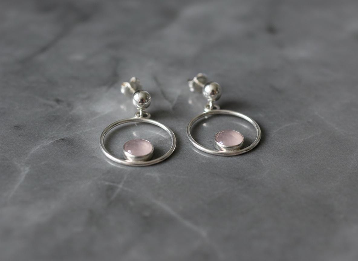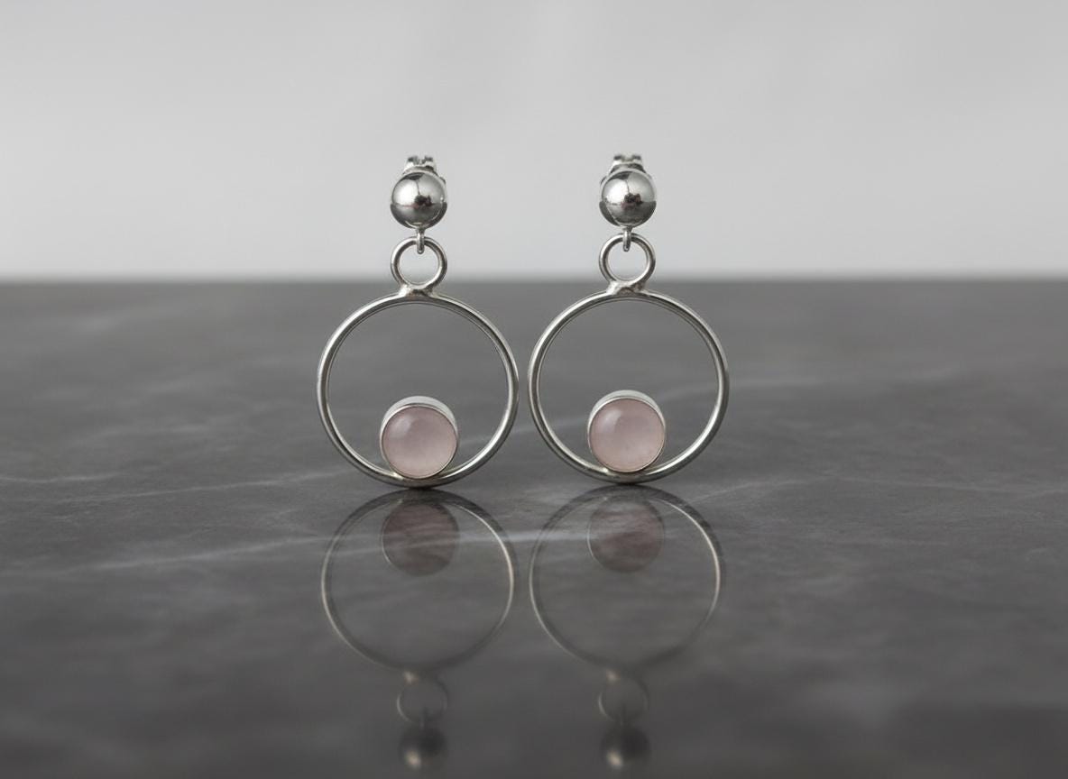 These airy earrings bring softness and balance to your look. Handmade from sterling silver, the open circle frames a gentle pink rose quartz cabochon, bezel-set for a minimalist finish. The natural stone glows with soft light, like a moon through mist. Lightweight and graceful for day or evening.