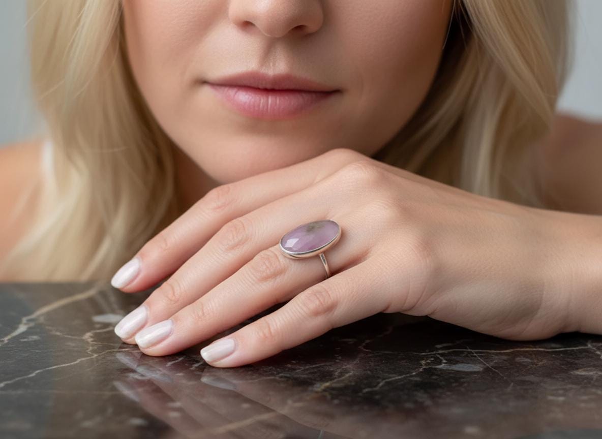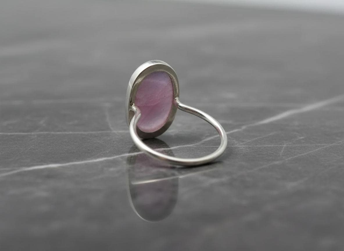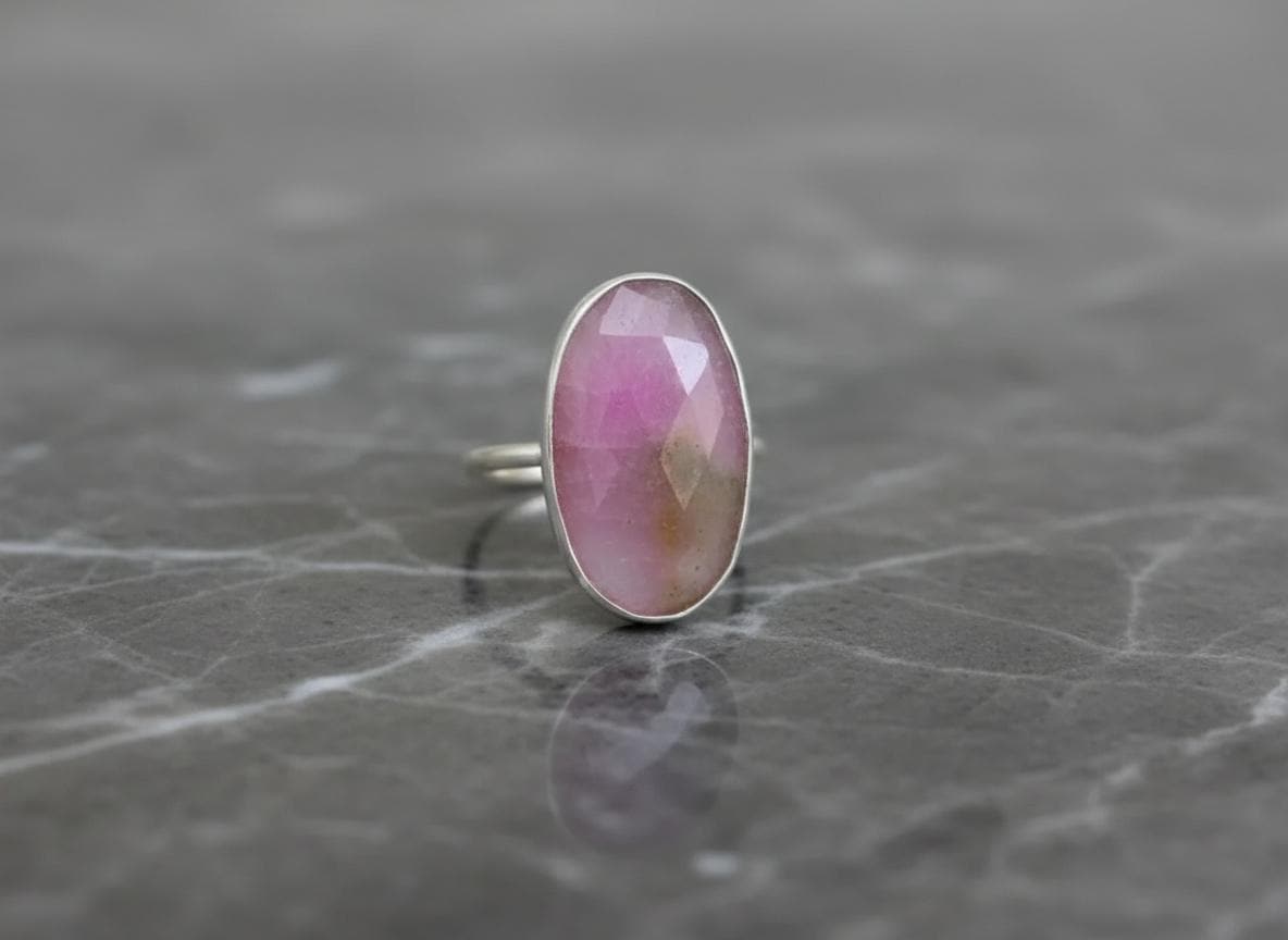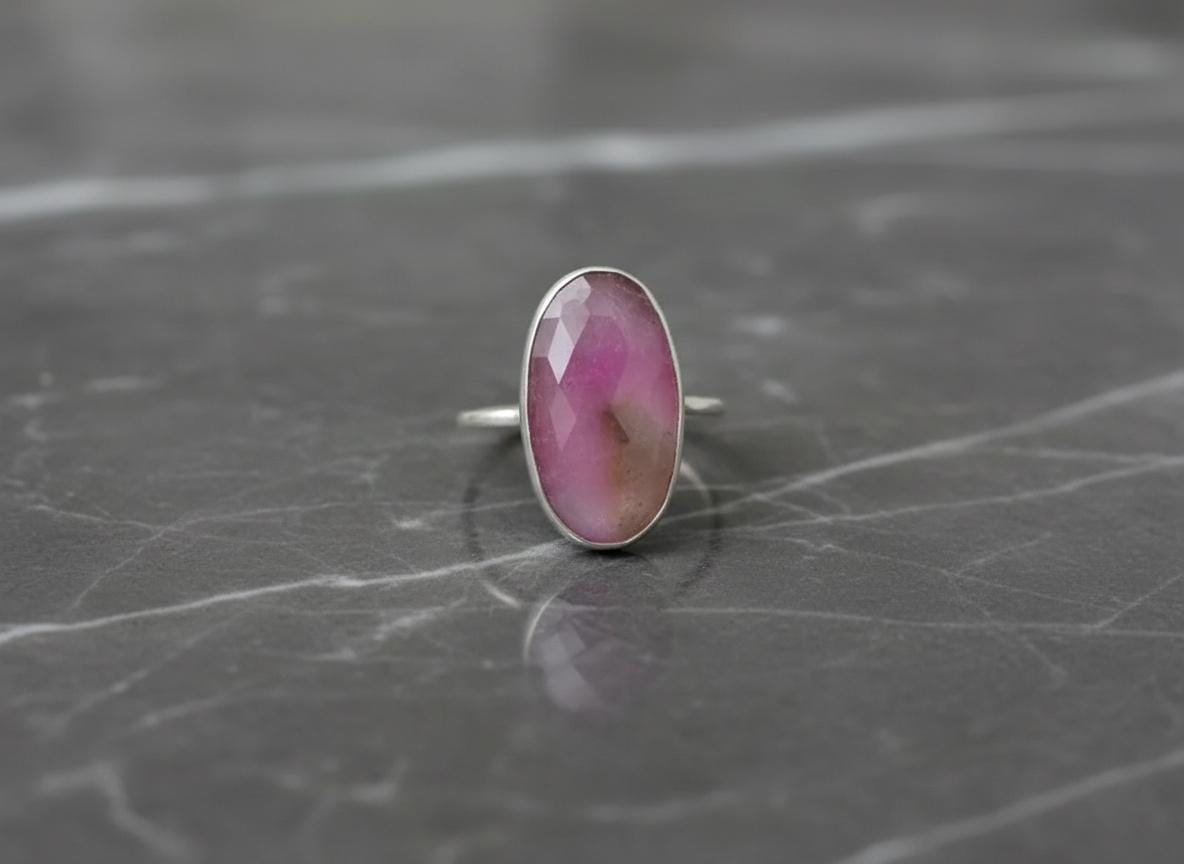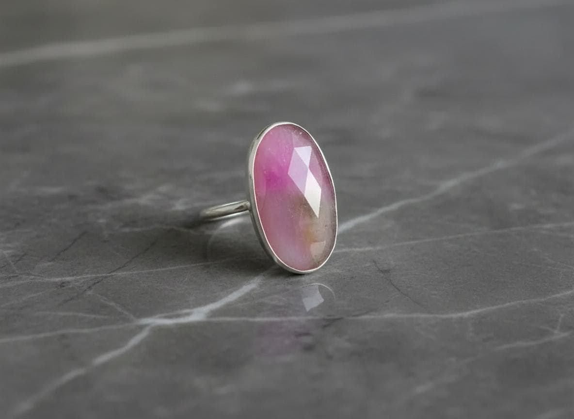 Bold yet elegant, this handcrafted ring features a striking oval pink sapphire set in a smooth sterling silver bezel. The faceted surface catches the light, revealing subtle natural inclusions that make each ring truly one of a kind.