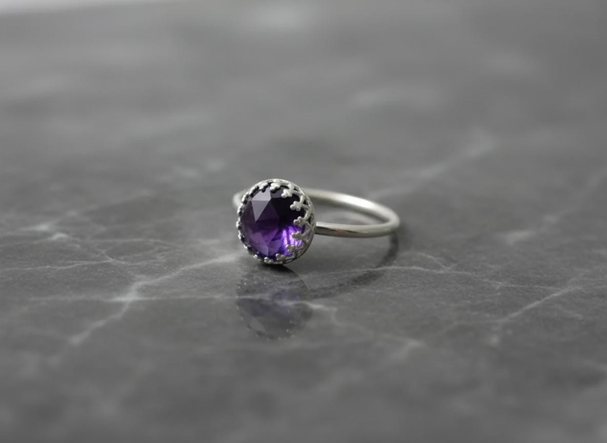 Elevate your style with this handmade sterling silver amethyst ring, featuring a stunning 8mm rose-cut purple cabochon gemstone. The deep, royal violet hue of the amethyst catches the light beautifully, while the intricate crown bezel setting adds a touch of vintage charm. Crafted with a slender, polished silver band, this ring blends timeless elegance with everyday wearability.