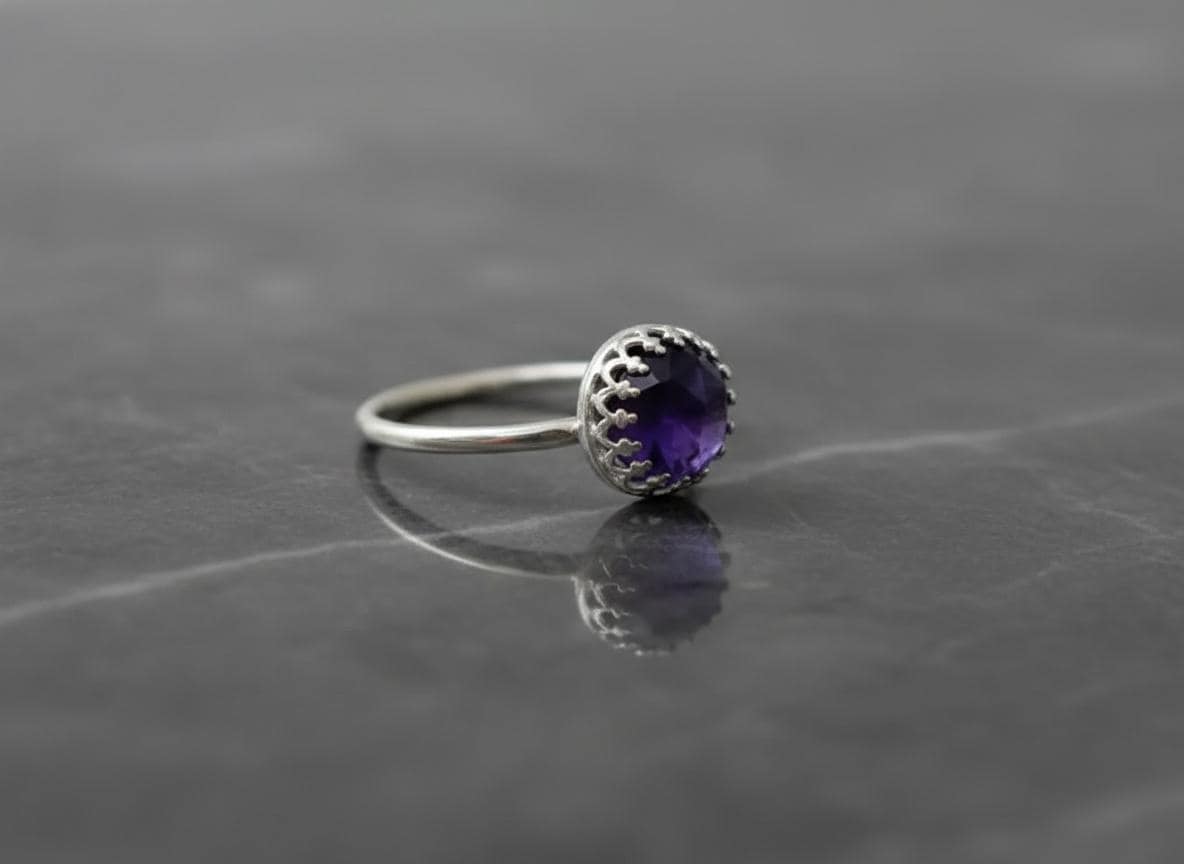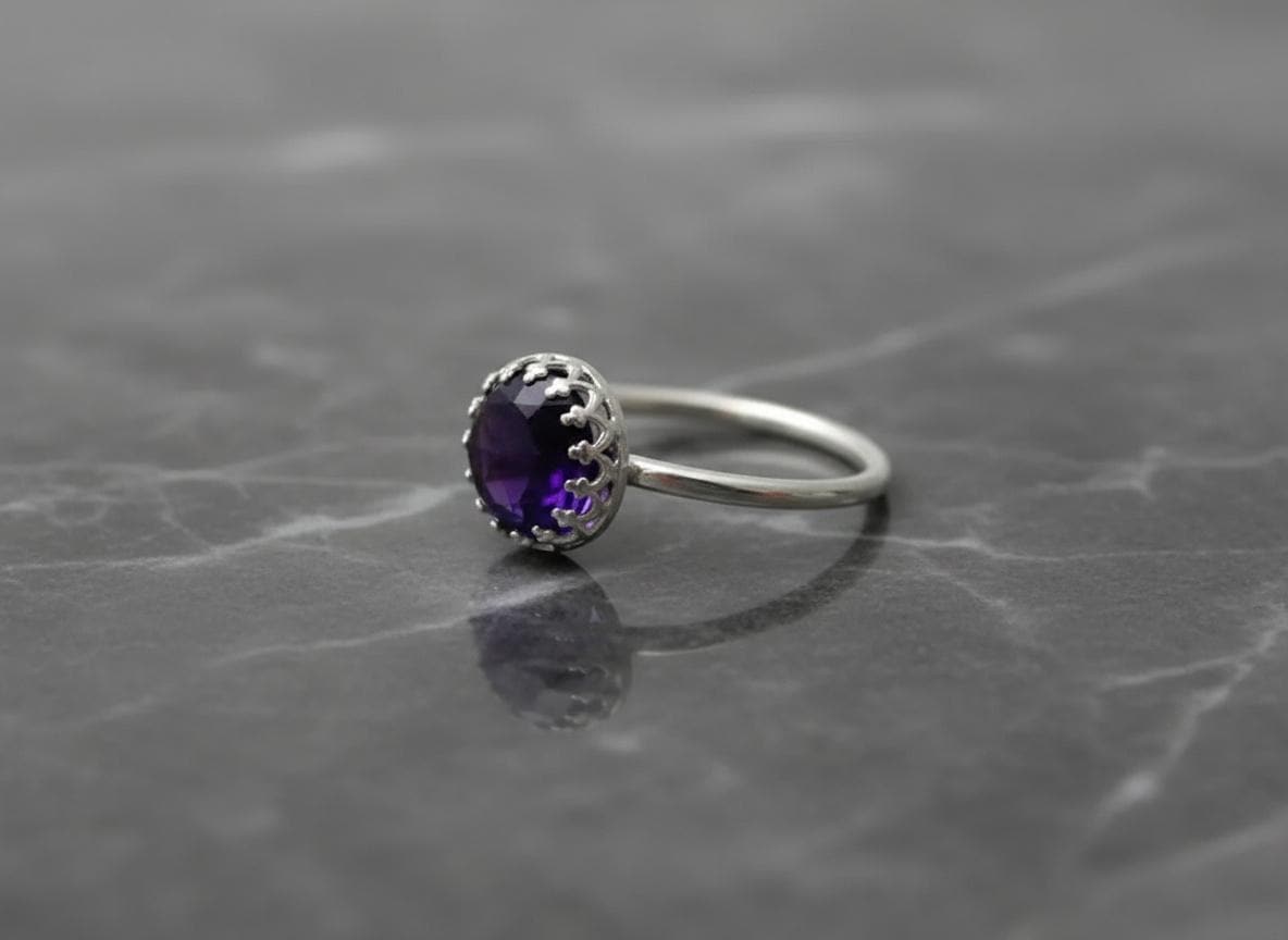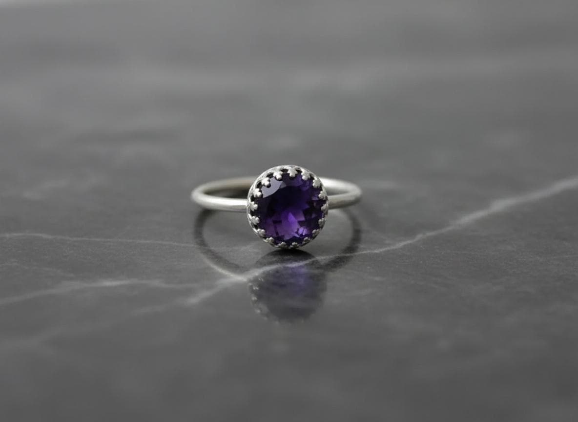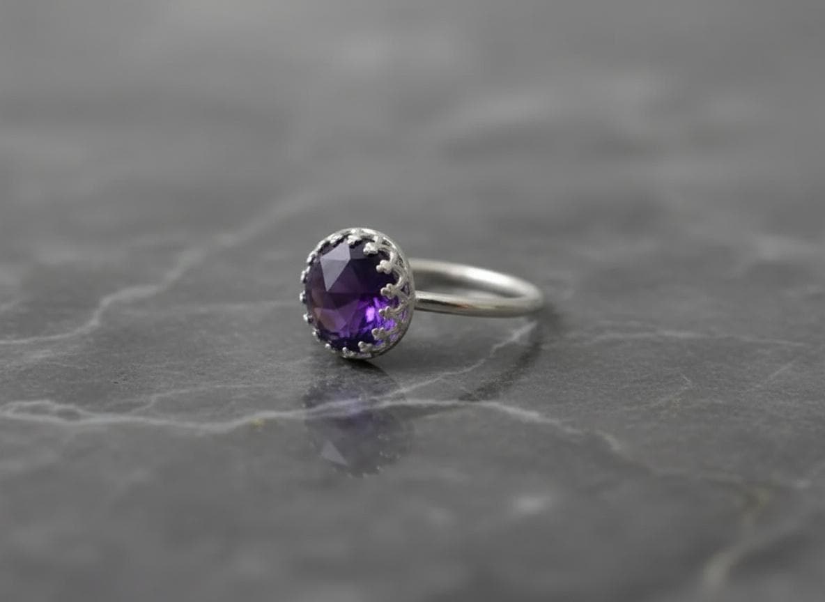 Amethyst, the February birthstone, is often associated with clarity, calm, and protection. This gemstone’s unique rose-cut facets enhance its brilliance and depth, making it perfect as a birthstone ring, promise ring, or statement piece. Each ring is handmade to order and available in all US sizes.