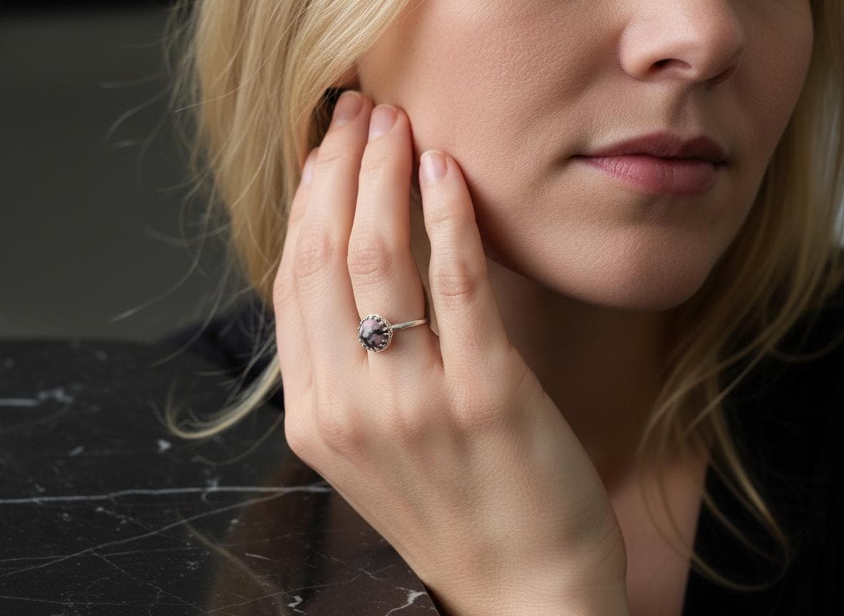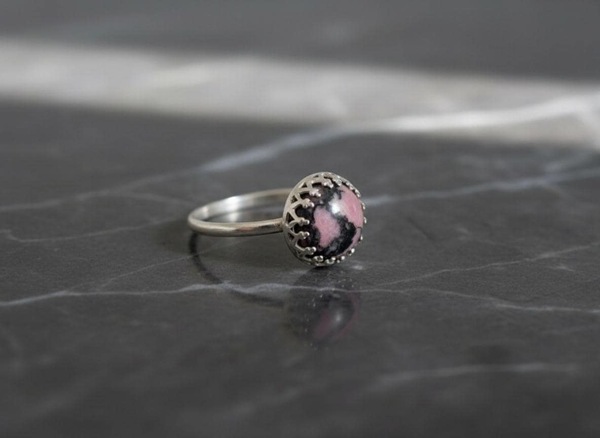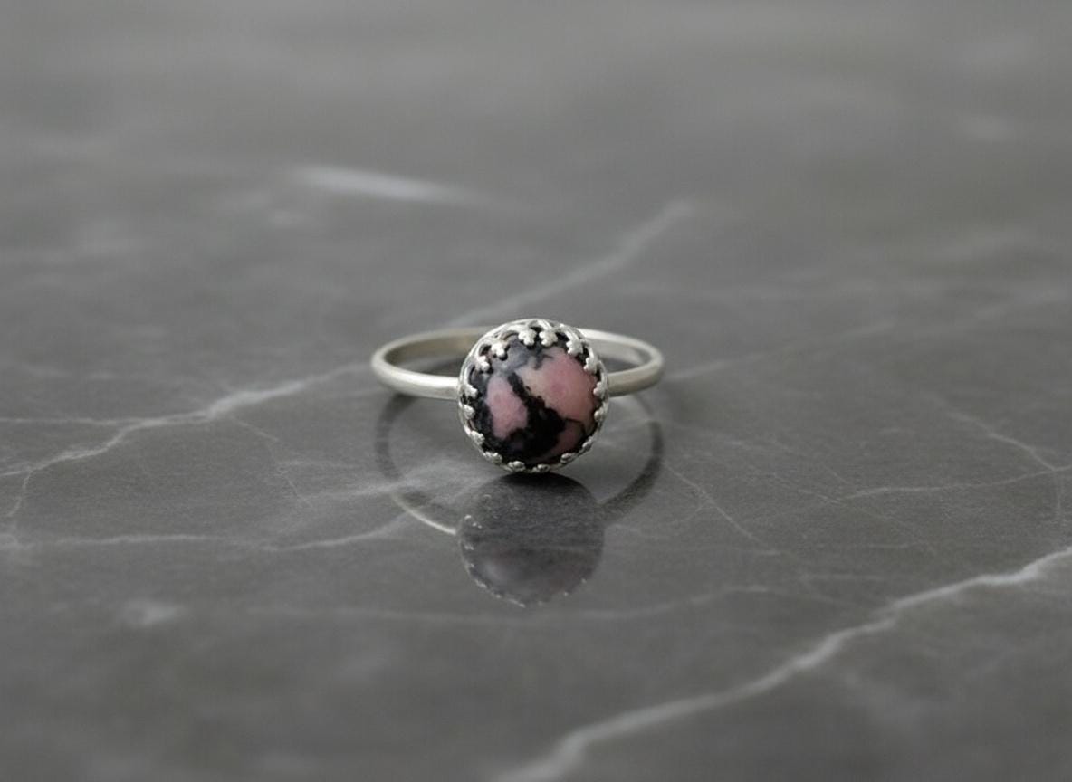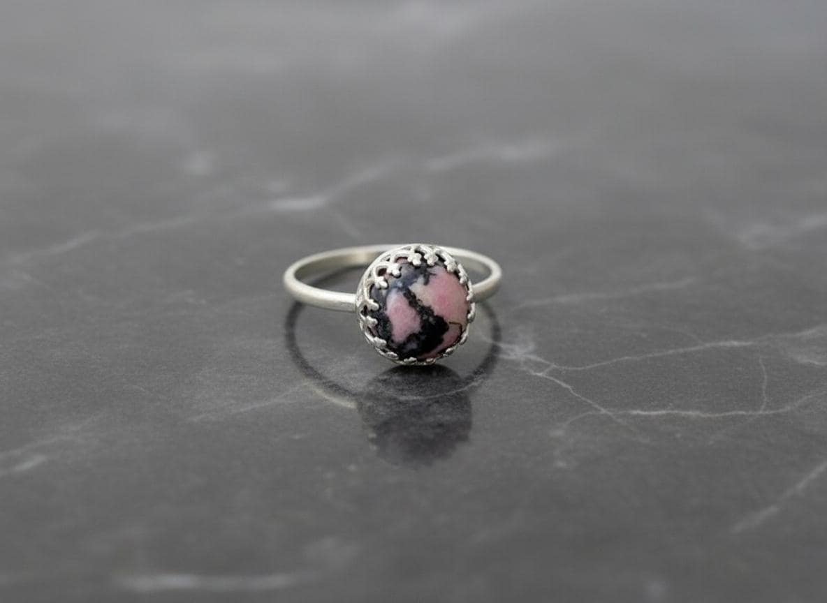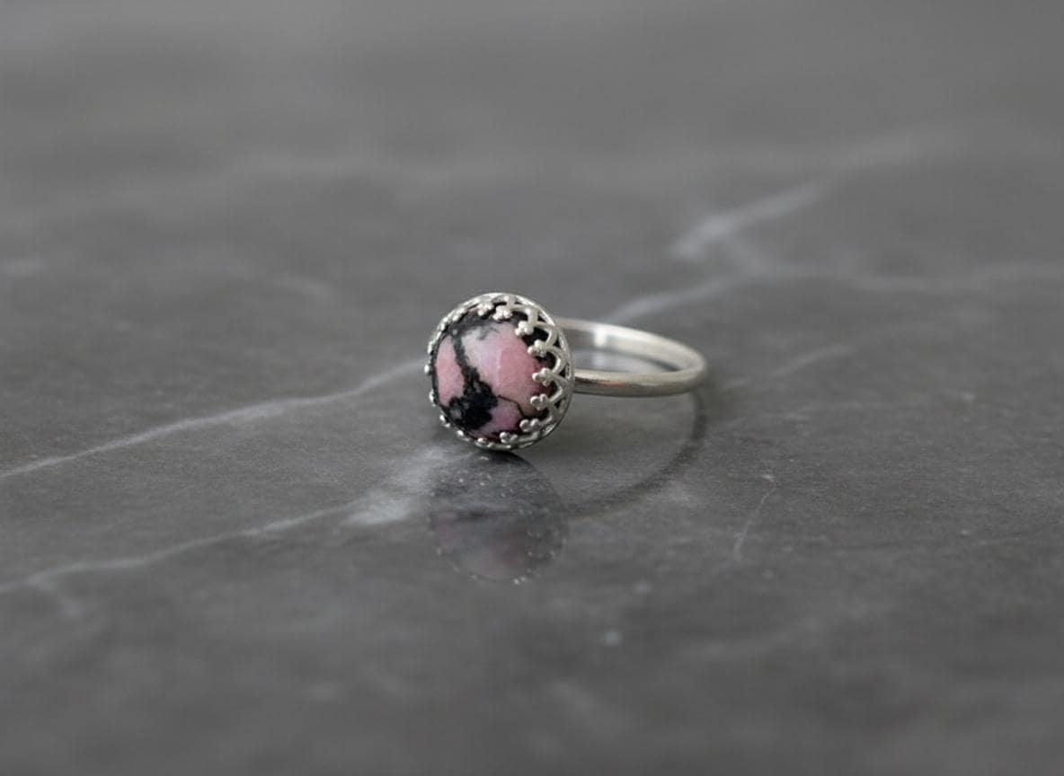 This rhodonite silver ring features a striking 8mm cabochon gemstone with natural pink and black patterns, securely set in a sterling silver crown bezel. The unique color combination of soft rose tones and deep charcoal veins makes each piece truly one-of-a-kind.