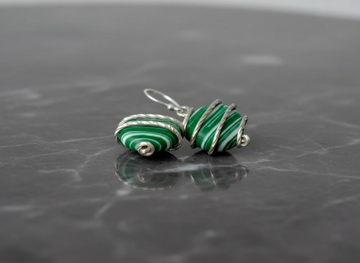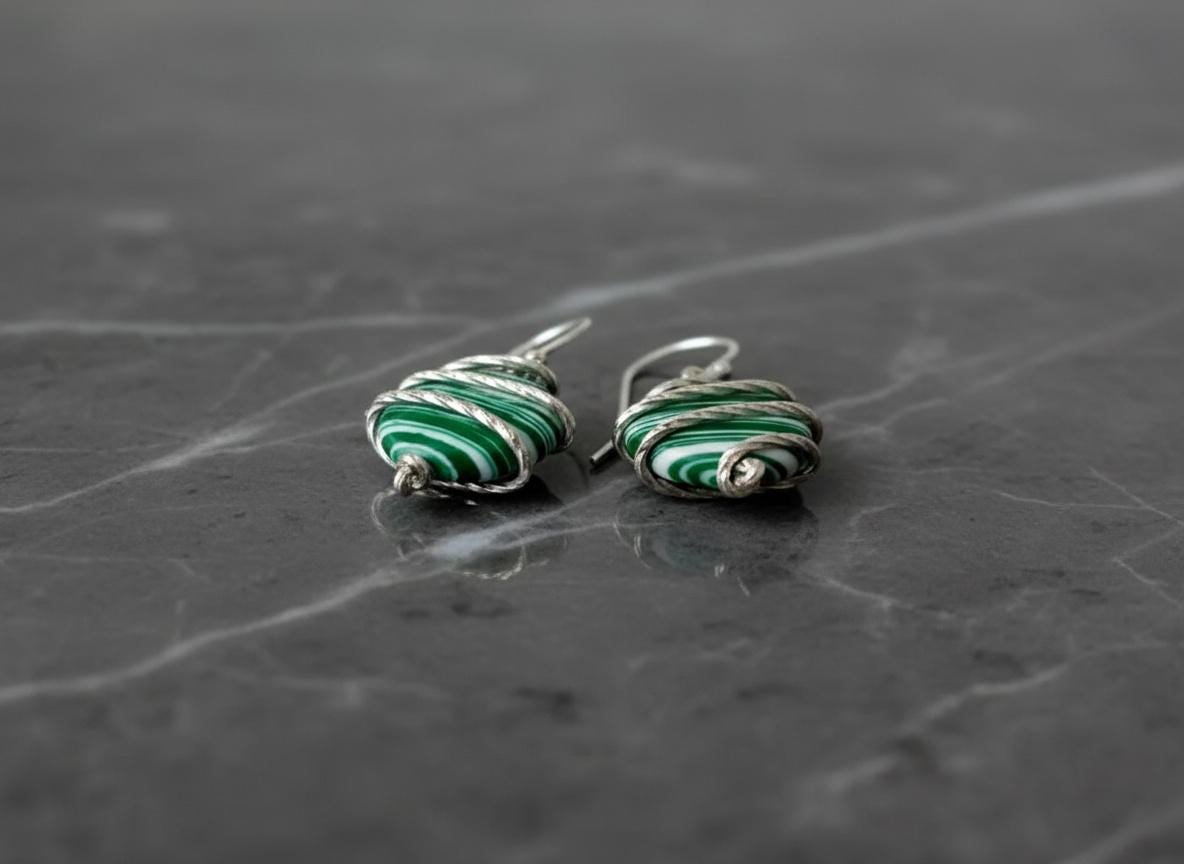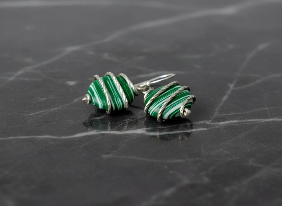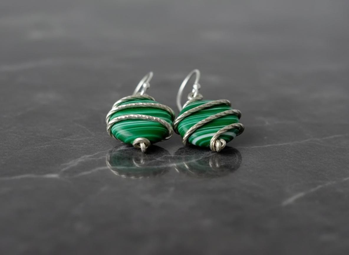 These handmade earrings feature beautiful malachite beads wrapped in textured sterling silver wire, creating a unique spiral design that enhances the stone’s striking green and white banding. The elegant drop style adds a touch of movement and charm, making them perfect for everyday wear or special occasions. Malachite is known for its rich, vibrant color and natural patterns, symbolizing transformation and protection. These artisan earrings are a thoughtful gift for gemstone lovers or a unique addition to your own jewelry collection.