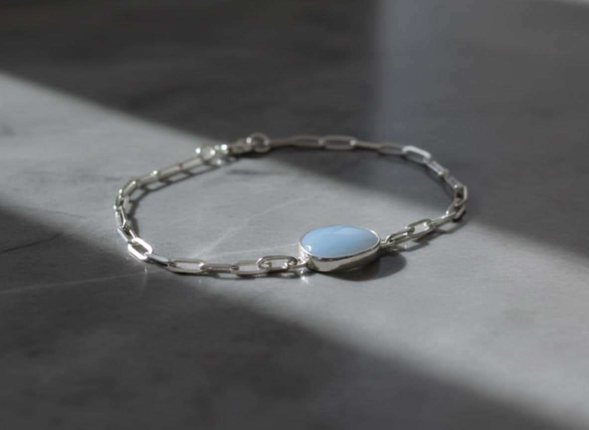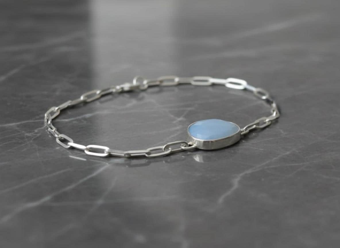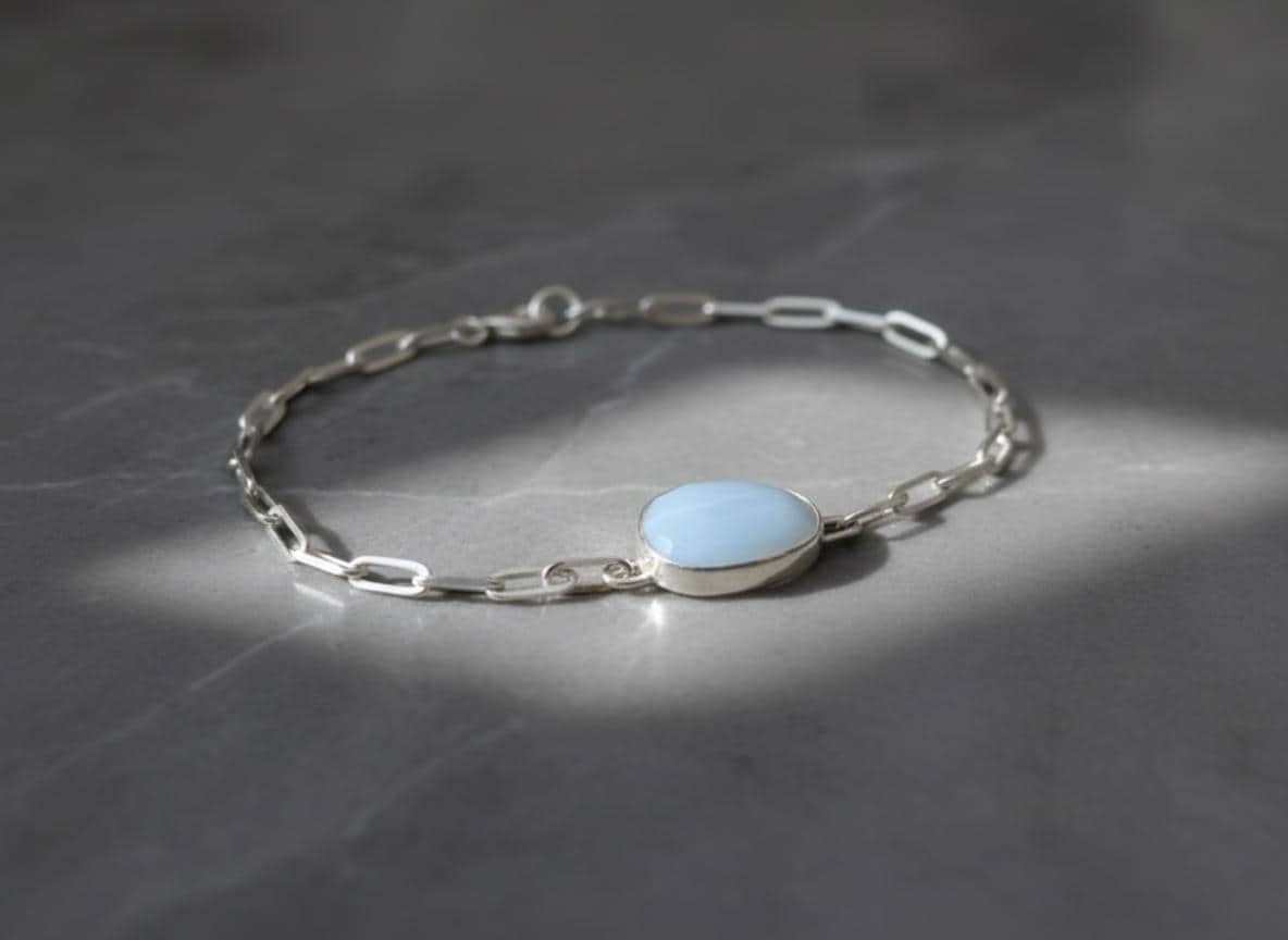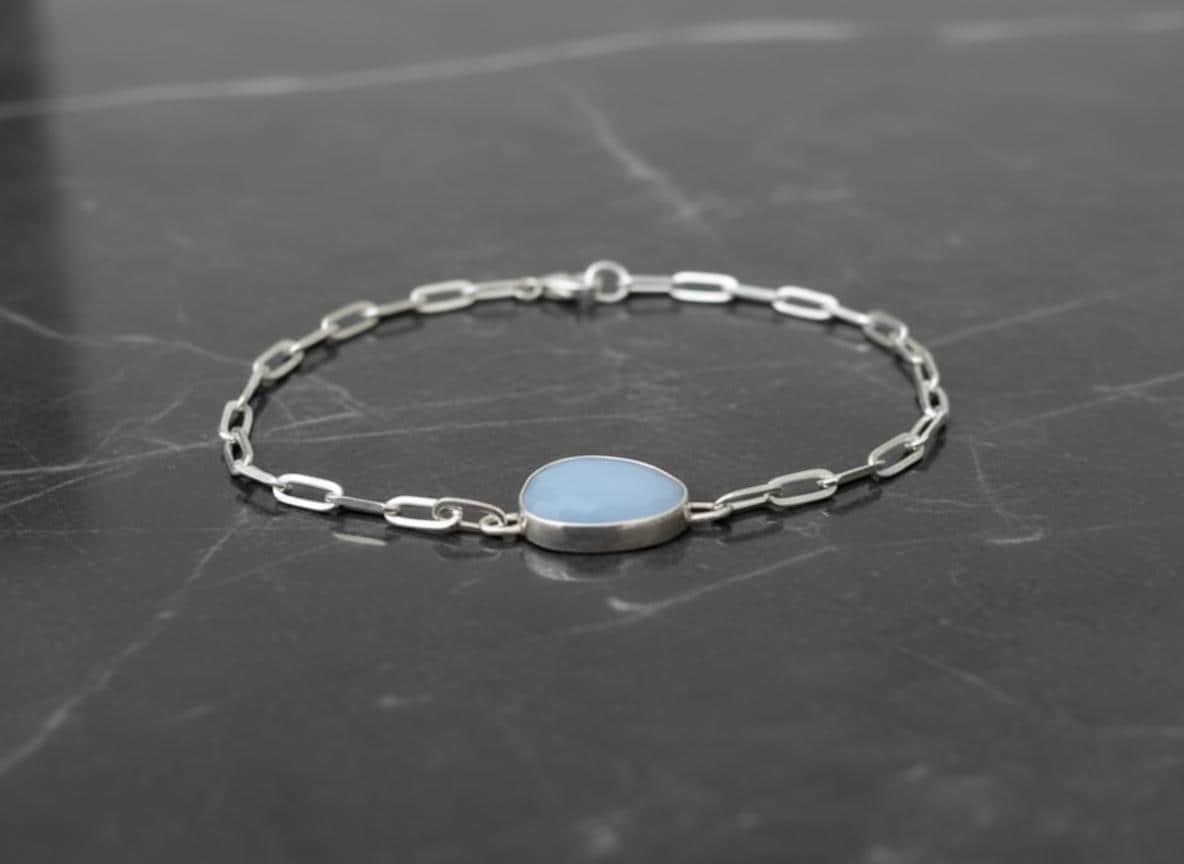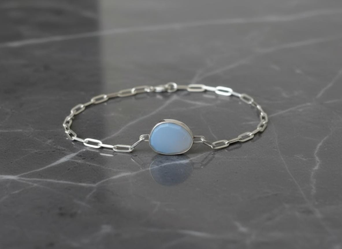This sterling silver bracelet features a soft blue opal with a rose cut glow, bezel set and centered on a delicate paperclip-style chain. The clean, modern lines of the chain contrast beautifully with the opal’s dreamy tone. Lightweight and handmade, it's perfect for everyday elegance or as a thoughtful gift.