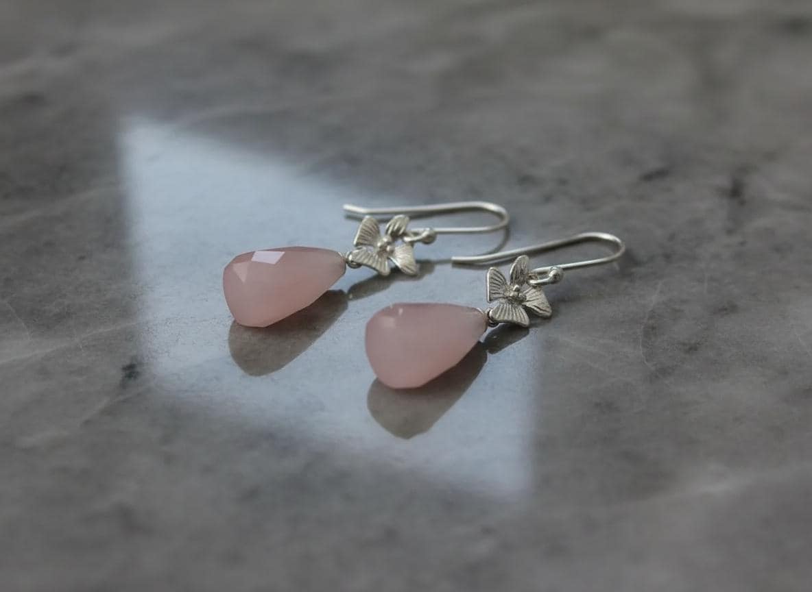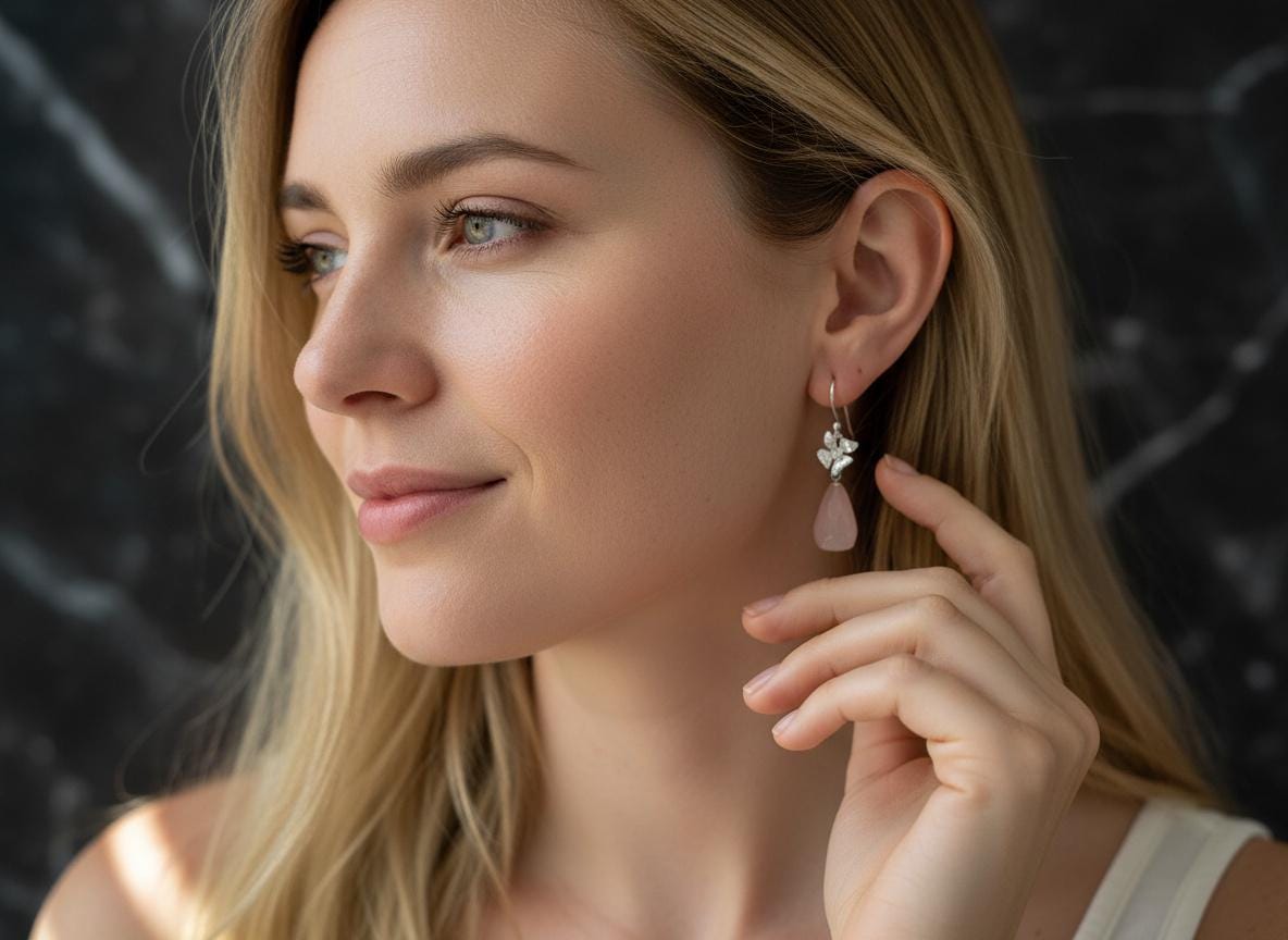 Romantic and soft like a whispered love letter, these sterling silver earrings feature faceted rose quartz teardrops suspended from delicate floral motifs. Their pale pink hue and gentle sparkle evoke a sense of calm, femininity, and grace. Lightweight and elegant, they are ideal for both everyday romance and special occasions. A subtle statement of softness and beauty.
