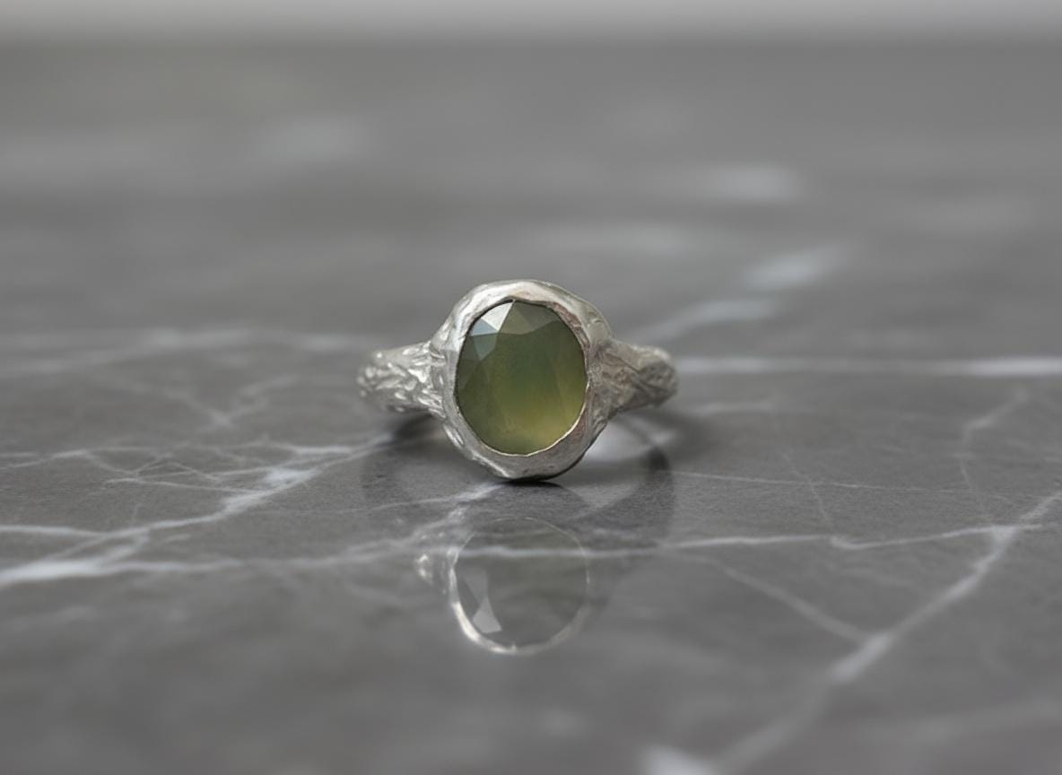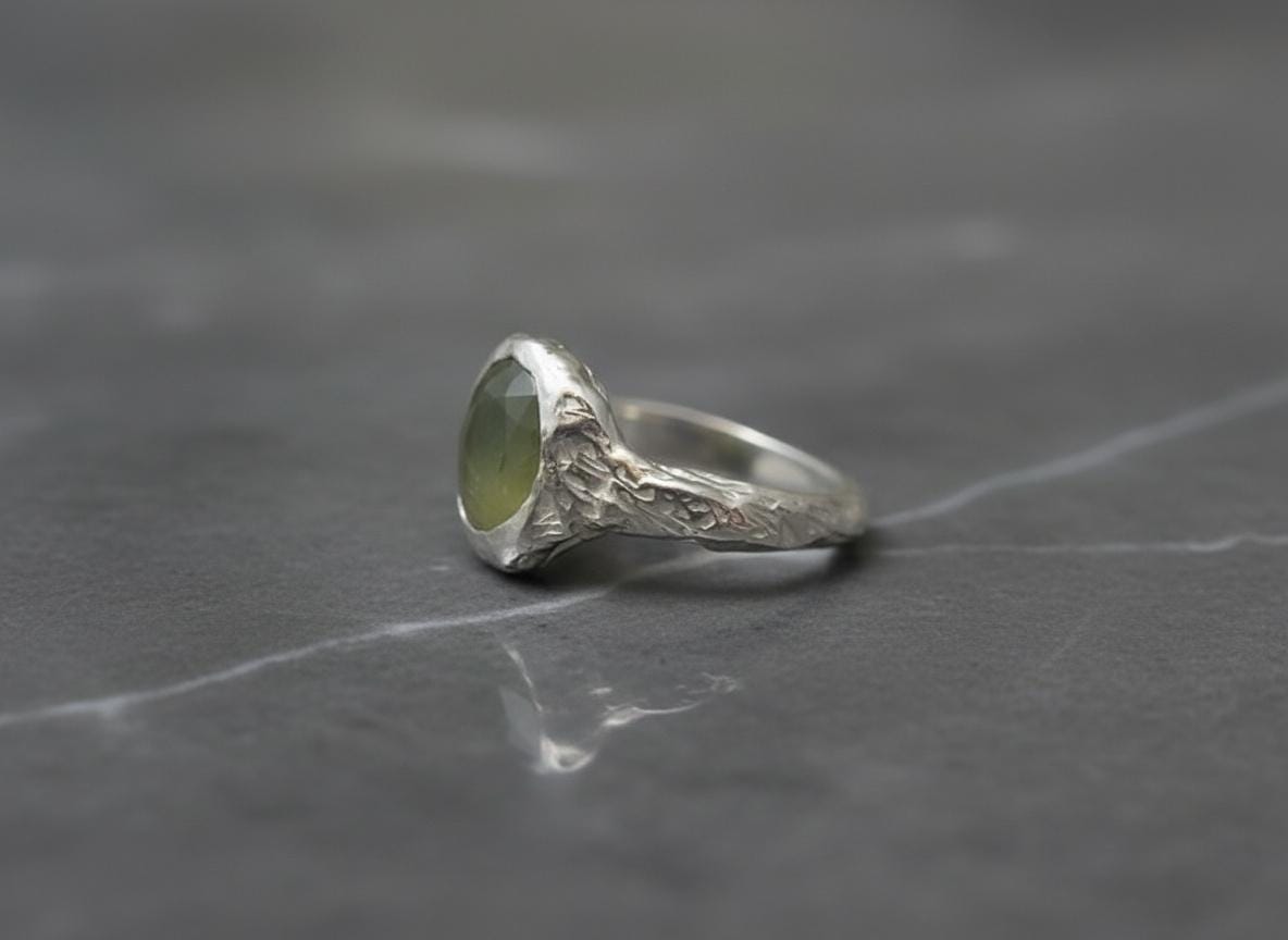 A stunning one-of-a-kind piece featuring a natural green sapphire, measuring 8x10mm and set in a sculptural sterling silver band. The rich olive-green hue of the sapphire contrasts beautifully with the organic, molten-style silver texture — a balance of elegance and raw artistry.