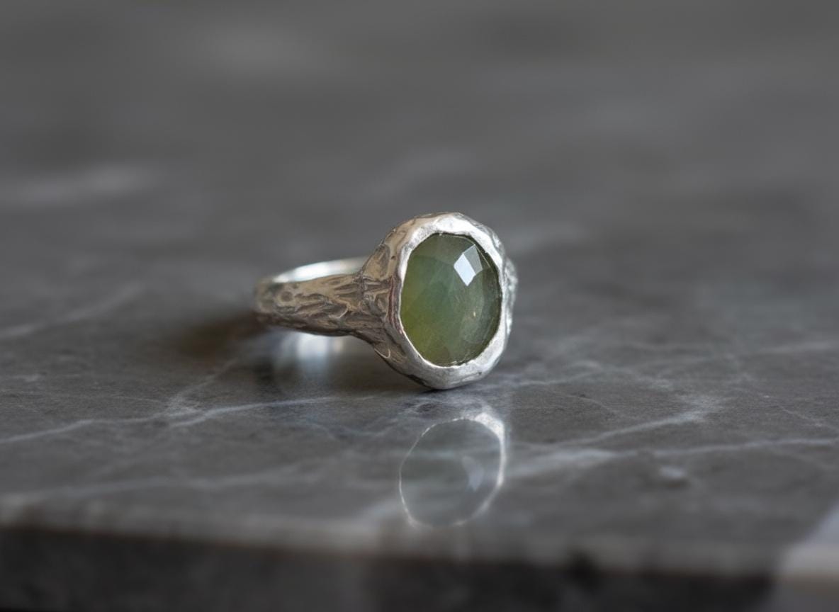 Green sapphire is known as a stone of wisdom and serenity, believed to bring balance, inner peace, and grounding energy. This ring makes a meaningful gift or a timeless addition to your jewelry collection.