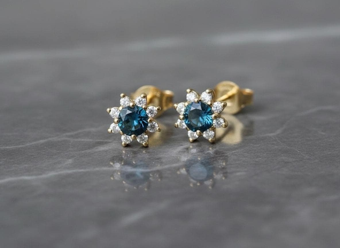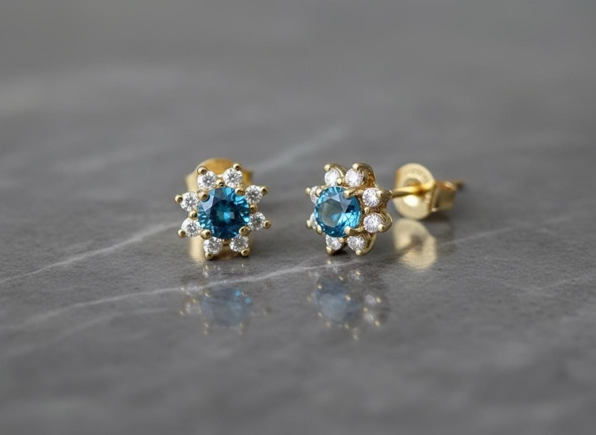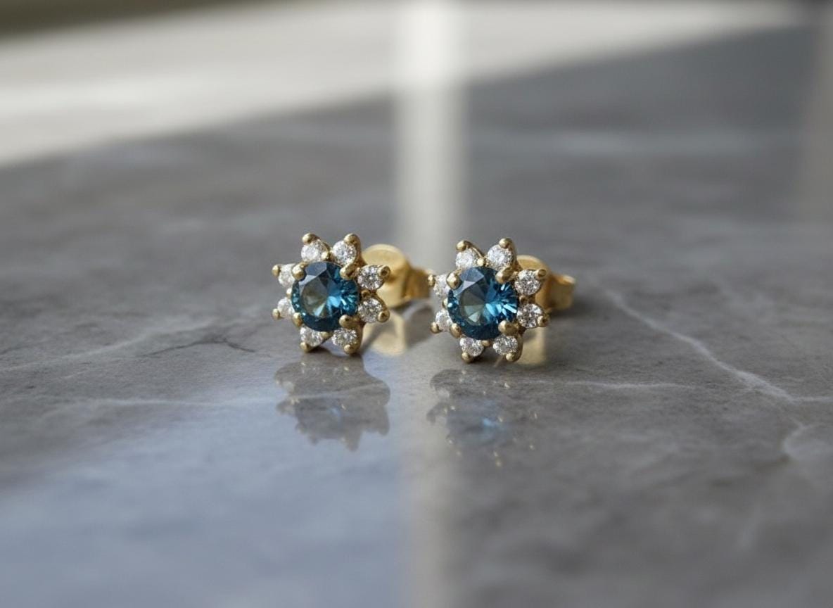 These stunning 14K gold stud earrings feature deep London Blue Topaz gemstones (4mm) surrounded by a sparkling halo of 1.8mm moissanites. The floral-inspired design brings together vivid color and bright brilliance, creating a pair of earrings that feels both timeless and full of life.