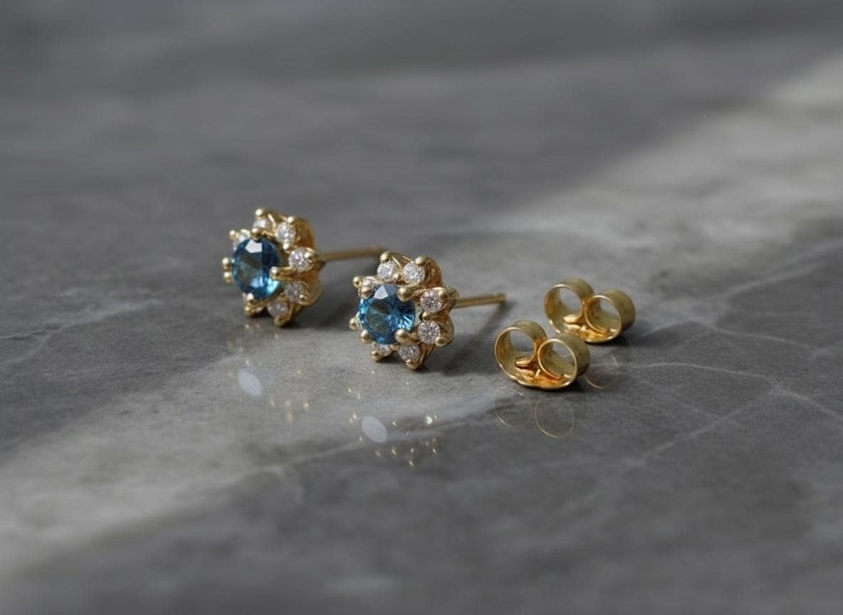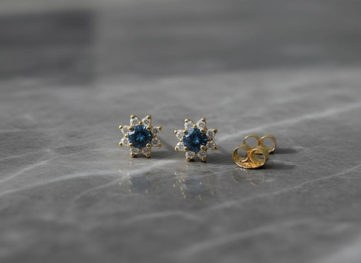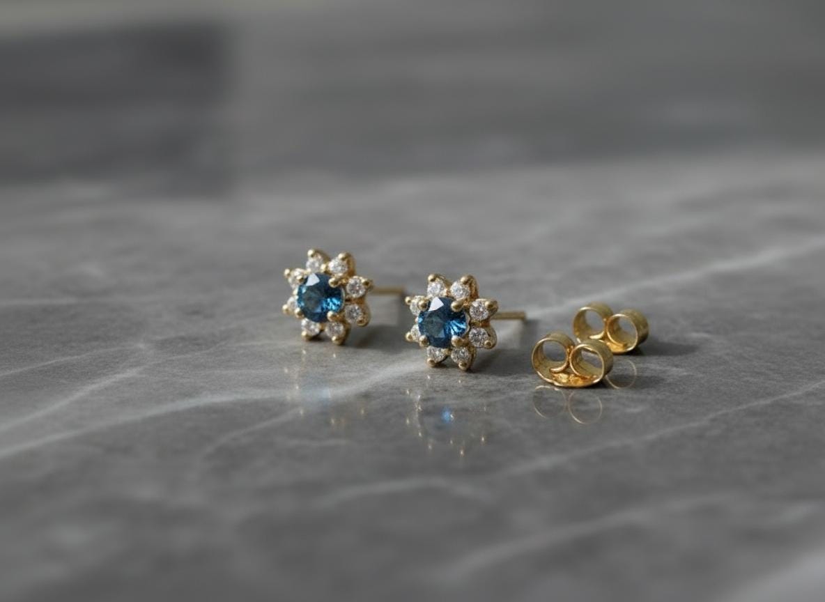 The rich blue topaz centers catch the light beautifully, while the moissanites add dazzling fire — all set in solid gold for a luxurious finish. Perfect for everyday elegance or special occasions.